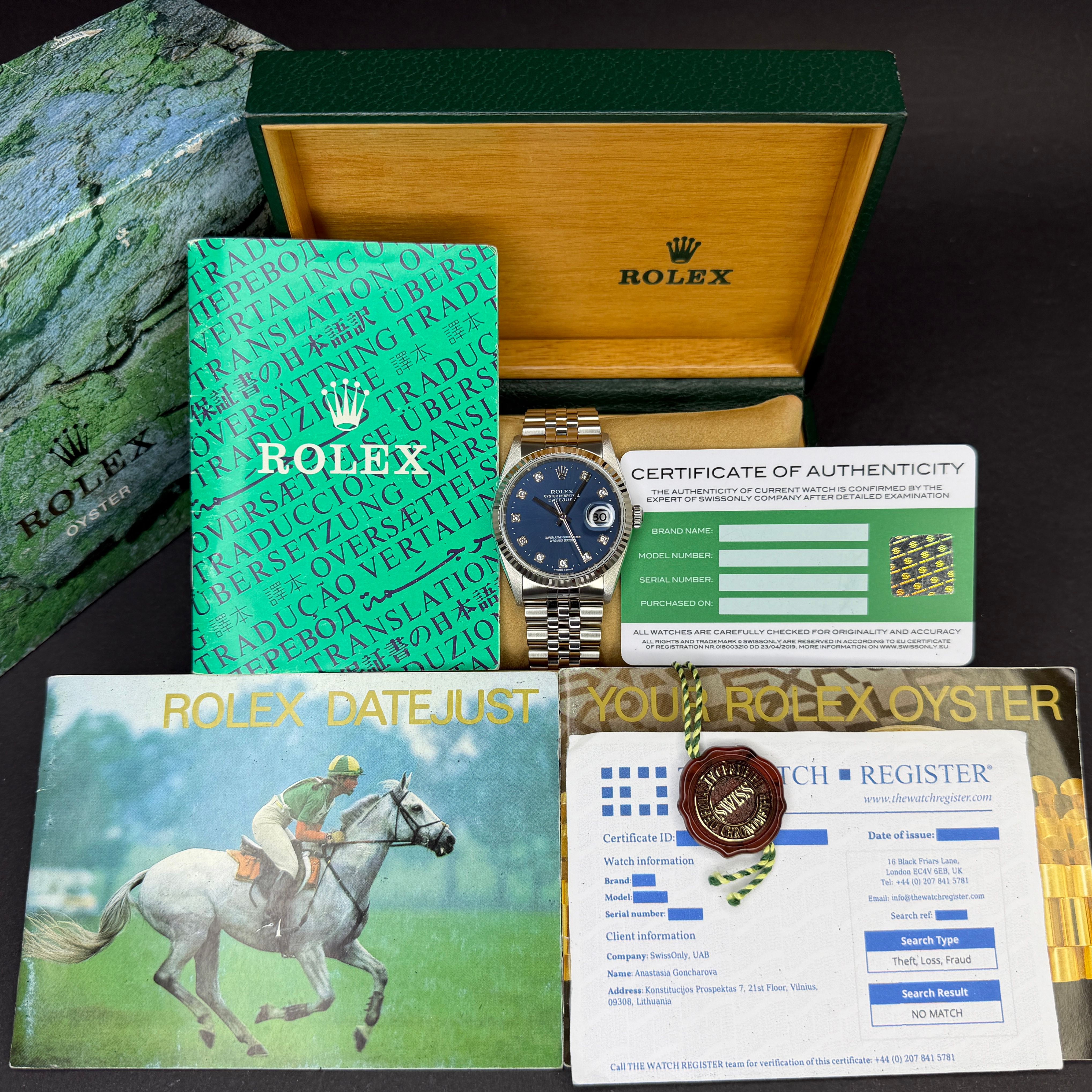 This Rolex Datejust 16234 features a Blue big diamond dial and is crafted from stainless steel, with a production year of 1999.Case No: A77XXXX