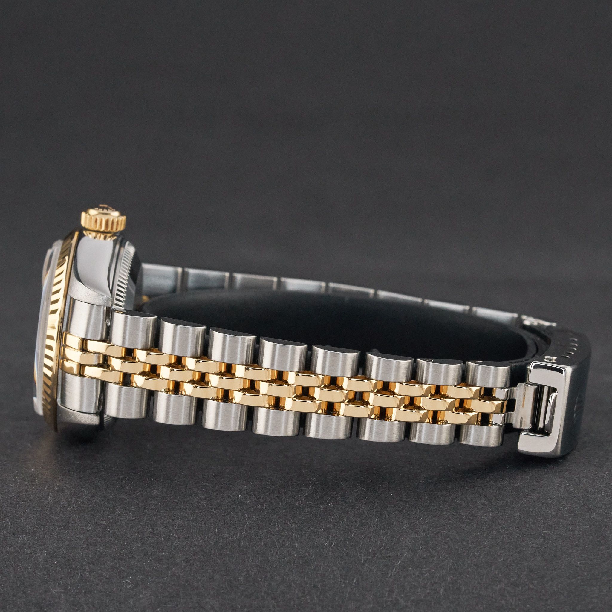 Deze Rolex Lady-Datejust 79173 heeft een champagnekleurige jubilee wijzerplaat met grote diamanten en is vervaardigd uit 18K geelgoud en roestvrij staal, met een productiejaar van 2000.