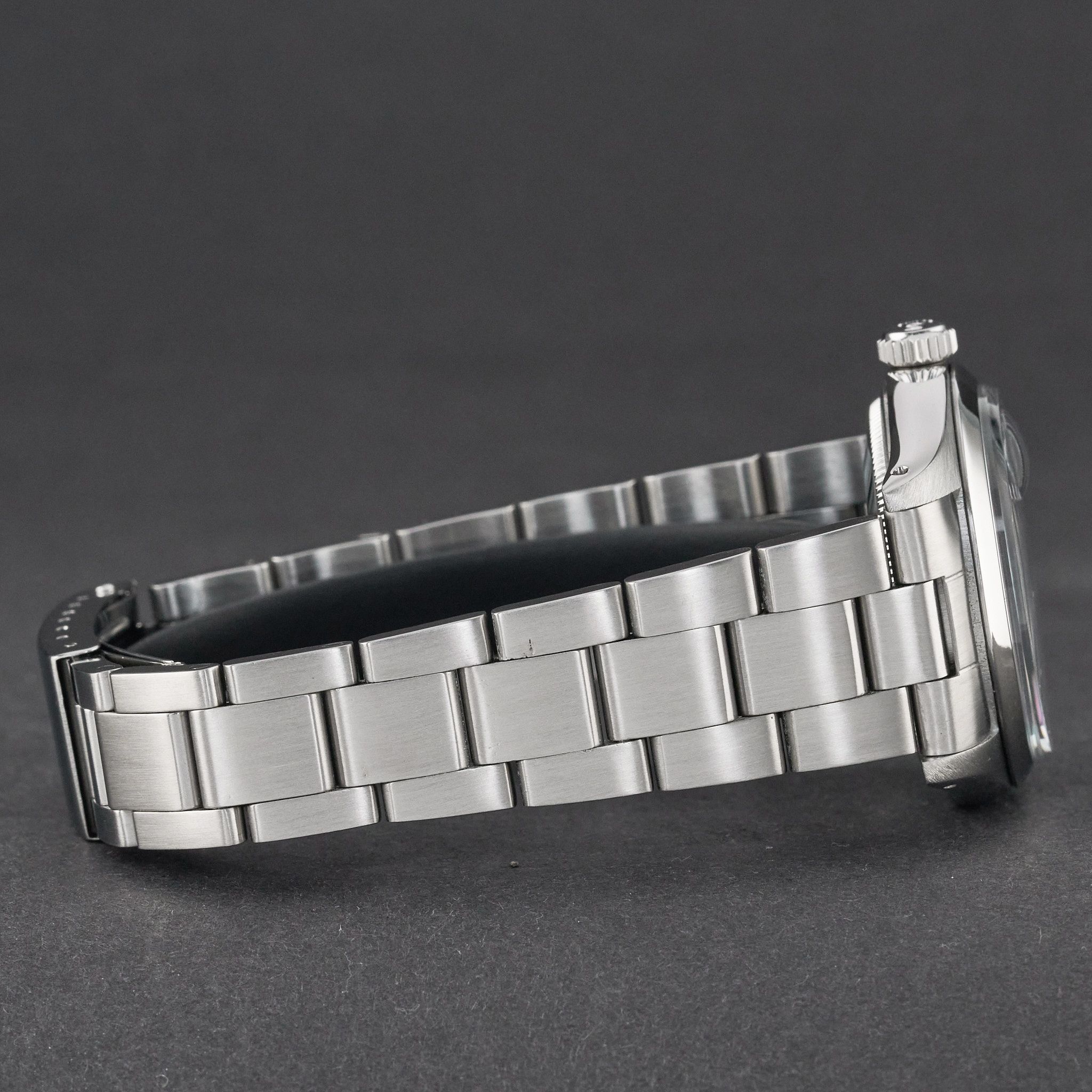 - Lichte gebruikssporen zoals haarlijntjes of kleine oppervlakkige krasjes. Kast, bezel en band behouden hun scherpe randen en oorspronkelijke vorm. Mogelijk professioneel gepolijst zonder de originele contouren aan te tasten. Mechanisch volledig functioneel.