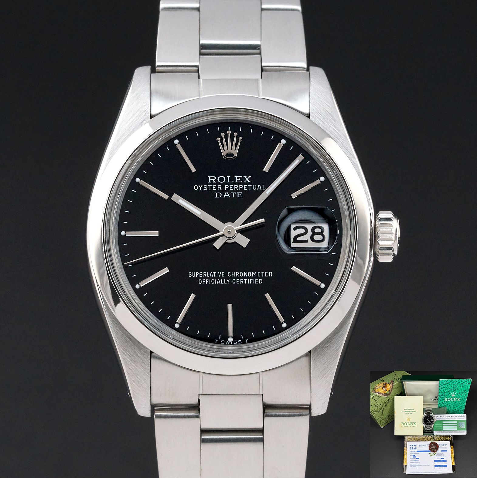 Rolex Oyster Perpetual Date Rolex Oyster Perpetual Date, 1500, 34mm, 1975, Steel, Black dial, Fullset, 1y warranty