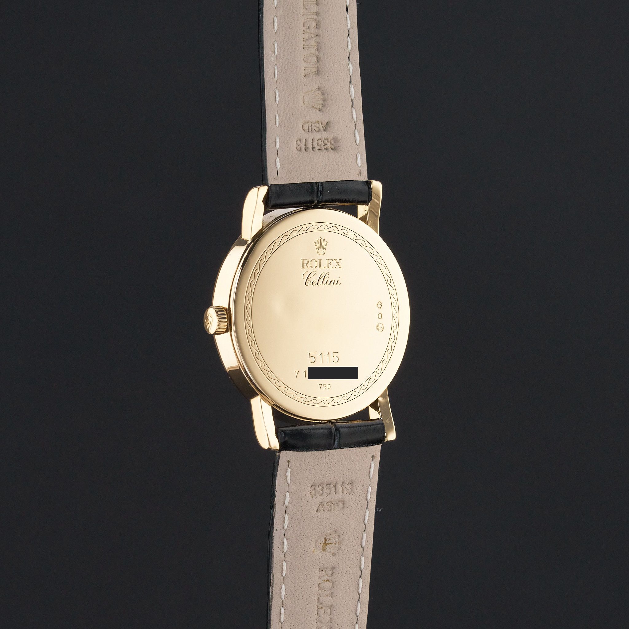 Deze Rolex Cellini 5115/8 heeft een grijze Romeinse wijzerplaat en is vervaardigd uit 18K geelgoud, met een productiejaar van 2015.