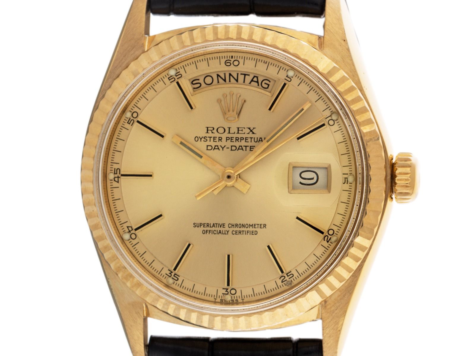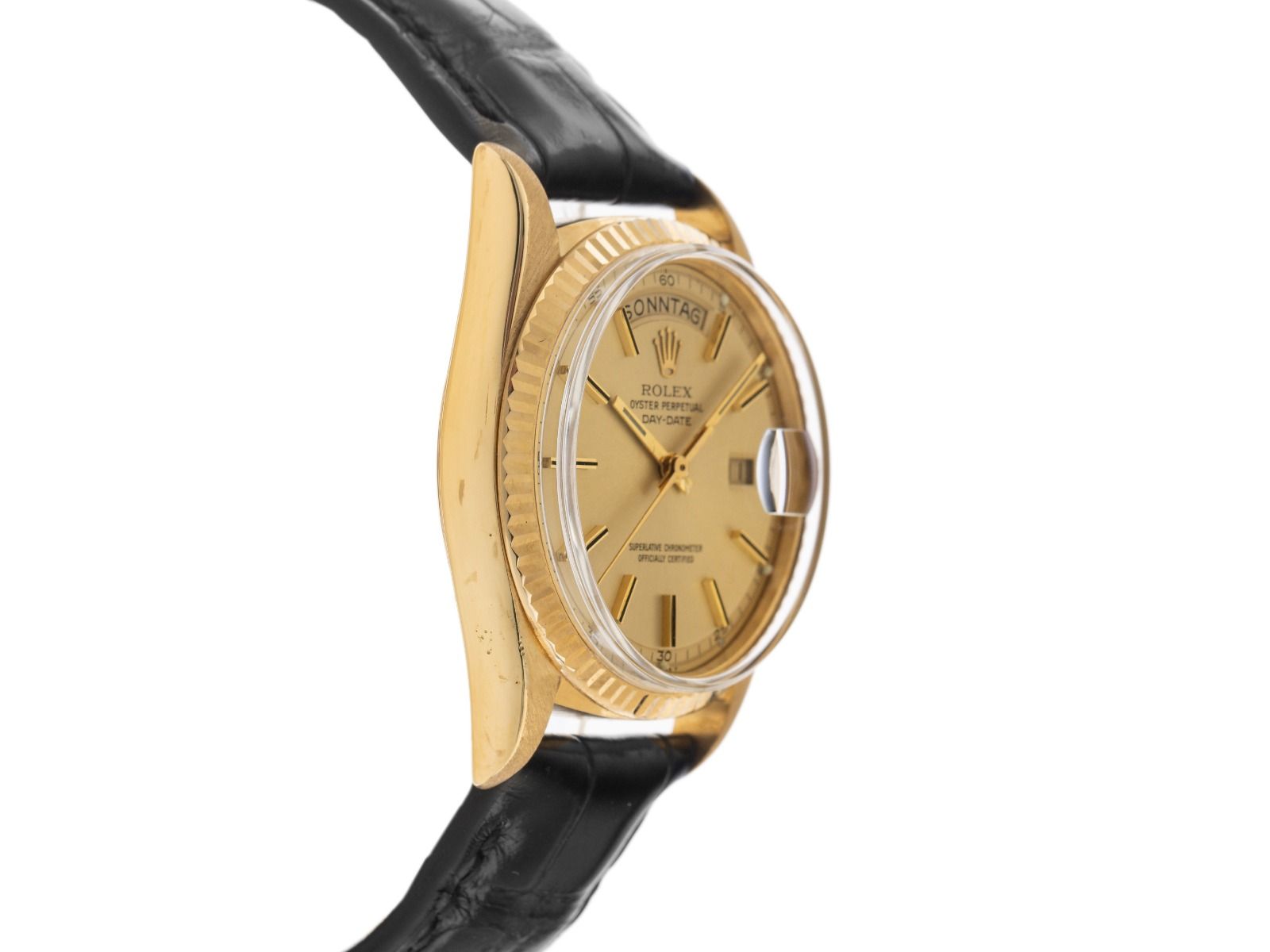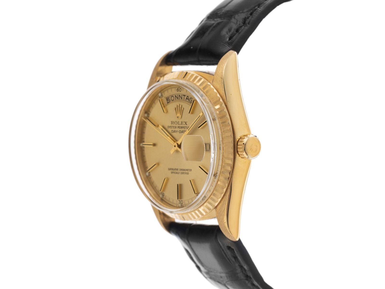 Behuizing 18kt Geelgoud gepolijst en gesatineerd, behuizingsdiameter zonder kroon 36mm, behuizingshoogte 12,9mm, lunette 18kt Geelgoud geribbeld en gepolijst. Rolex armband van zwart krokoleder met siernaad, aanzetbreedte 20mm, Rolex pin-buckle verguld met fabrikantlogo. Wijzerplaat champagnekleurig met opgezette gele gouden indexen en gele gouden wijzers, evenals gekröpter minutenring. Uurwerk Automatisch, Chronometer, Rolex Manufakturkaliber 1556 met 26 edelstenen. Weergave van uur, minuut en seconde via centrale wijzers, datumaanduiding bij 3 uur met open 6/9 (open 6 en 9 in de datumaanduiding), weekdagweergave in het Duits bij 12 uur. Gebogen plexiglas. Kroon met schroefdraad en fabrikantlogo. Achterkant 18kt Geelgoud geschroefd. Gewicht van het horloge inclusief armband 60g. Referentienummer: 1803, behuizingsnummer: 4236XXX, ID: P2480171000226H-13800, bouwjaar: 1976, artikelnummer: 10000084725. Met gangcontrole en volledige uiterlijke opfrissing van maart 2026. Originele Rolex doos met omdoos en beschrijving, leren etui, vertaalboekje, Rolex Chronometer-zegel, dag- en horregister uittreksel van februari 2026, The Watch Register certificaat / zonder vermelding (Internationale database voor verloren of gestolen horloges). Superscherpe aanbieding, investering met waardevermeerderingspotentieel, extreem zeldzaam verzamelobject. Zeer goede staat. Leveringstijd direct.