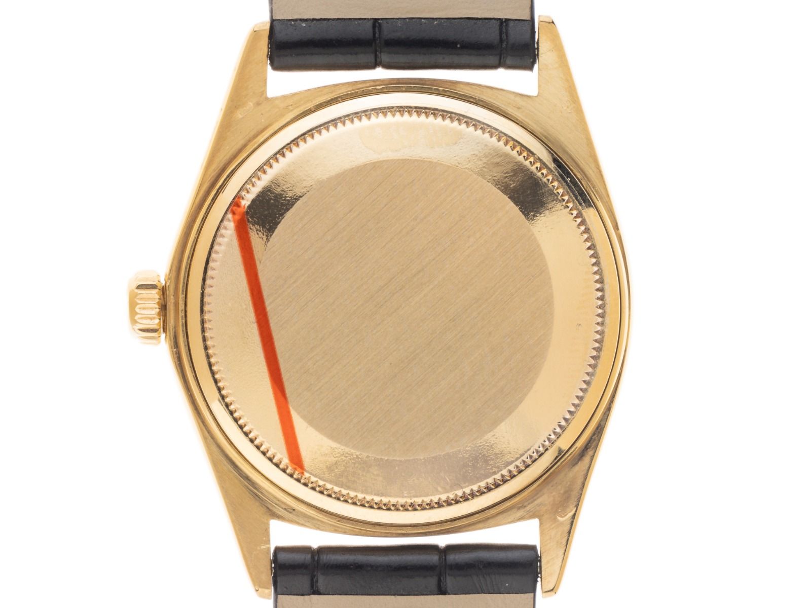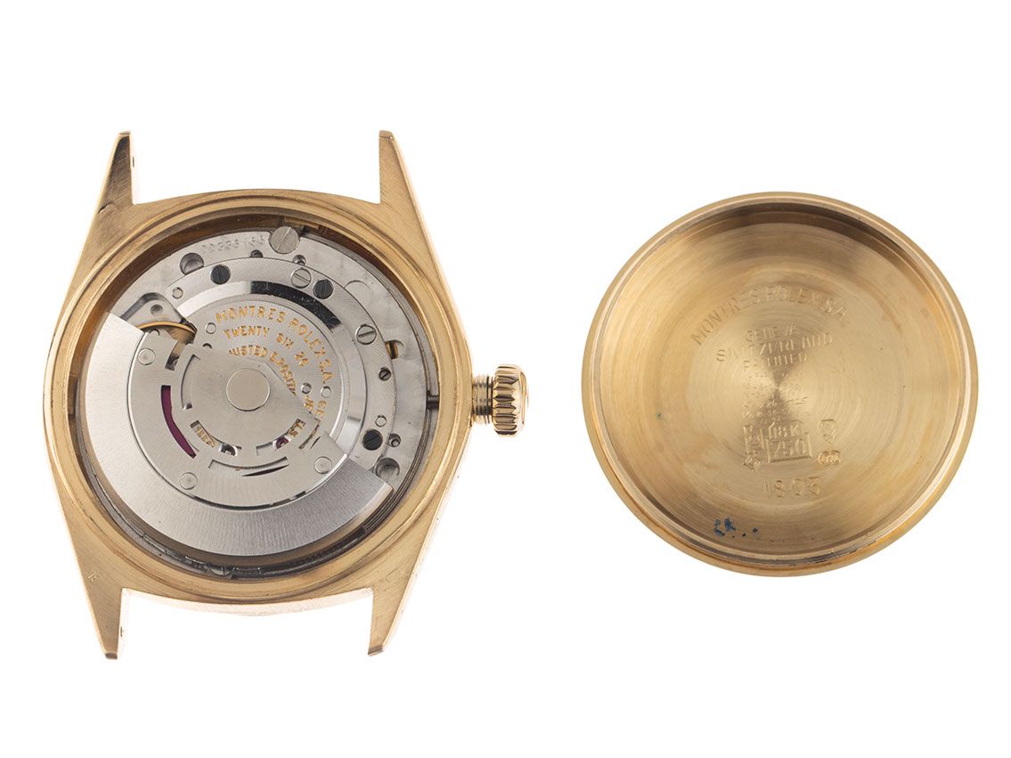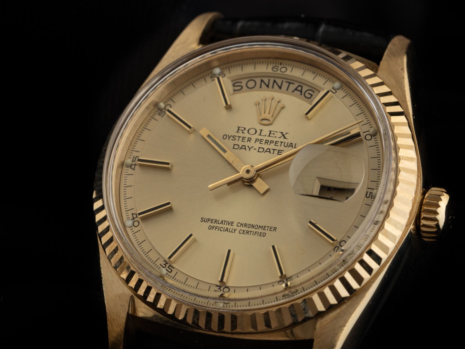 Behuizing 18kt Geelgoud gepolijst en gesatineerd, behuizingsdiameter zonder kroon 36mm, behuizingshoogte 12,9mm, lunette 18kt Geelgoud geribbeld en gepolijst. Rolex armband van zwart krokoleder met siernaad, aanzetbreedte 20mm, Rolex pin-buckle verguld met fabrikantlogo. Wijzerplaat champagnekleurig met opgezette gele gouden indexen en gele gouden wijzers, evenals gekröpter minutenring. Uurwerk Automatisch, Chronometer, Rolex Manufakturkaliber 1556 met 26 edelstenen. Weergave van uur, minuut en seconde via centrale wijzers, datumaanduiding bij 3 uur met open 6/9 (open 6 en 9 in de datumaanduiding), weekdagweergave in het Duits bij 12 uur. Gebogen plexiglas. Kroon met schroefdraad en fabrikantlogo. Achterkant 18kt Geelgoud geschroefd. Gewicht van het horloge inclusief armband 60g. Referentienummer: 1803, behuizingsnummer: 4236XXX, ID: P2480171000226H-13800, bouwjaar: 1976, artikelnummer: 10000084725. Met gangcontrole en volledige uiterlijke opfrissing van maart 2026. Originele Rolex doos met omdoos en beschrijving, leren etui, vertaalboekje, Rolex Chronometer-zegel, dag- en horregister uittreksel van februari 2026, The Watch Register certificaat / zonder vermelding (Internationale database voor verloren of gestolen horloges). Superscherpe aanbieding, investering met waardevermeerderingspotentieel, extreem zeldzaam verzamelobject. Zeer goede staat. Leveringstijd direct.