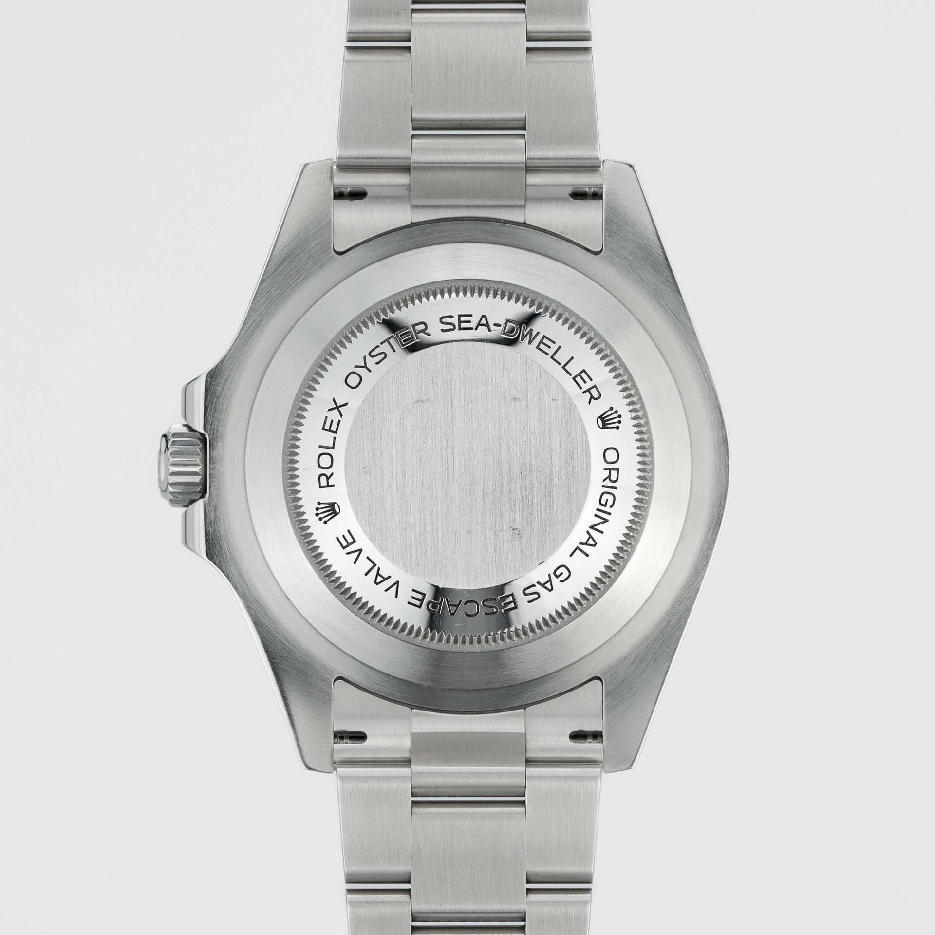 Voor de achterzijde van het horloge gebruikt Rolex een eenvoudige massieve kastdeksel (zoals trouwens in al zijn modellen) – in het geval van de Sea-Dweller heeft deze de inscripties "Rolex Oyster" en "Original gas escape valve" langs de rand. Zoals we allemaal weten, gebruikt Rolex voor zijn horloges 904L edelstaal – het verschil met de gebruikelijke 316L voor andere merken ligt in de grotere weerstand (vooral tegen zout water). Het is een algemeen bekend feit dat Rolex als fanatici kan worden beschouwd als het gaat om de staalsoorten die ze gebruiken – een groot deel van de metallurgische processen wordt intern uitgevoerd om een consistente kwaliteit van het grondmateriaal te garanderen – veel horloges zijn door onze handen gegaan, maar we kunnen absoluut categorisch zeggen dat geen enkel ander merk zoveel aandacht en moeite besteedt aan de kwaliteit van het eindproduct op het gebied van kastafwerking – en als gevolg daarvan kan een unieke kwaliteit en aanwezigheid niet anders dan worden bereikt.