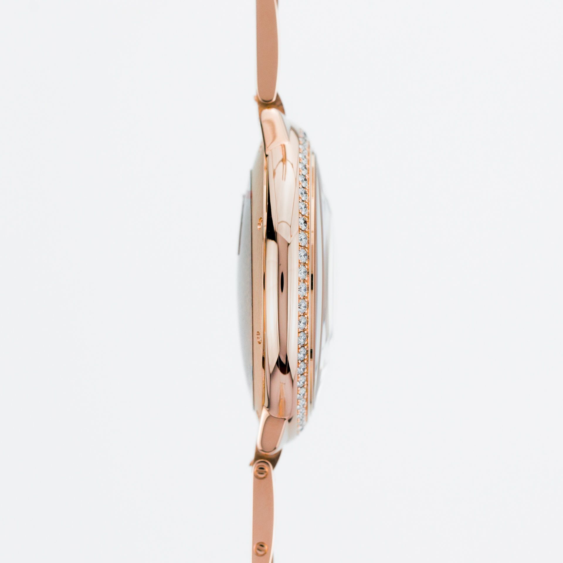 Het gepresenteerde horloge is uit de huidige modellenreeks – de 40 mm versie, aangeboden in een 18-karaats roségouden kast, met een gouden armband met een vouwsluiting. Ongetwijfeld is het meest indrukwekkende kenmerk in dit geval de rijke decoratie van het uurwerk – de lunette is bezet met 52 hoogwaardige diamanten met een totaalgewicht van 1,06 karaat.