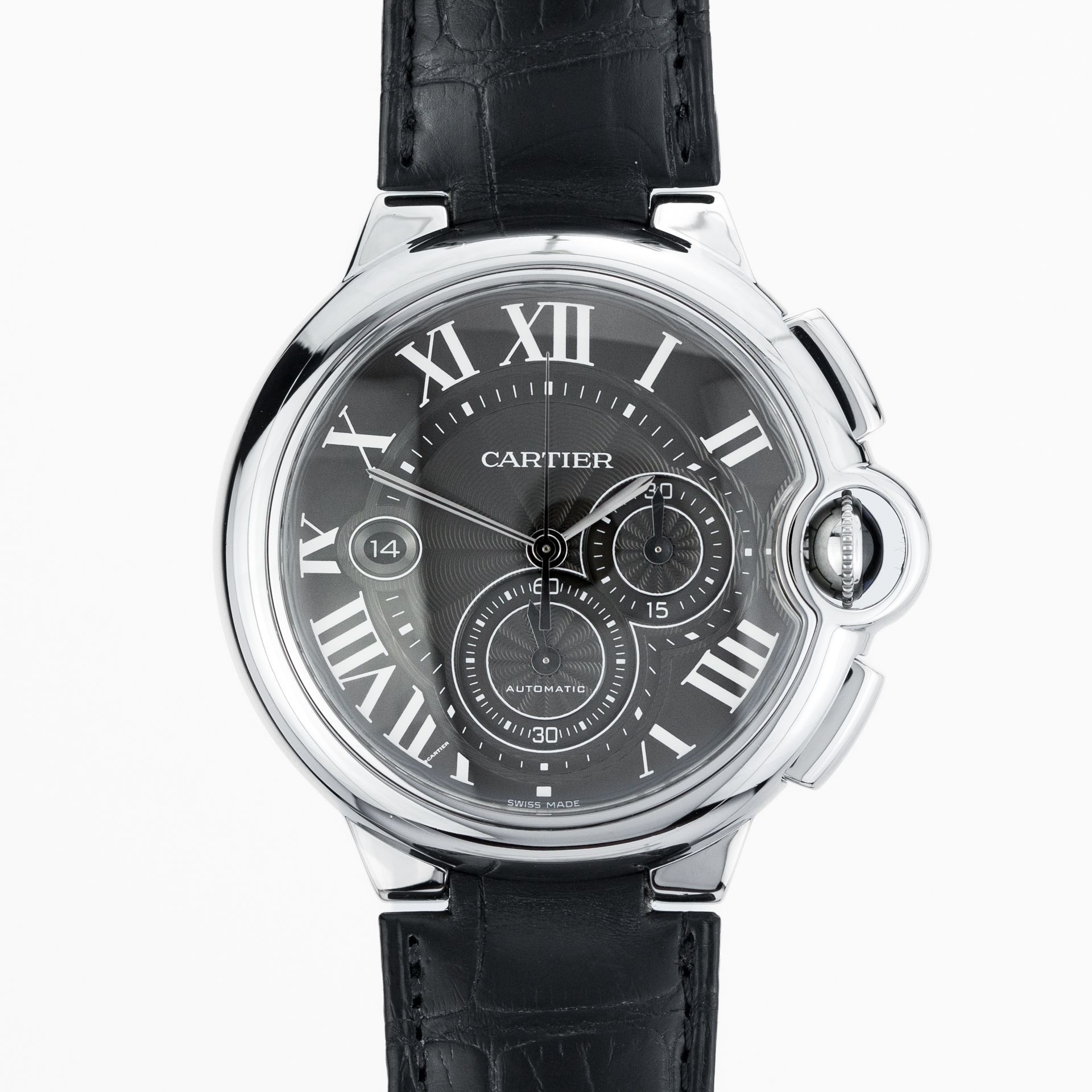 Despite the fact that Cartier is more known as a jewelry brand (perhaps one of the leading ones, by the way), its contribution to the art of watchmaking is not small. The very fact that the brand's Santos model proudly bears the title of "the first men's wristwatch" is one of the facts confirming the reputation of the brand's watchmaking division. Most of the series are created based on an exceptional story, journey, or encounters with exceptional personalities. Undoubtedly, Cartier is best known for its rectangular watches – such a survey has hardly been done, but we are sure that if one were conducted with the question "What does a Cartier watch look like?", the most prevalent answer would be "That square one with the screws." And despite the fact that for the majority of the public Cartier is Tank and Santos, this by no means exhausts the models of this brand. The “Ballon Bleu Chronograph” presented here is a representative of a no less iconic series of the brand and with the design of its crown (as if cradled in a water balloon), it has the honor of carrying the Cartier DNA no less than the other series. The series was first launched in 2007 and is one of the "youngest" in Cartier's model line-up – despite the new design, unlike other models, it carries the brand's classic design - a dial with Roman numerals, a circular inner scale, sword-shaped hands, and a sapphire cabochon proudly crowning the crown. The historical heritage, the brand's reputation, and the unconventional design make the models of the series some of the most beloved by famous historical figures and contemporary "drivers of modern taste and fashion." The presented watch is from the current model range – the 44 mm version, it is offered in a steel case, crocodile strap, steel bracelet with a deployant clasp and the contemporary size 44 mm. The case back is transparent, and beneath it lies the Cartier Calibre 8101MC – an automatic chronograph, created for the brand by JLC, with 33 jewels, a 42-hour power reserve, operating at 28,800 vibrations per hour.
