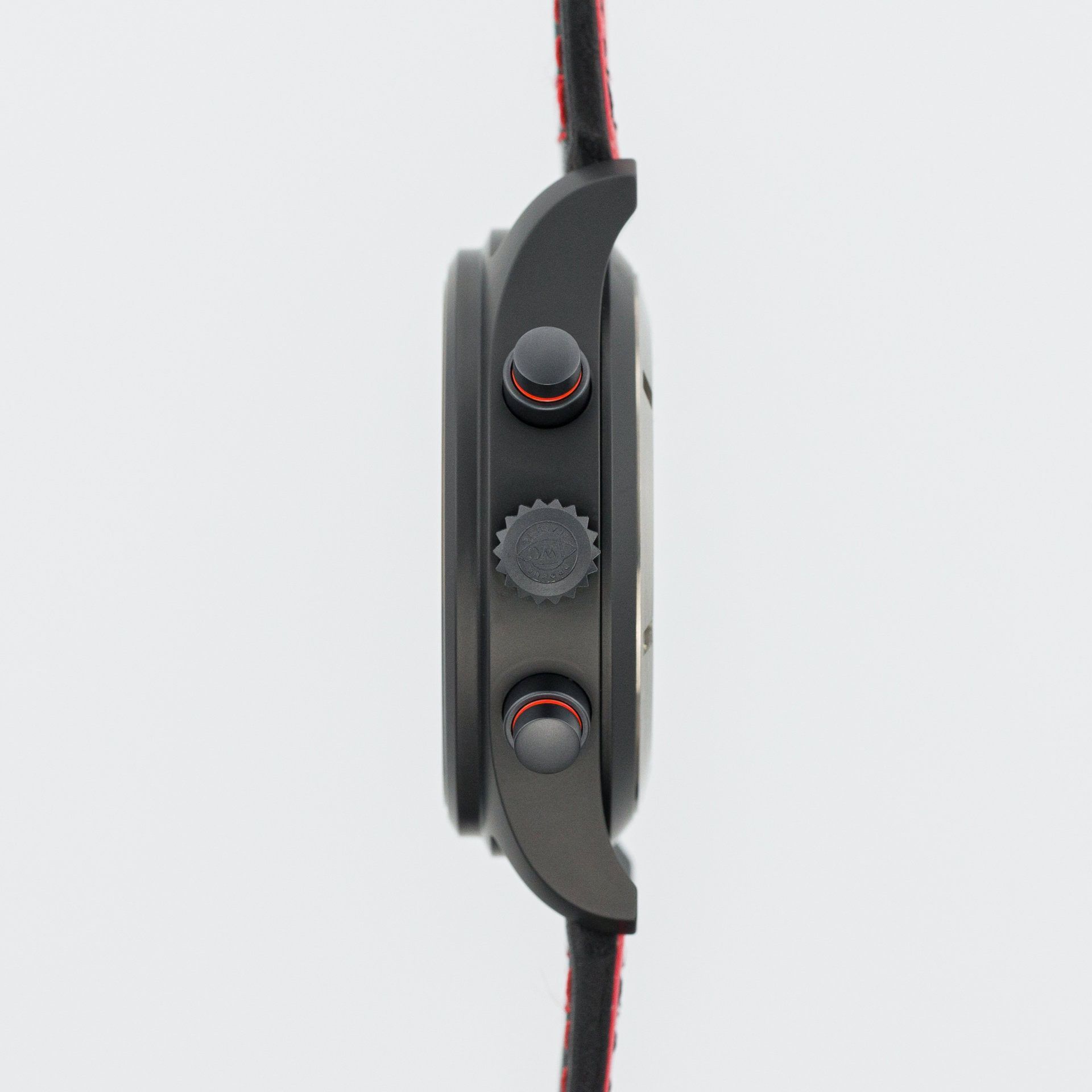 De kleur van de wijzerplaat is matzwart, en de vorm van de wijzers doet denken aan de bladen van een vliegtuigpropeller. Het horloge is voldoende groot en heeft een instrumenteel ontwerp – gemaakt voor de hand van een sterke man. De behuizing is keramisch en dit zorgt voor comfort en lichtheid, en de leesbaarheid van het horloge is een van de beste van alle tijdpieces die door onze handen zijn gegaan. De drukknoppen en de kroon zijn gemaakt van Ceratanium – een materiaal dat door het merk is ontwikkeld en gepatenteerd, dat de lichtheid en sterkte van titanium combineert met de hardheid en krasbestendigheid van keramiek.