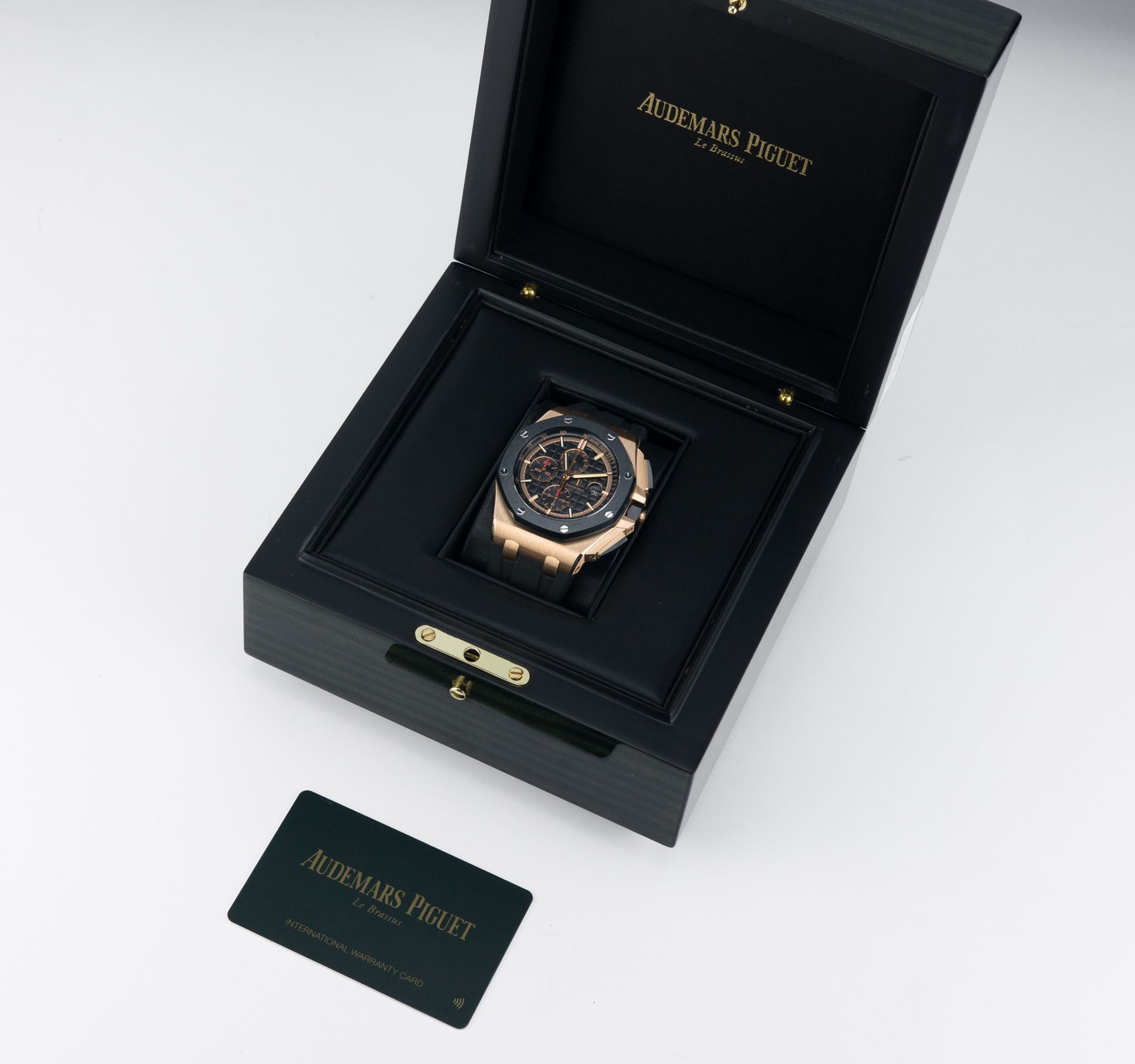 In 2011, in lijn met de trend voor grotere kasten en maten, presenteerde het merk de AP ROO 26400 op de SIHH. Dit model werd automatisch zeer gewild door alle fans van het merk en stelde de fabrikant in staat om deze kast permanent in zijn assortiment op te nemen tot op de dag van vandaag. In tegenstelling tot de 42-millimeter versie, wordt dit horloge niet aangeboden in een breed scala aan modellen en wijzerplaattypes, en het model dat vandaag wordt gepresenteerd is het meest herkenbare met een witte wijzerplaat en zwarte subdials. Een jaar later, in 2012, verscheen de massieve roségouden versie, en 5 jaar daarna het model dat vandaag wordt gepresenteerd – het belangrijkste verschil is dat de kast van 18-karaats roségoud is, en de wijzerplaat zwart met zwarte subdials.