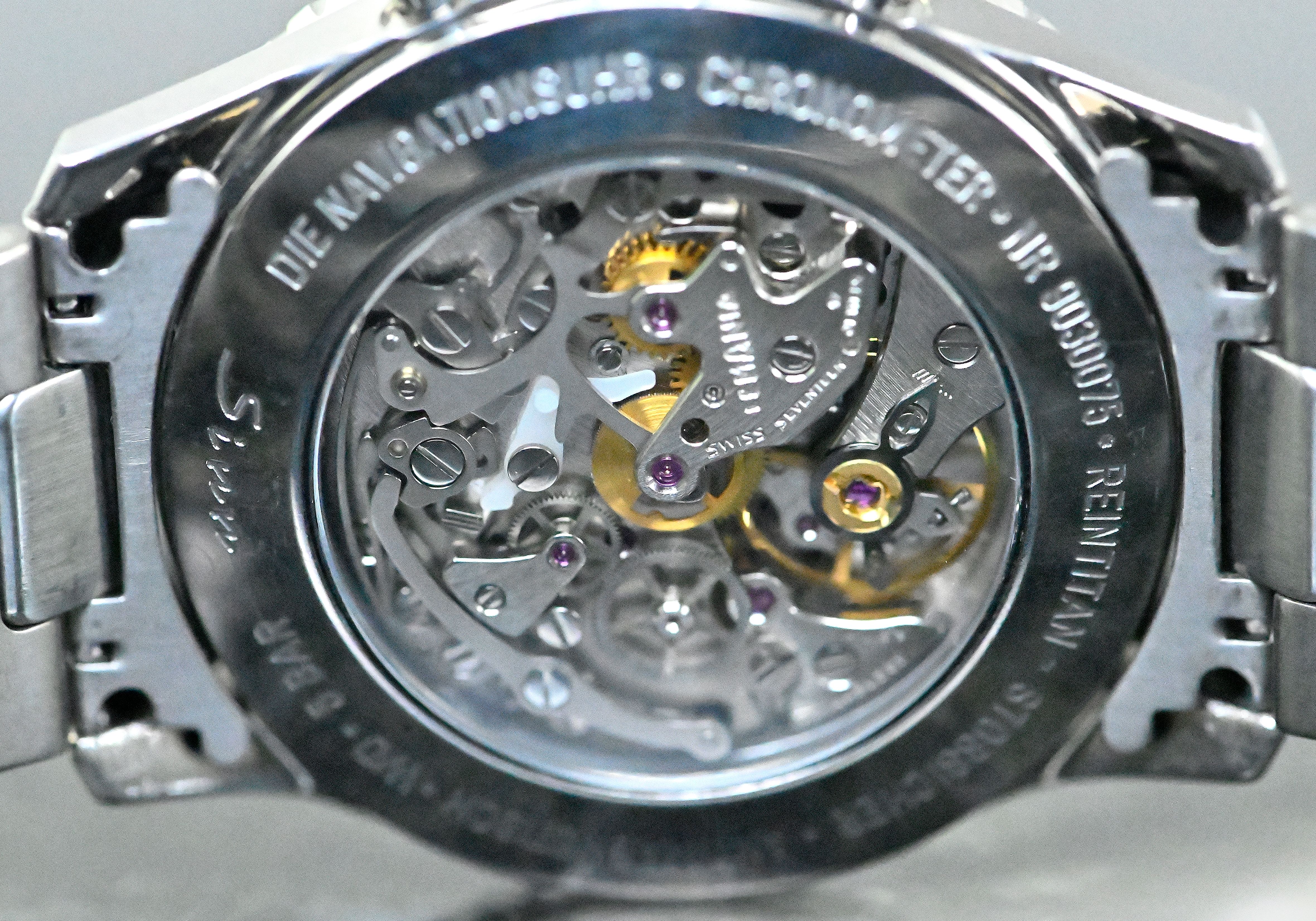 Very rare Vintage Sinn Navigation Chronograph / Navigation watch | reference 903 | in titanium | Lemania hand-wound caliber 1873 | very special and extremely rare version of the Sinn 903, we are not aware of any other watch in the world with this blue / purple dial and 24-hour scale | striking and magnificent appearance | original Sinn titanium bracelet with original folding clasp featuring an integrated bracelet extension | total inner circumference including the watch is approximately 17.3 cm without the bracelet extension in the clasp | very beautiful and unpolished original condition | a true dream for every Vintage and Sinn enthusiast!