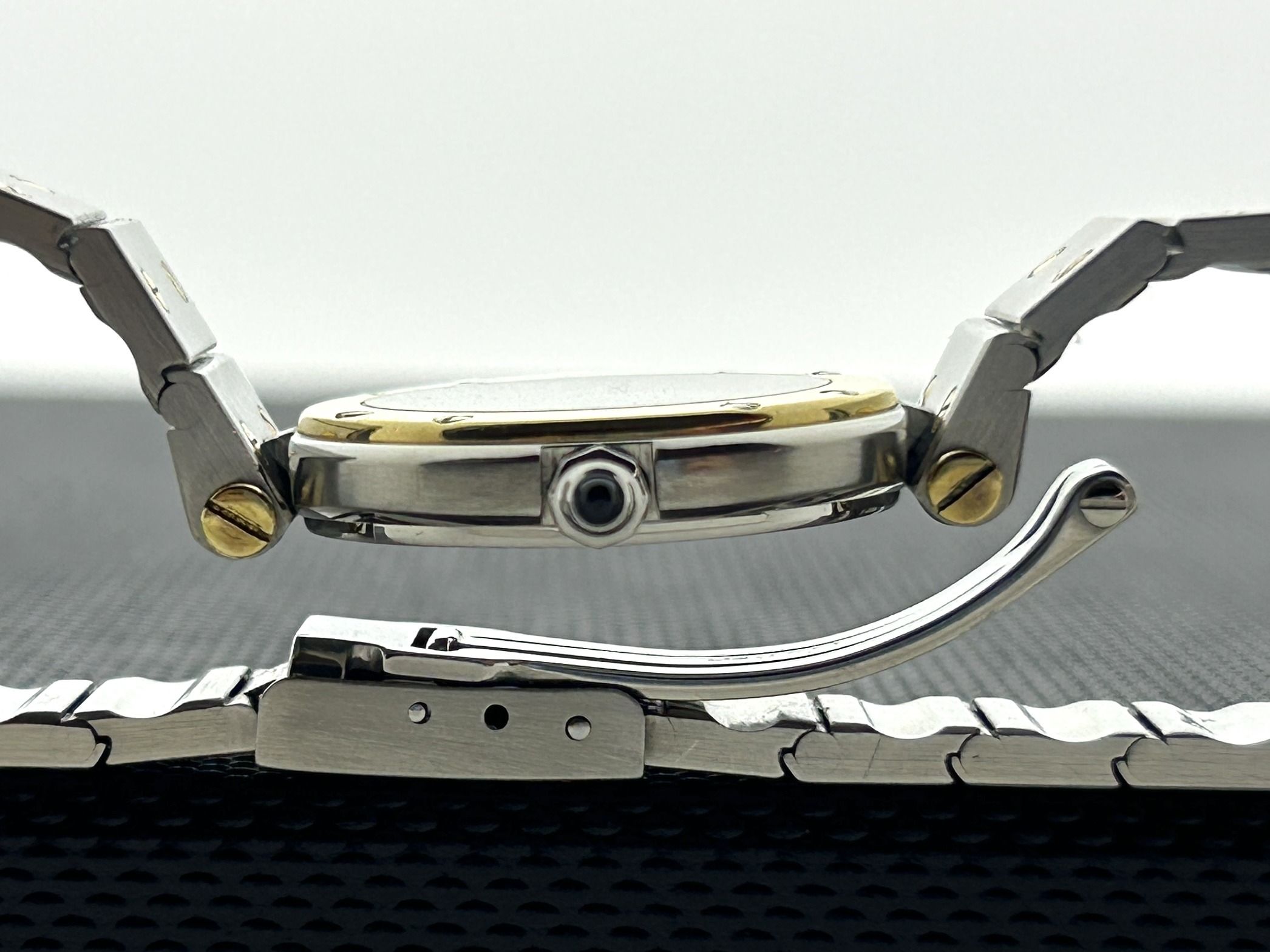 - Lichte gebruikssporen zoals haarlijntjes of kleine oppervlakkige krasjes. Kast, bezel en band behouden hun scherpe randen en oorspronkelijke vorm. Mogelijk professioneel gepolijst zonder de originele contouren aan te tasten. Mechanisch volledig functioneel.