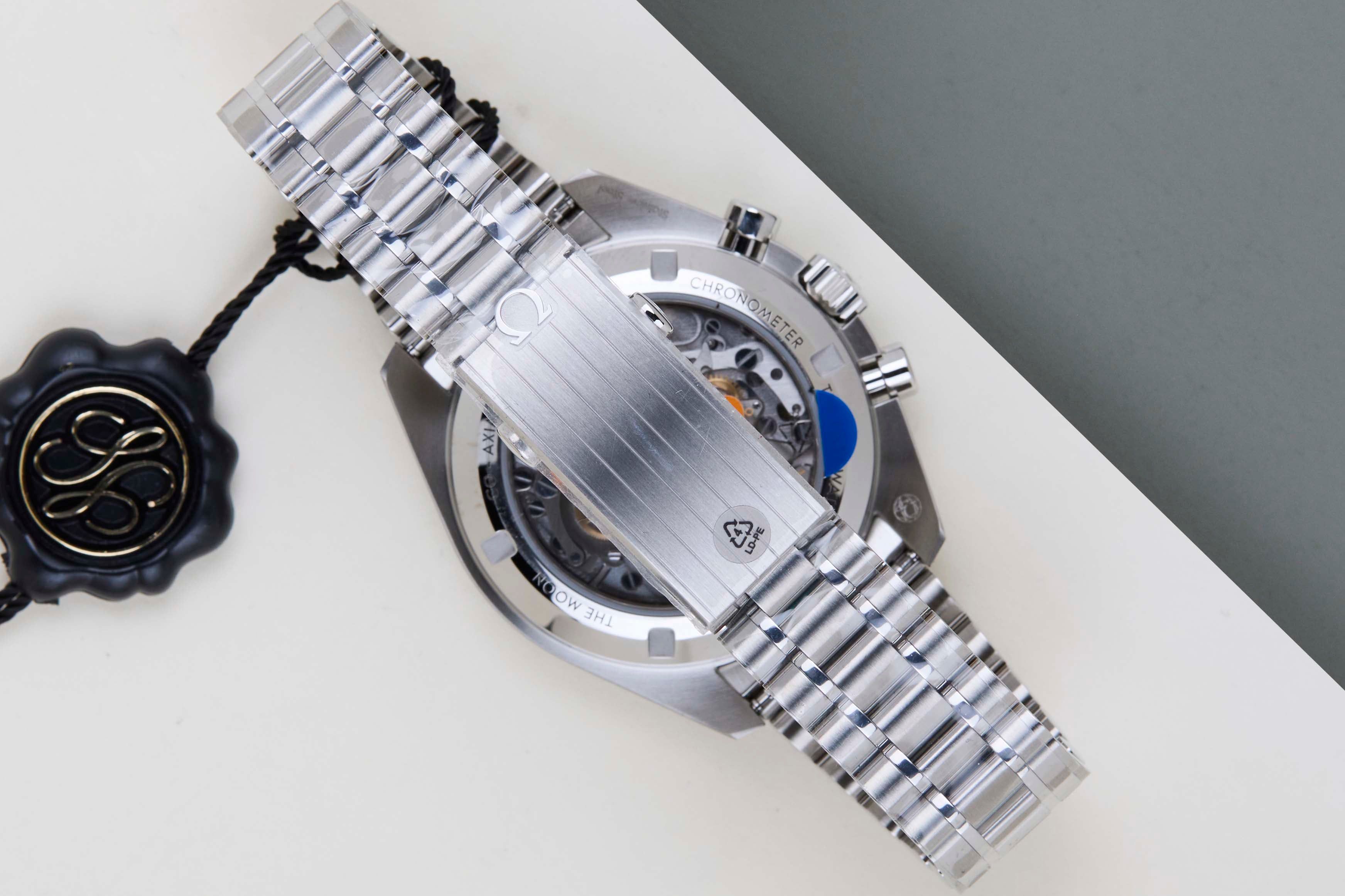 Dit Omega Speedmaster Professional heeft een open kastdeksel. Deze transparante achterkant stelt de drager in staat om het ingewikkeld vervaardigde mechanisme binnenin het horloge te bewonderen. Een open kastdeksel komt alleen voor bij de Omega Speedmaster Professional met het saffierglas.