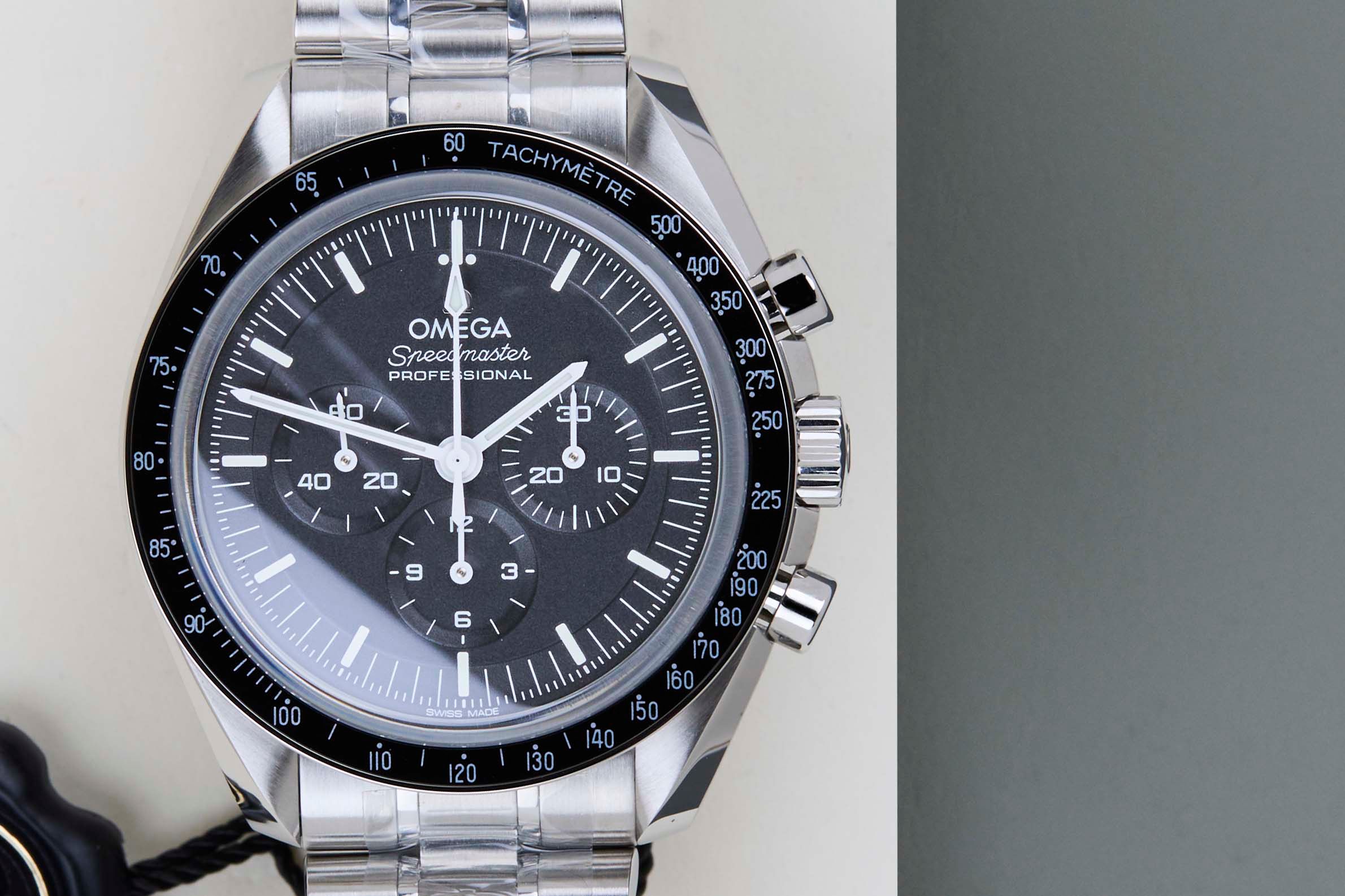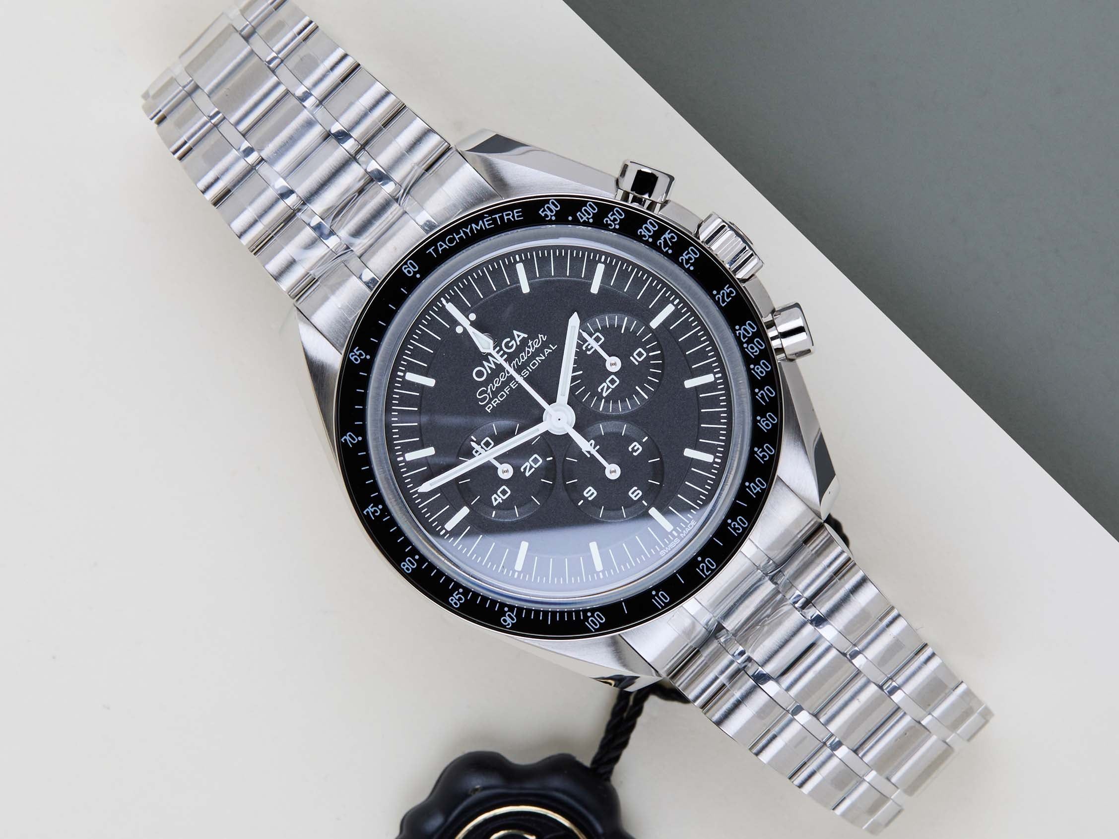 De Speedmaster Moonwatch Professional heeft een roestvrijstalen kast met een diameter van 42 mm en een zwarte tachymeter bezel. De chronograaf wijzerplaat toont drie sub-dials voor het meten van verstreken tijd, inclusief seconden, minuten en uren.