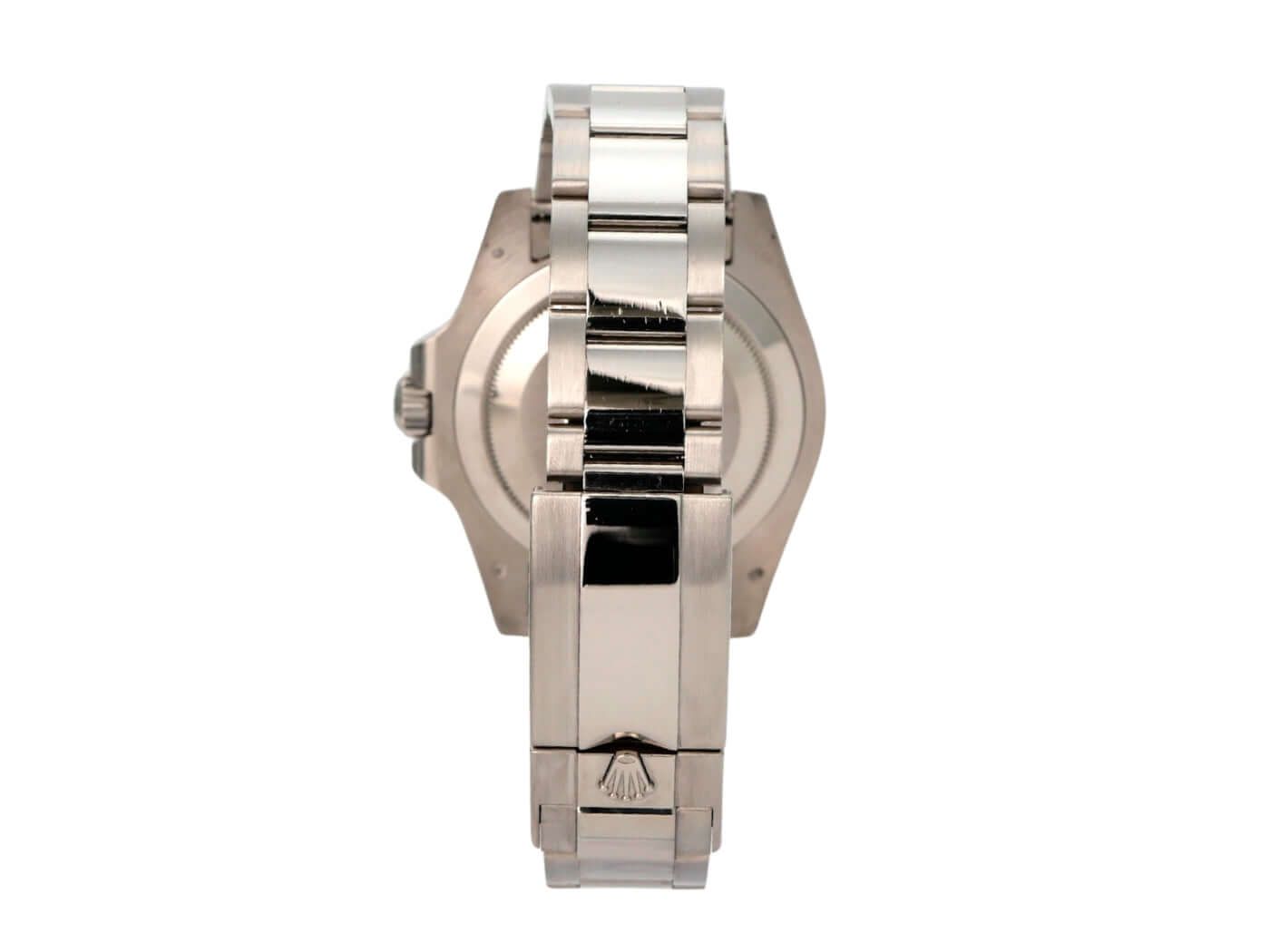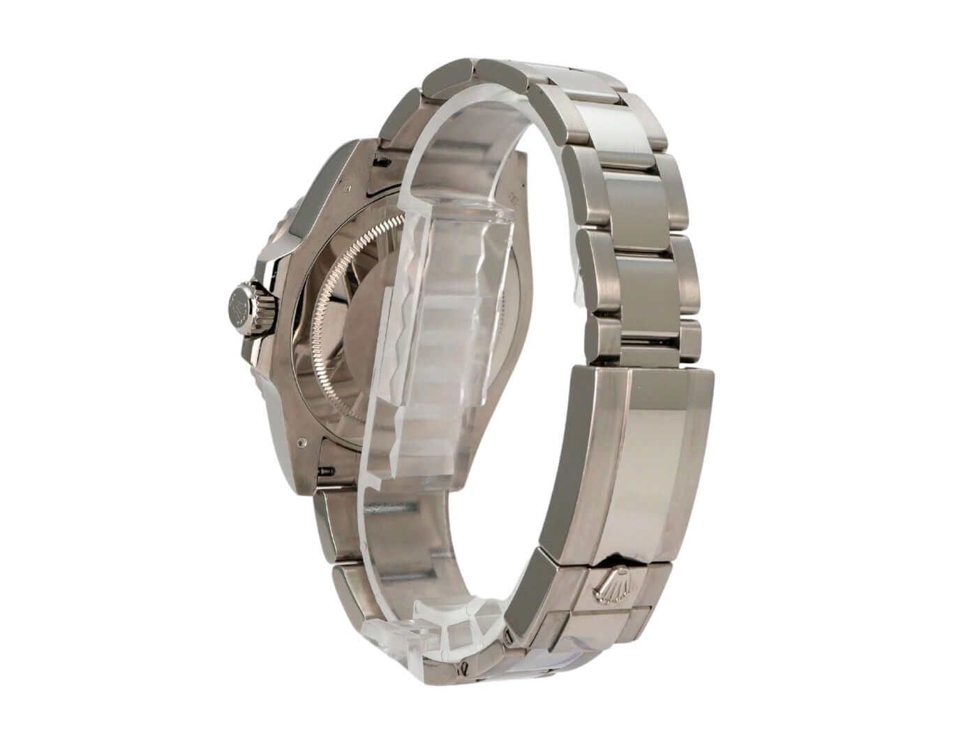 Kast in 18 kt wit goud, gepolijst en satijn afgewerkt, kastdiameter 40 mm, kasthoogte 12 mm, bezel in 18 kt wit goud met gefluteerde rand, blauw/rood keramisch inzetstuk en 24-uurs schaal, bi-directioneel draaibaar, Oyster armband in 18 kt wit goud, gepolijst en satijn afgewerkt met veiligheidsvouwsluiting, zwarte wijzerplaat met aangebrachte luminescerende indexen en luminescerende stippen, luminescerende wijzers, automatische beweging, Rolex manufacture kaliber 3186 met 31 juwelen, frequentie 28.800 A/h, datumaanduiding, GMT / tweede tijdzone, chronometer, saffierglas, schroefkroon met kroonbeschermers, schroefdeksel van 18 kt wit goud, waterbestendig tot 10 bar. Tweedehands horloge, zeer goede staat, compleet met doos en papieren, EU levering uit 2015.