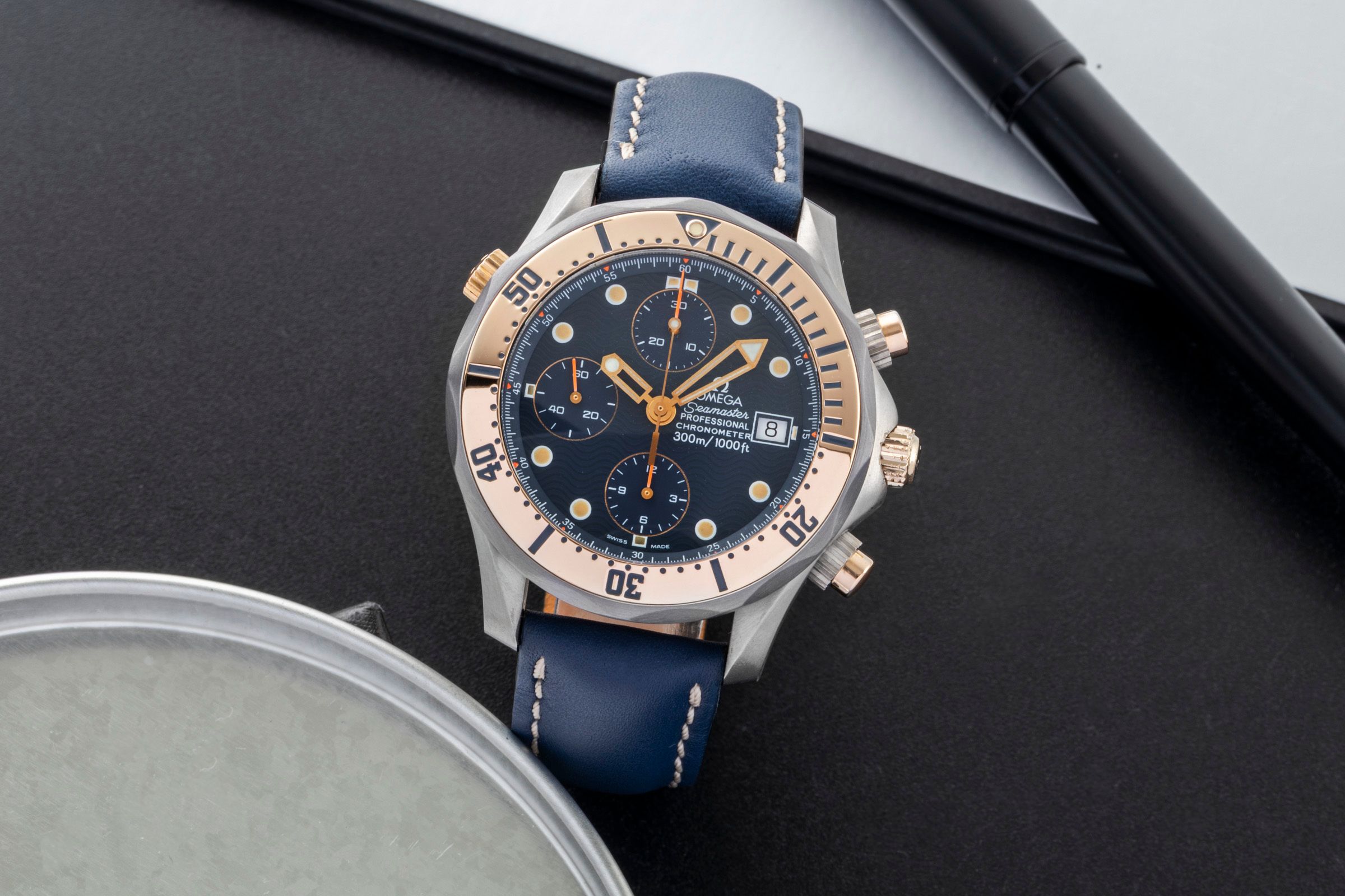 Alternative title: Omega 2296.80.00 - Seamaster Diver 300M Automatic 41.5 Chronograph Titanium / Tantalum / Red Gold / Blue / Bracelet; Omega Seamaster Professional 300M Chronograph Titan/Gold/Tantal Ref. 2296.80.00 [2507502]