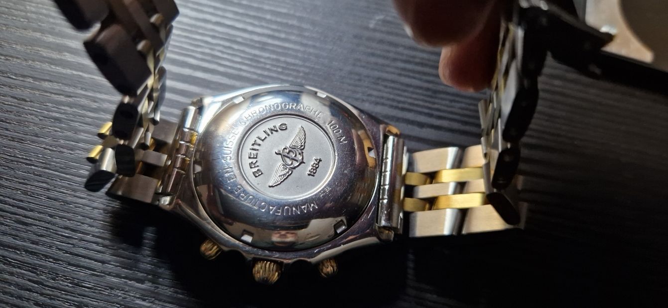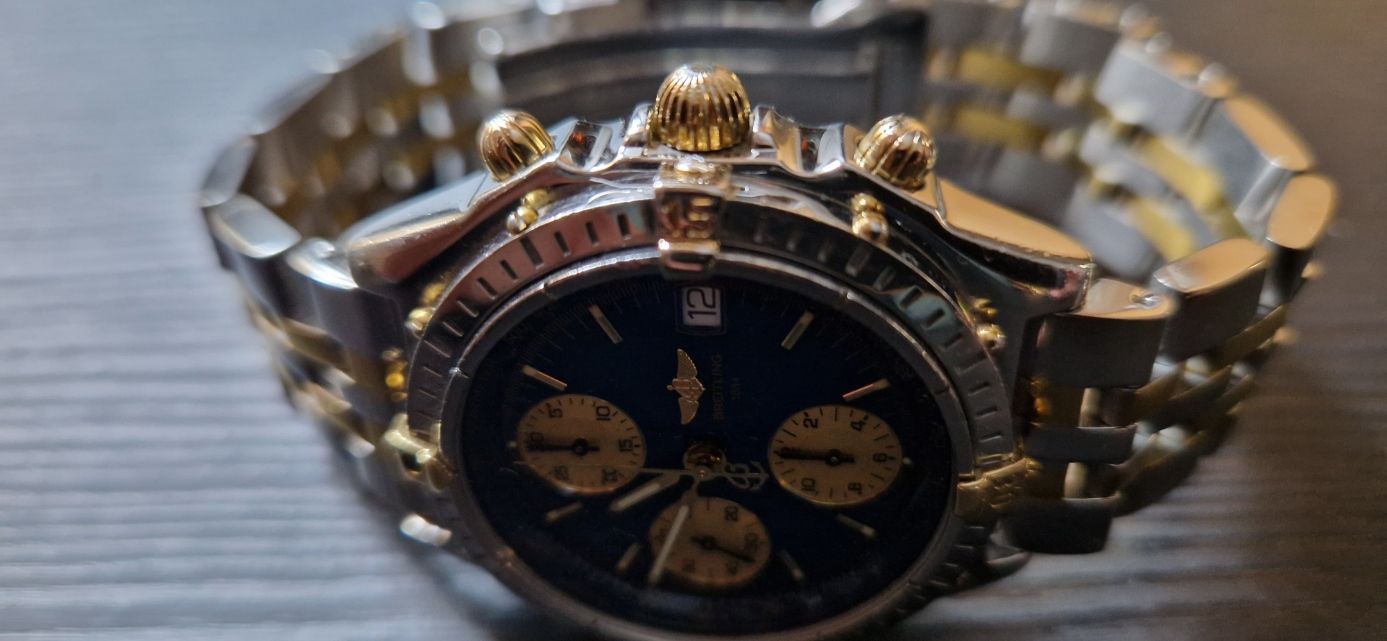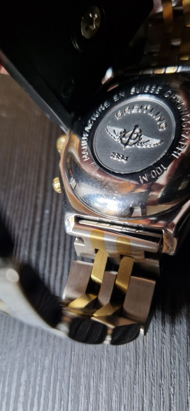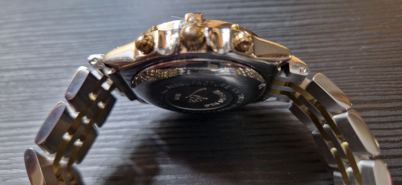Dit verzamelobject verkeert in uitstekende staat met een nieuwe (onbeschadigde) twee-tone stalen bracelet van Breitling: goud en staal.