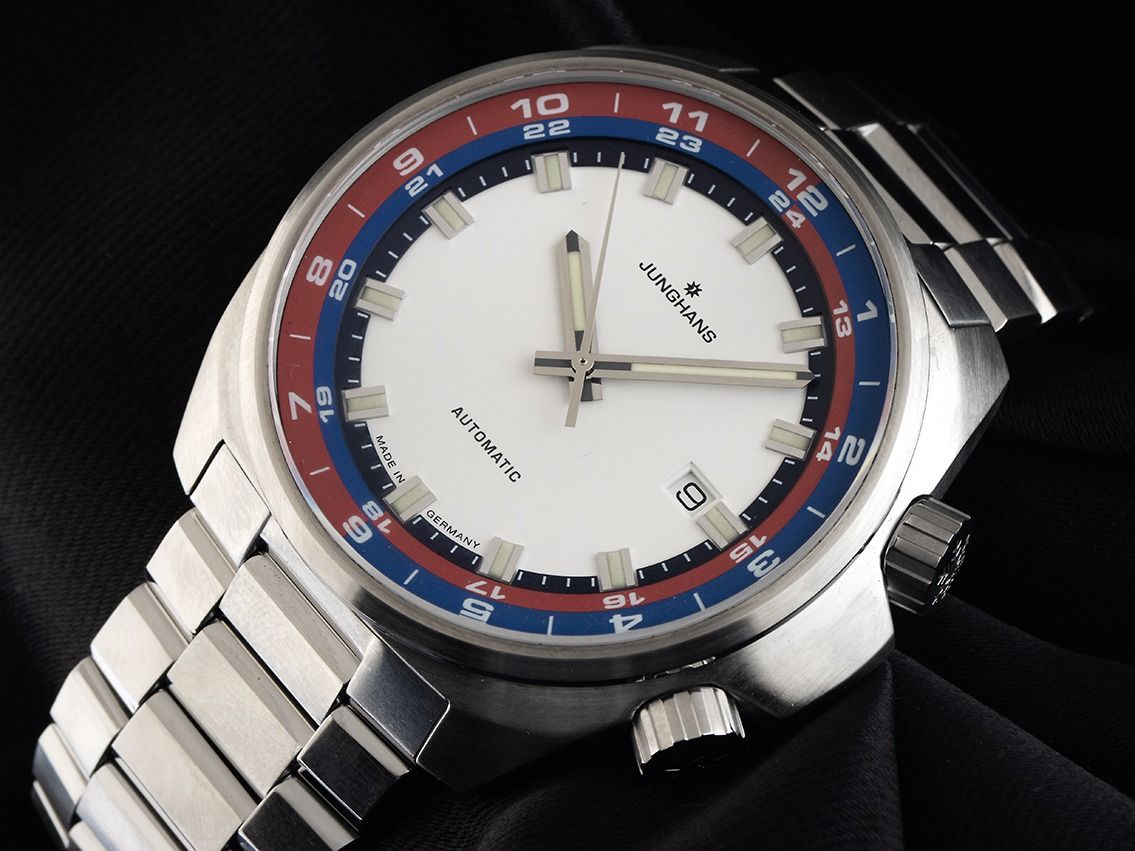 Gehuis van geborsteld roestvrij staal, behuizingsdiameter zonder kroon 46,9mm, behuizingshoogte 14,5mm. Lunette van geborsteld roestvrij staal in blauw/rood voor tweede tijdzone via draaibare onderglas lunette, instelbaar via kroon op 2 uur, geschroefd. Armband van geborsteld roestvrij staal, dubbele veiligheidsvouwsluiting van roestvrij staal met fabrikantlogo. Wijzerplaat wit met opgezette indexen en roestvrijstalen wijzers. Uurwerk Automatisch, Junghans Kaliber J830 met 28 edelstenen. Weergave van uur, minuut en seconde via centrale wijzers met seconde-stop voor nauwkeurige tijdinstelling, datumaanduiding met snelle aanpassing op 3 uur. Krasbestendig saffierglas. Kroon op 4 uur geschroefd met fabrikantlogo. Achterkant van roestvrij staal geschroefd en gegraveerd met de tekst "Oberstdorf Allgäu 2021". Gewicht van het horloge inclusief armband 194g, lengte van de armband inclusief behuizing 175mm. Referentienummer: 027/4160.44, ID: P06739000325H-2680, artikelnummer: 10000079148. Met gangcontrole en volledige uiterlijke opfrissing van maart 2025. Originele Junghans doos met omdoos en garantiepapieren van september 2021 en Watchregister uittreksel van maart 2025, The Watch Register certificaat / zonder vermelding (Internationale database voor verloren of gestolen horloges), Full Set. Beperkt tot 500 exemplaren. Als nieuw. Leveringstijd direct.