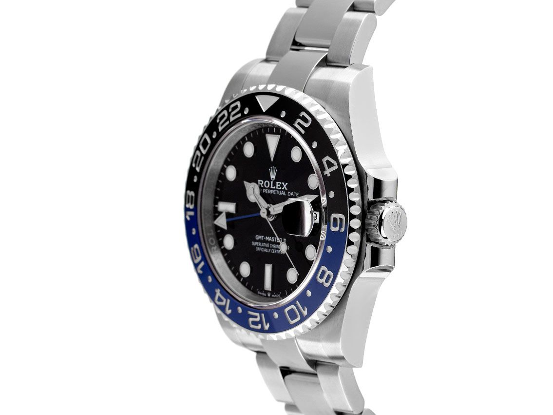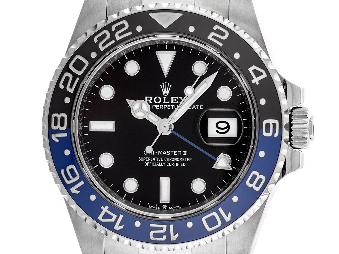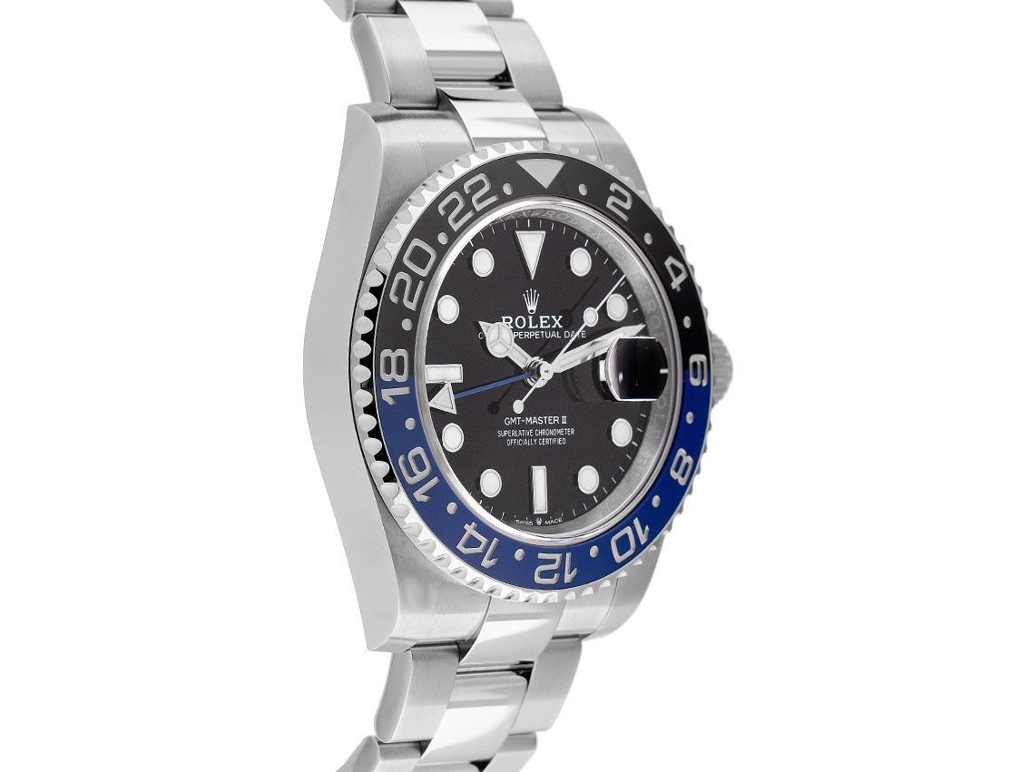Rolex GMT Master II Batman Stahl Keramik Automatik Armband OysterGehäuse Edelstahl poliert und satiniert, Gehäusedurchmesser ohne Krone 40mm, Gehäusehöhe 12,0mm. Lünette Edelstahl gerädelt mit blau / schwarzem Keramik Inlay, kugelgelagert mit 24-Stunden Einteilung, beidseitig drehbar. Armband Oyster Edelstahl poliert und satiniert, Rolex Sicherheitsfaltschließe Edelstahl mit Hersteller-Logo. Zifferblatt schwarz mit aufgesetzten weißgoldenen Leuchtindexen und Leuchtpunkten sowie weißgoldenen Leuchtzeigern. Uhrwerk Automatik, Chronometer mit Zeugnis, Rolex Manufakturkaliber 3285 mit 31 Edelsteinen, Gangreserve ca. 70 Stunden. Anzeige von Stunde, Minute und Sekunde über Zeiger aus der Mitte mit Sekundenstopp zur sekundengenauen Einstellung der Uhrzeit, Datumsanzeige mit Schnellverstellung unter Glaslupe bei 3 Uhr, zweite Zeitzone (GMT) ablesbar über Lünette, einstellbar über blauen Zeiger mit Leuchtspitze aus der Mitte. Saphirglas kratzfest. Krone verschraubbar mit Flankenschutz und Hersteller-Logo. Boden Edelstahl verschraubt. Gewicht der Uhr inklusive Armband 151g, Länge des Armbandes inklusive Gehäuse 190mm. Wasserdicht bis 10 ATM. Referenznummer: 126710BLNR, Gehäusenummer: W409GXXX, ID: P2716270000326HW-17900, Artikelnummer: 10000085235. Original Rolex Box mit Umkarton und Garantie Papiere von Februar 2025, neue Rolex Garantie Karte ohne Ländercode sowie Beschreibung, Ledermäppchen, Rolex Chronometer-Siegel und Watchregister Auszug von März 2026, The Watch Register Zertifikat / ohne Eintrag (Internationale Datenbank für verlorene oder gestohlene Uhren), Full Set. Kapitalanlage mit Wertsteigerungspotential. Ungetragen. Lieferzeit sofort.