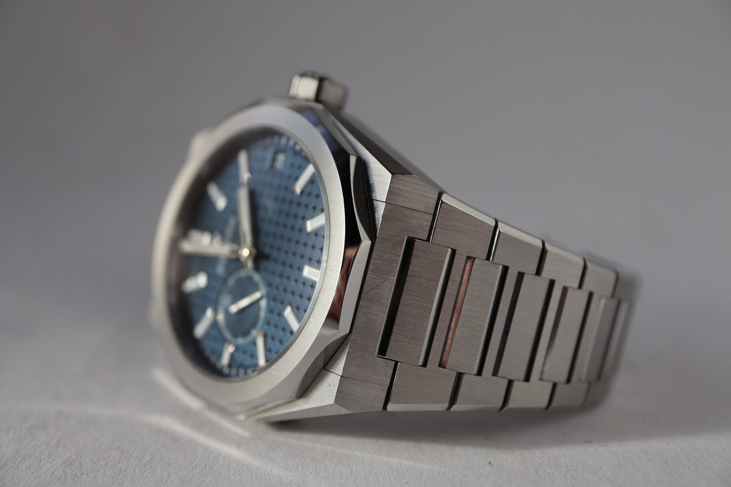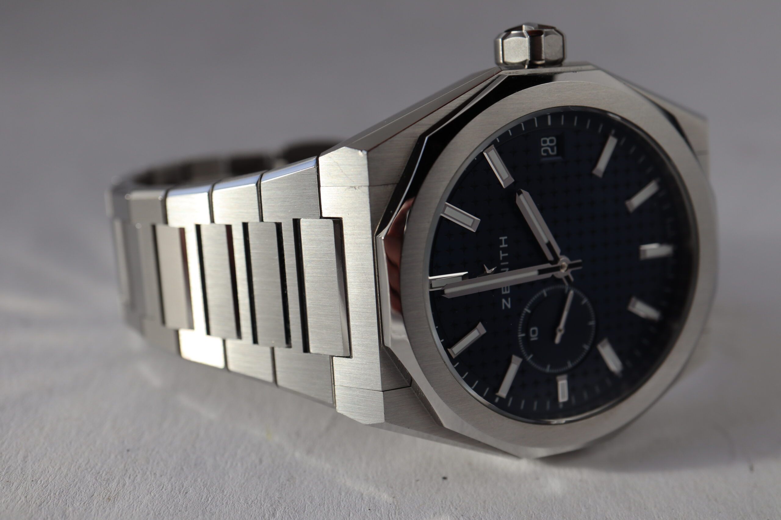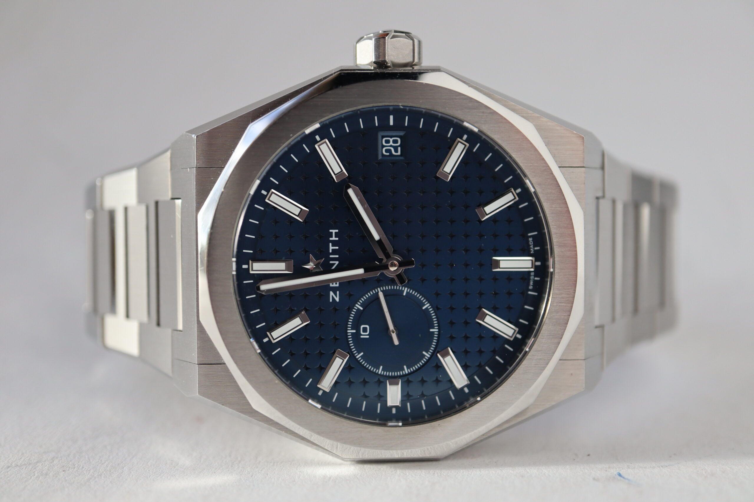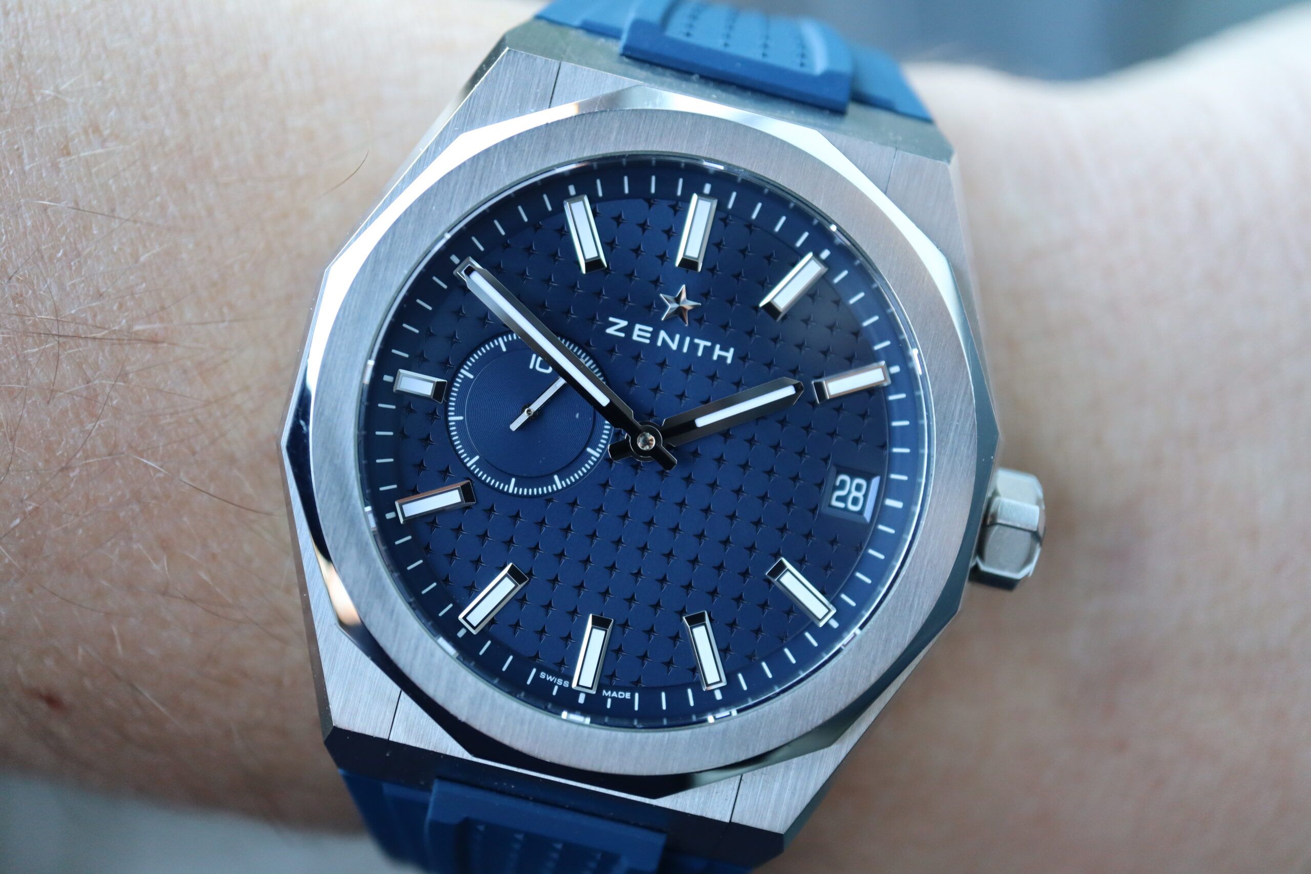 DEFY Skyline in a 41mm steel octagonal case with a faceted bezel, featuring a blue-toned sunburst-patterned dial revisiting the emblematic ZENITH four-pointed star. Powered by the El Primero 3620 high-frequency automatic manufacture movement with the very first 1/10th of a second indicator. Delivered with a steel bracelet, a second blue patterned rubber strap is included, to fully experience the interchangeability.