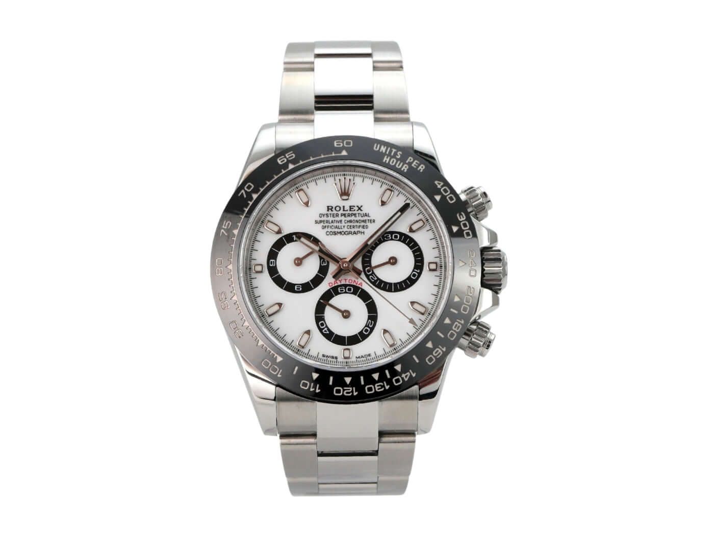 Rolex Daytona Stainless Steel Ref. 116500LN White DialCase made of polished and satin-finished stainless steel, ceramic bezel with tachymeter scale, Oyster stainless steel bracelet polished and satin-finished with safety folding clasp, white dial, luminous hands, Rolex manufacture caliber 4130, 44 jewels, approximately 72-hour power reserve, chronometer, sapphire crystal, screw-down crown with crown guards, screwed stainless steel case back, water-resistant up to 10 bar.