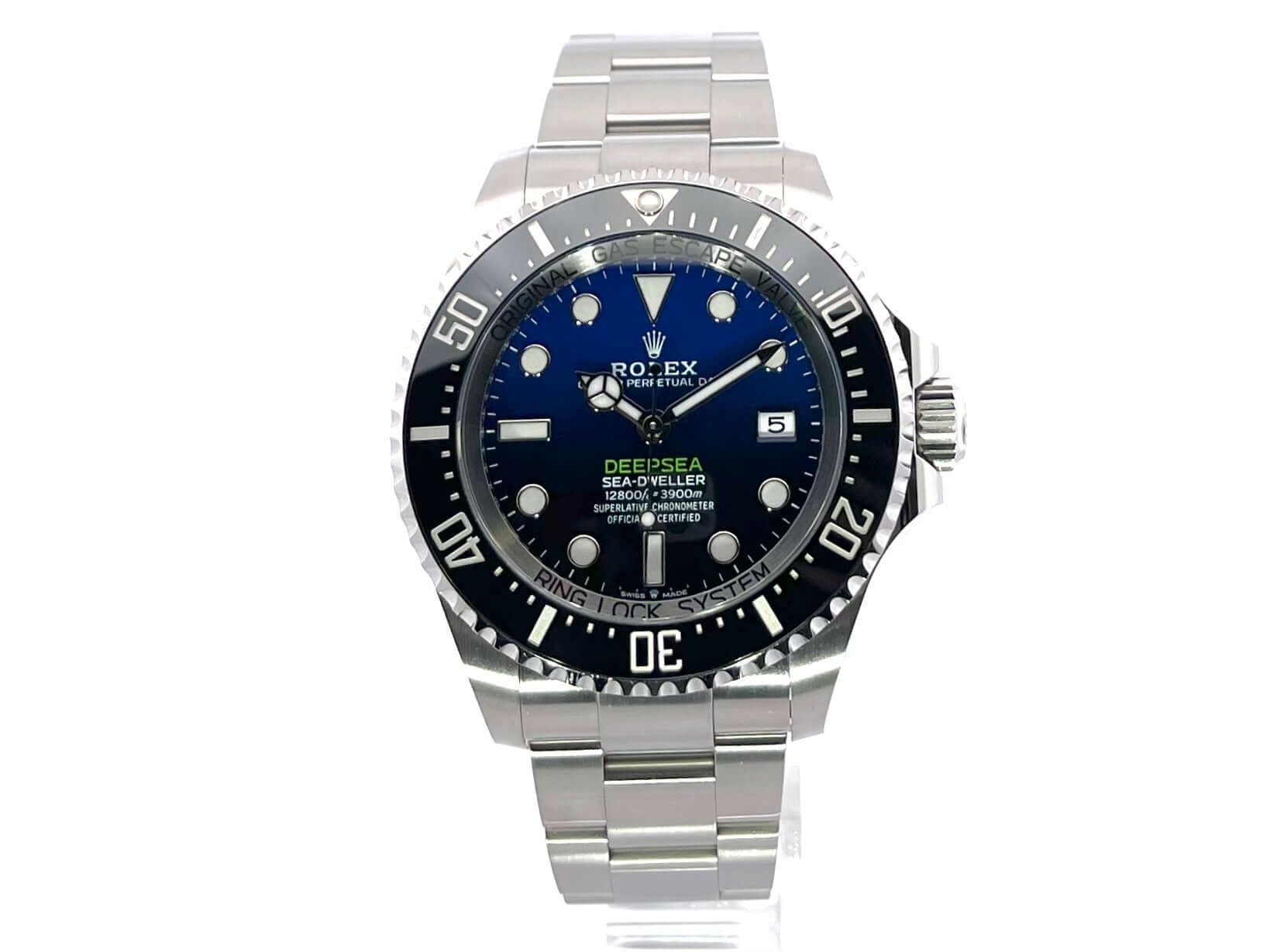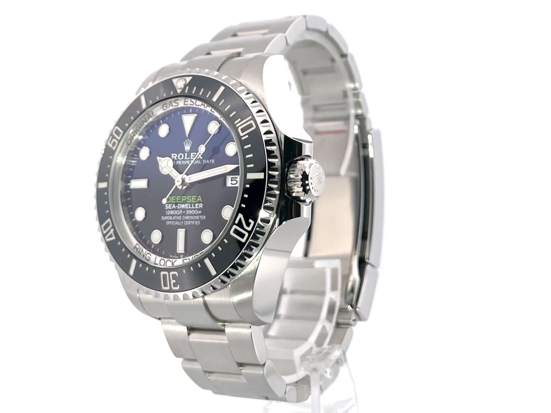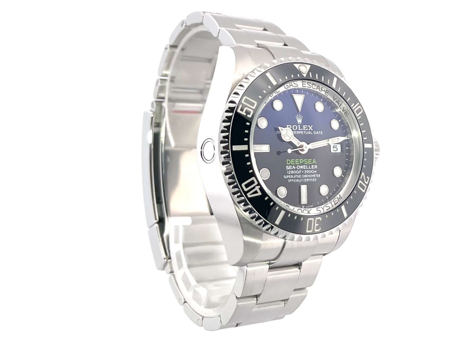 Rolex Sea-Dweller Deepsea 136660 D-BlueCase made of polished and satin-finished stainless steel, case diameter 44 mm, case height 17.8 mm, stainless steel bezel with black ceramic insert, 60-minute scale and luminous dot, unidirectional rotating, helium valve at the 9 o'clock position, satin-finished Oyster stainless steel bracelet with safety folding clasp, blue/black dial with applied luminous indices and luminous dots, luminous hands, automatic, Rolex manufacture caliber 3235 with 31 jewels, frequency 28,800 A/h, power reserve 70 hours, date display, chronometer, scratch-resistant sapphire crystal, domed, extra strong, screw-down Triplock crown with crown guards, screwed and engraved titanium case back, water-resistant up to 390 bar.