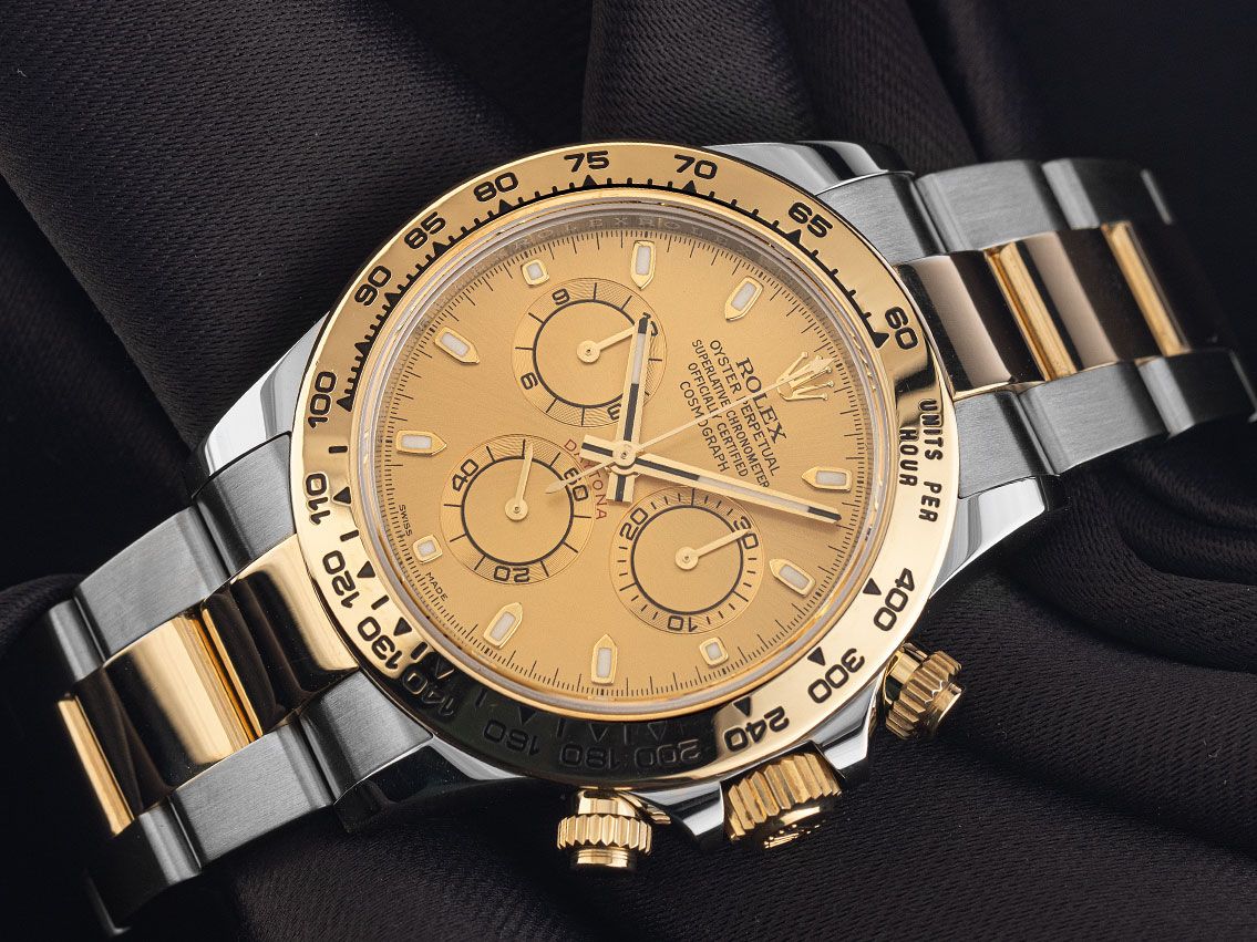 Rolex Daytona Stahl 18kt Gelbgold Automatik Chronograph Armband OysterGehäuse Edelstahl poliert und satiniert, Gehäusedurchmesser ohne Krone 40mm, Gehäusehöhe 12,3mm. Lünette 18kt Gelbgold poliert und graviert mit Tachymeterskala. Armband Oyster Edelstahl/ 18kt Gelbgold poliert und satiniert, Sicherheitsfaltschließe Edelstahl/ 18kt Gelbgold mit Hersteller-Logo. Zifferblatt champagnerfarben mit in Gelbgold gefassten Leuchtindexen und gelbgoldenen Leuchtzeigern, Hilfszifferblätter mit gelbgoldenem Rand umrandet. Uhrwerk Automatik, Chronograph, Chronometer mit Zeugnis, Rolex Manufakturkaliber 4130 mit 44 Edelsteinen. Anzeige von Stunde und Minute über Zeiger aus der Mitte, kleine Sekunde mit Sekundenstopp zur sekundengenauen Einstellung der Uhrzeit bei 6 Uhr. Saphirglas kratzfest. Krone verschraubbar mit Flankenschutz und Hersteller-Logo, Chronographen Drücker verschraubbar. Boden Edelstahl verschraubt. Gewicht der Uhr inklusive Armband 160g, Länge des Armbandes inklusive Gehäuse 185mm. Referenznummer: 116503, Gehäusenummer: 3UD58XXX, ID: P2732361500326H-23500, Artikelnummer: 10000085268. Original Rolex Box mit Umkarton und Garantie Papiere von März 2023, neue Rolex Garantie Karte ohne Ländercode sowie Beschreibung, Ledermäppchen, Chronometer-Siegel, Erstkaufrechnung und Watchregister Auszug von März 2026, The Watch Register Zertifikat / ohne Eintrag (Internationale Datenbank für verlorene oder gestohlene Uhren), Full Set. Superschnäppchen, Kapitalanlage mit Wertsteigerungspotential, aus erster Hand, fast nicht getragen. Wie Neu. Lieferzeit sofort.