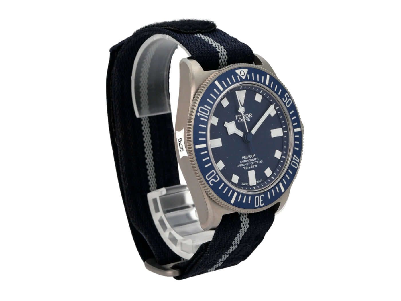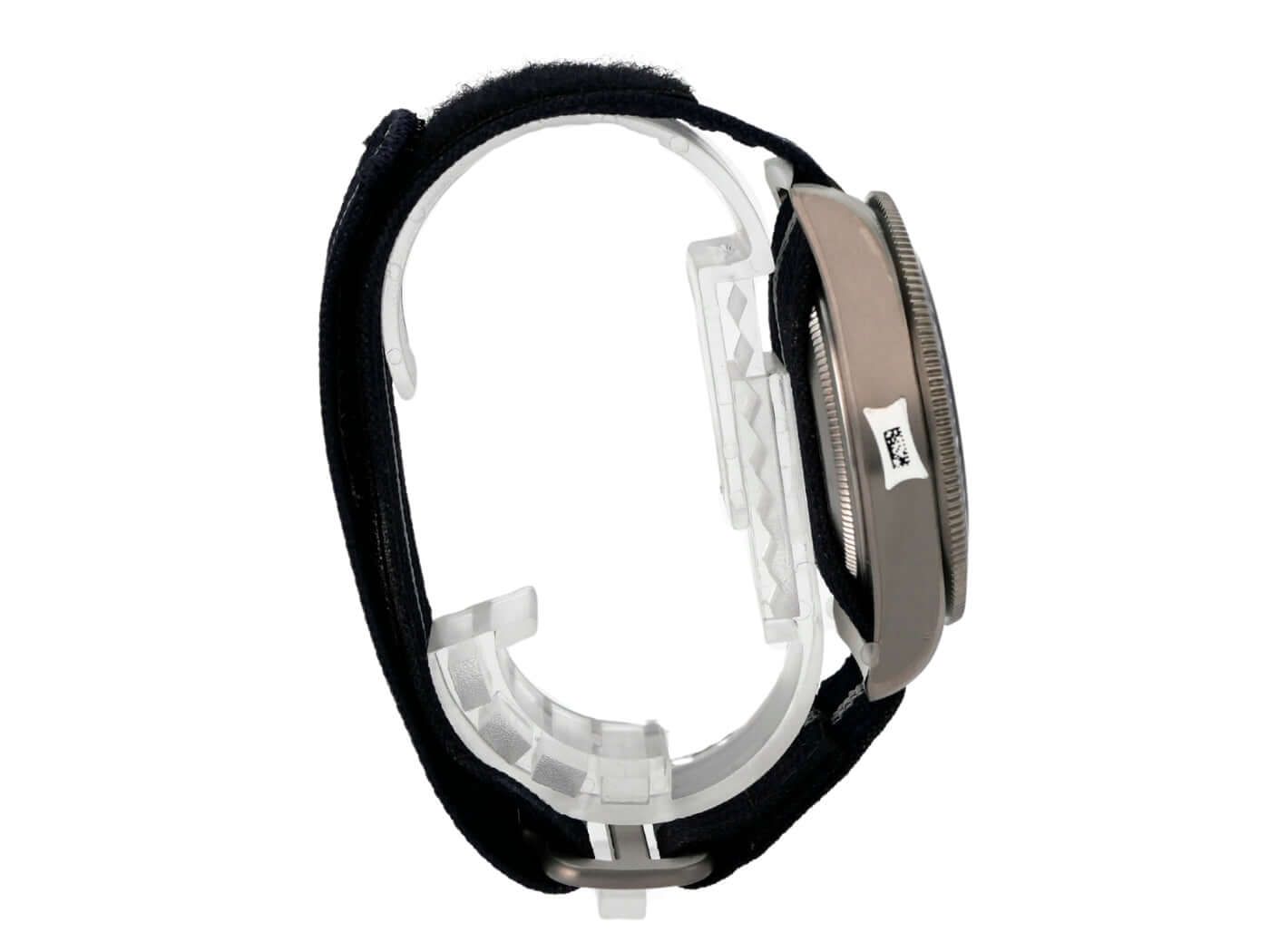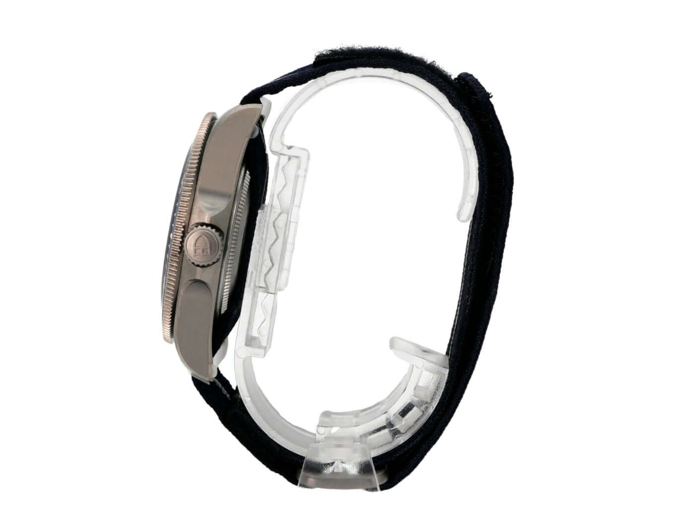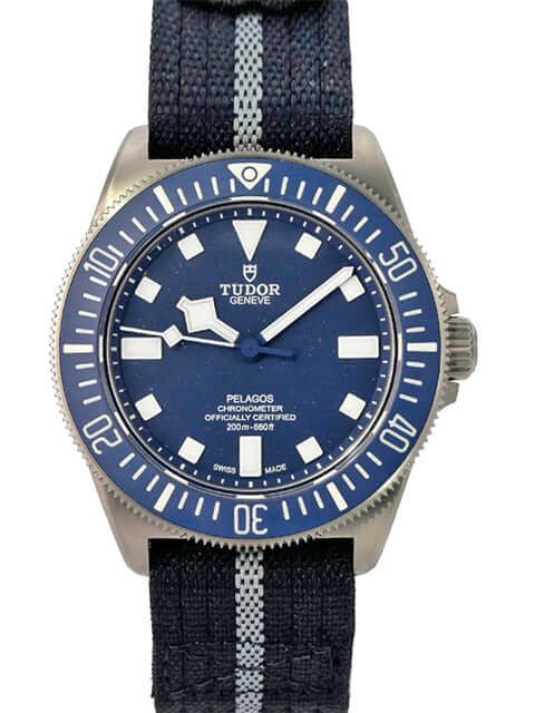 Tudor Pelagos FXD 25707B/22-0001Brushed titanium case, case diameter 42 mm, case height 13 mm, titanium bezel with blue ceramic insert, 60-minute scale with luminous dot and rotatable, helium valve, blue textile strap with Velcro closure, extra blue rubber strap with pin buckle, blue dial with applied luminous indices, luminous hands, automatic movement, Tudor MT5602, chronometer, sapphire crystal, screw-down crown with crown guards, screwed and engraved titanium case back, water-resistant up to 20 bar.