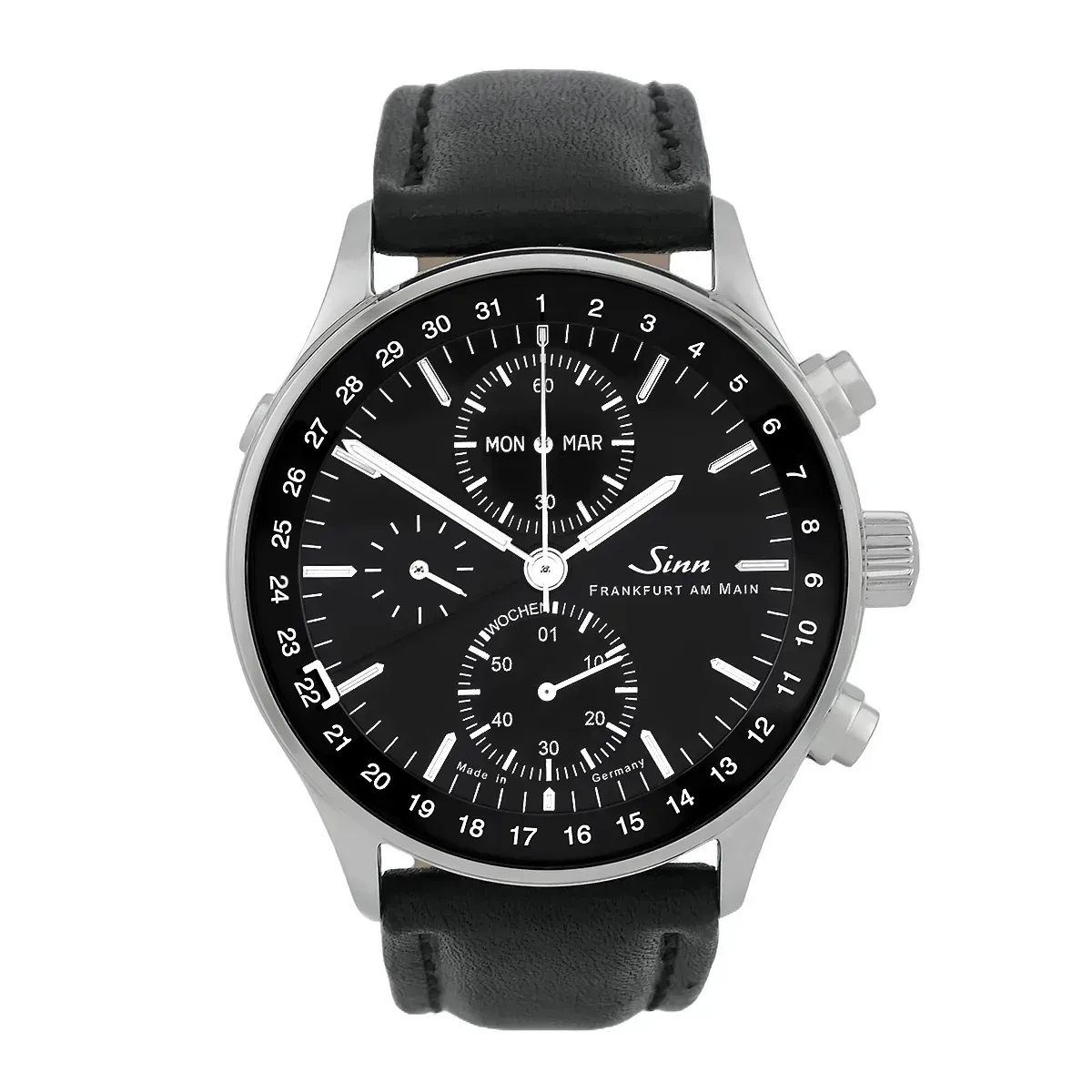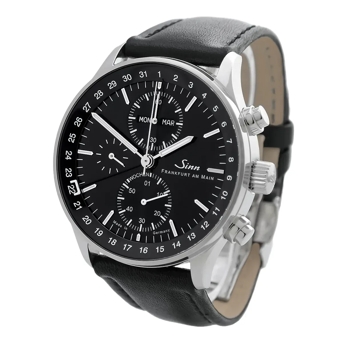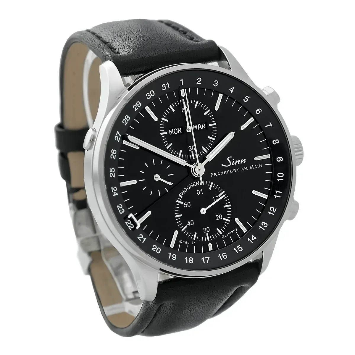 ‘All photos show exactly the item we are offering - no archive images! This item is taxed according to § 25 A UStG - VAT is not deductible. If you have any questions about the watch, feel free to reach out through the Wristler chat.’ Caliber: Sinn Kaliber SZ03 Case Material: Stahl Case Diameter: 41.5 Case Height: 14,5 Dial Numbers: Keine Ziffern Dial Color: Schwarz Bracelet Color: Schwarz Bracelet Material: Kalbsleder Functions: Datum, Monatsanzeige, Wochentagsanzeige