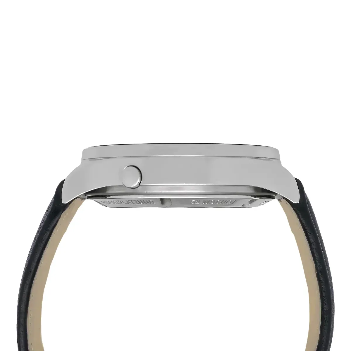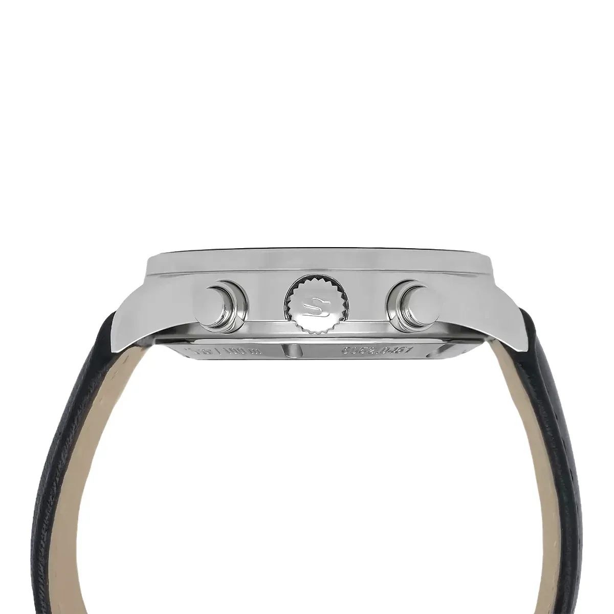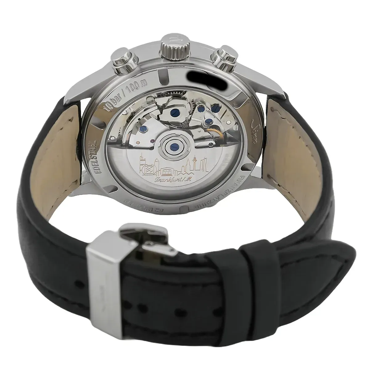 ‘All photos show exactly the item we are offering - no archive images! This item is taxed according to § 25 A UStG - VAT is not deductible. If you have any questions about the watch, feel free to reach out through the Wristler chat.’ Caliber: Sinn Kaliber SZ03 Case Material: Stahl Case Diameter: 41.5 Case Height: 14,5 Dial Numbers: Keine Ziffern Dial Color: Schwarz Bracelet Color: Schwarz Bracelet Material: Kalbsleder Functions: Datum, Monatsanzeige, Wochentagsanzeige