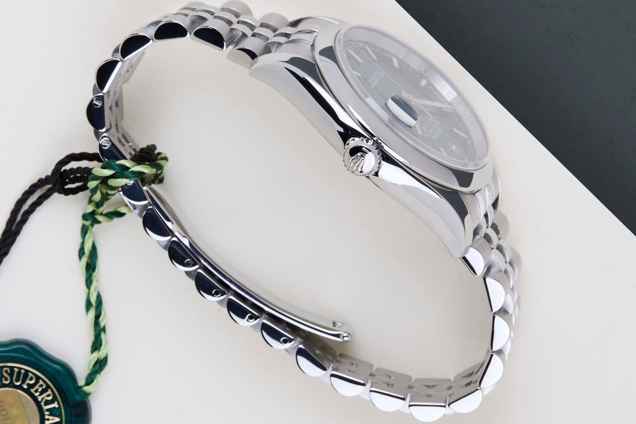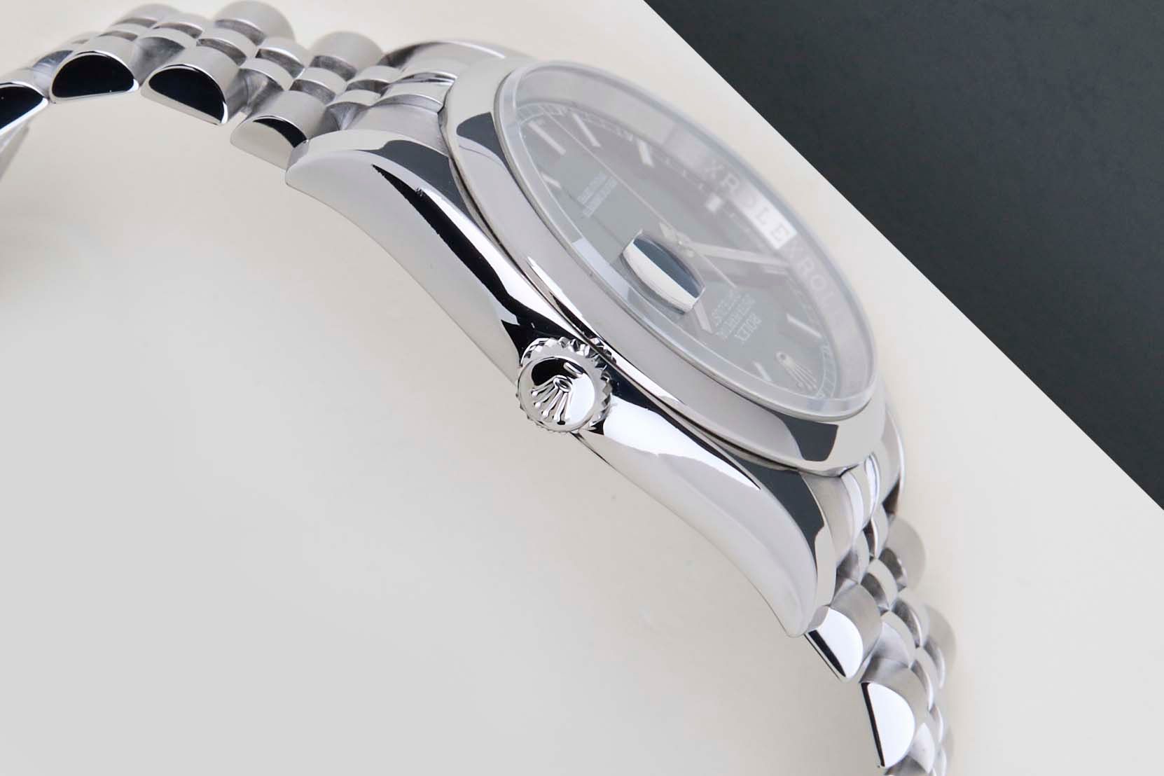 Deze Rolex Datejust 36 is in Mint conditie en wordt geleverd met de originele Rolex Garantiekaart en doos. Bovendien is het horloge onderhouden door onze horlogemaker, en daarom komt het met één jaar Steiner Garantie.