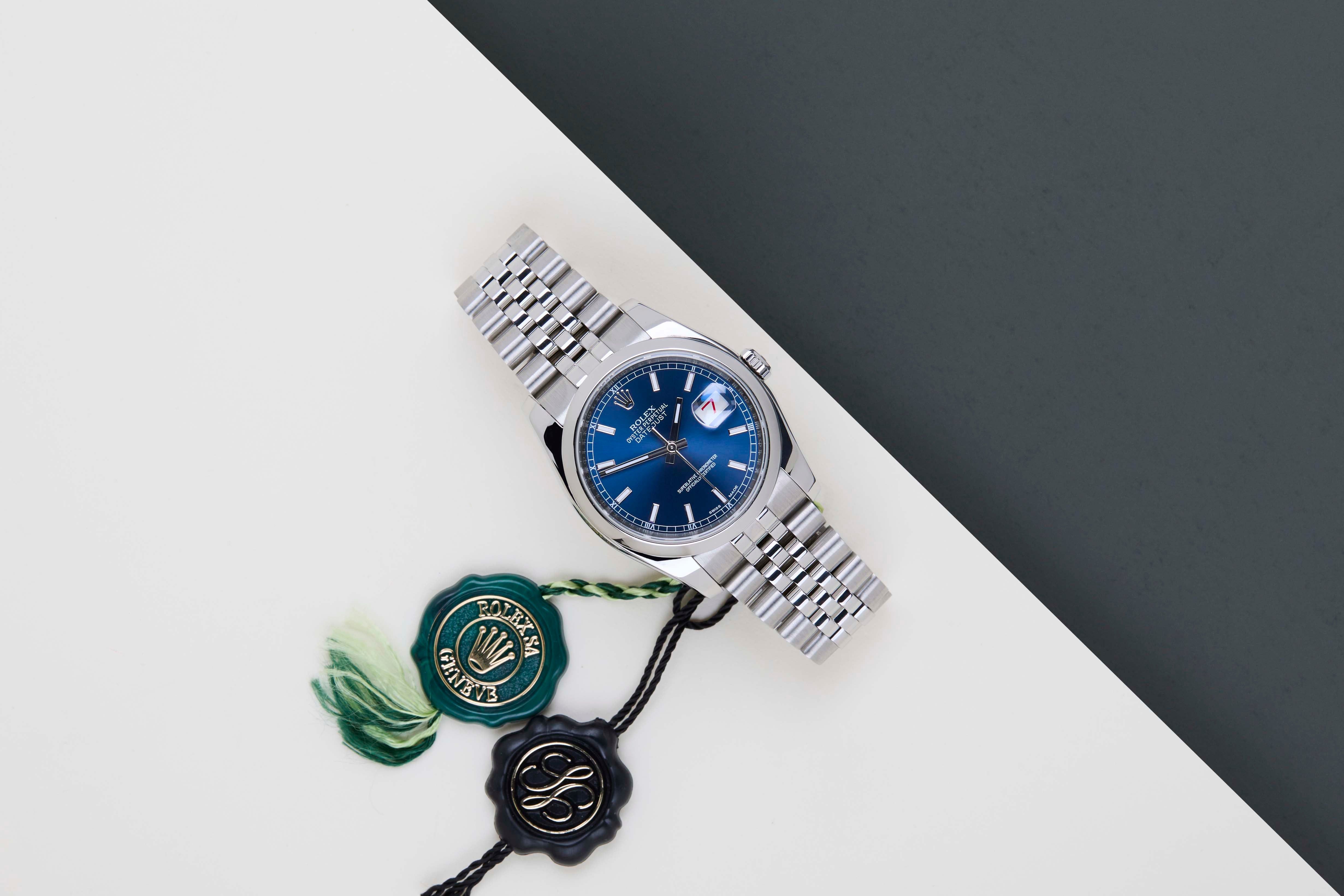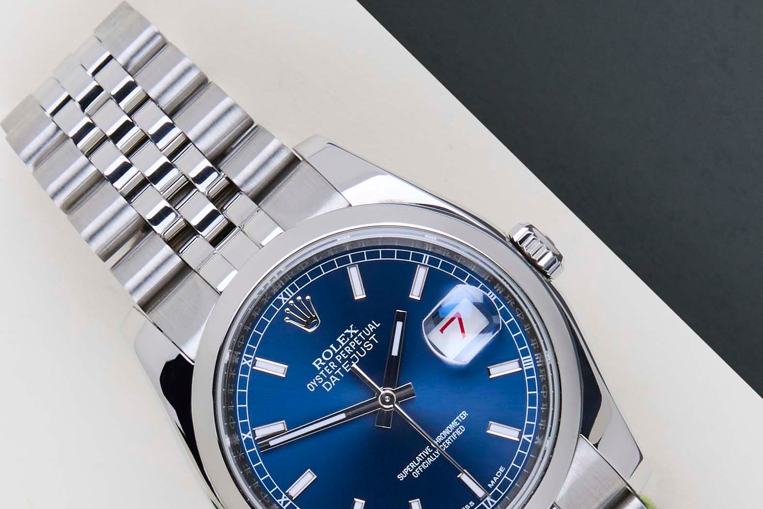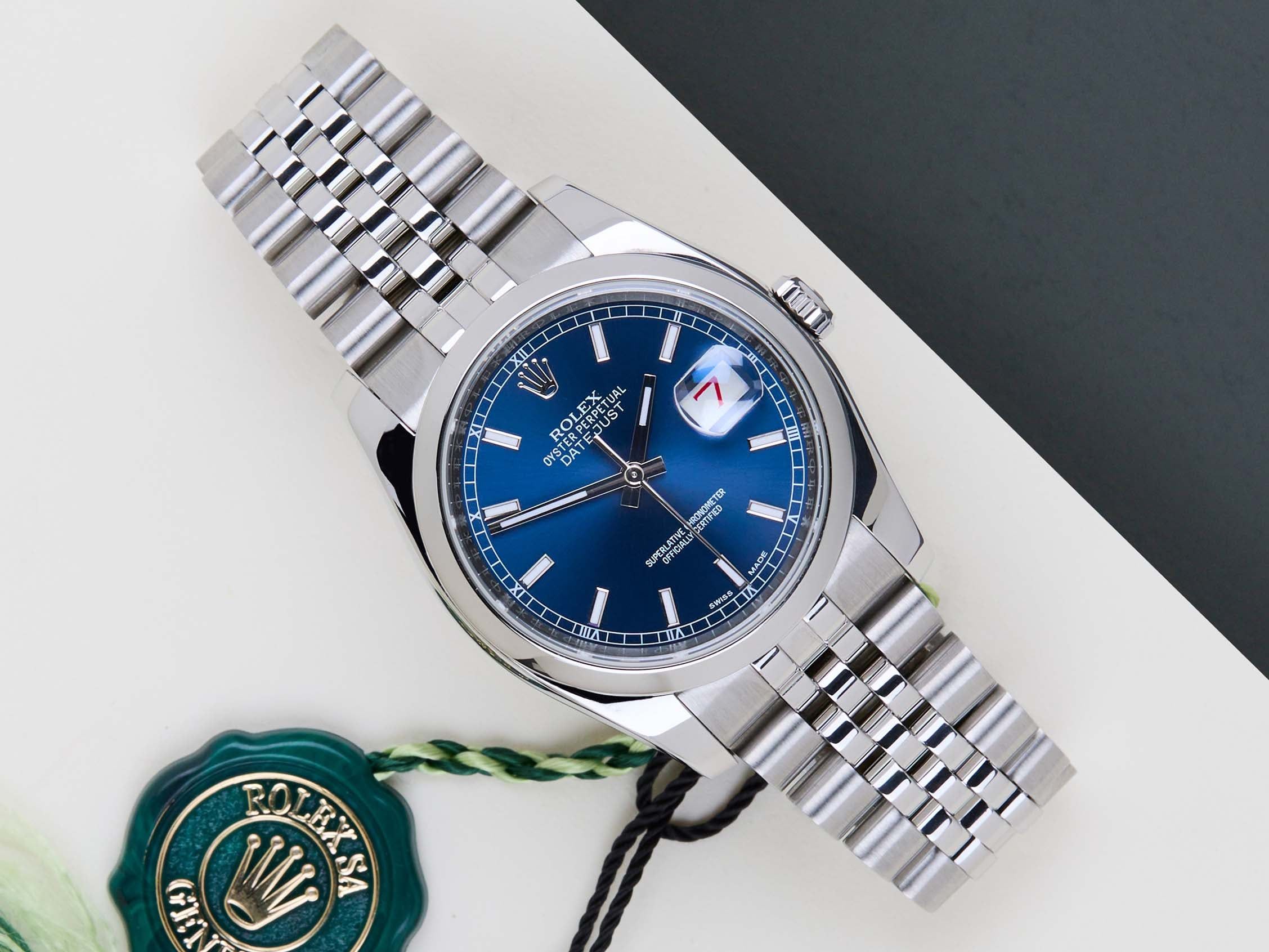 Deze Rolex Datejust 'Blauwe Wijzerplaat - Jubilee' werd voor het eerst verkocht in augustus 2015. Deze Datejust is gemaakt van Rolex' 904L roestvrij staal en is uitgerust met een Jubilee-armband.
