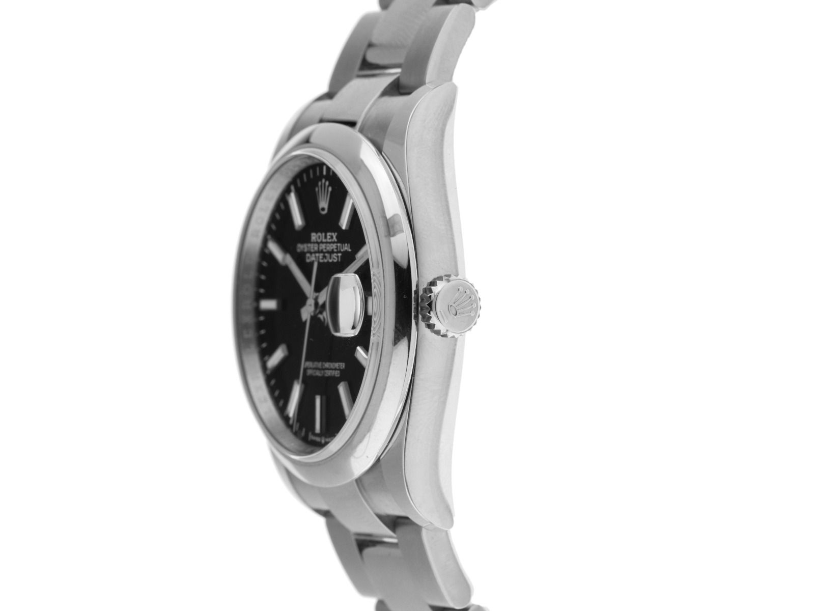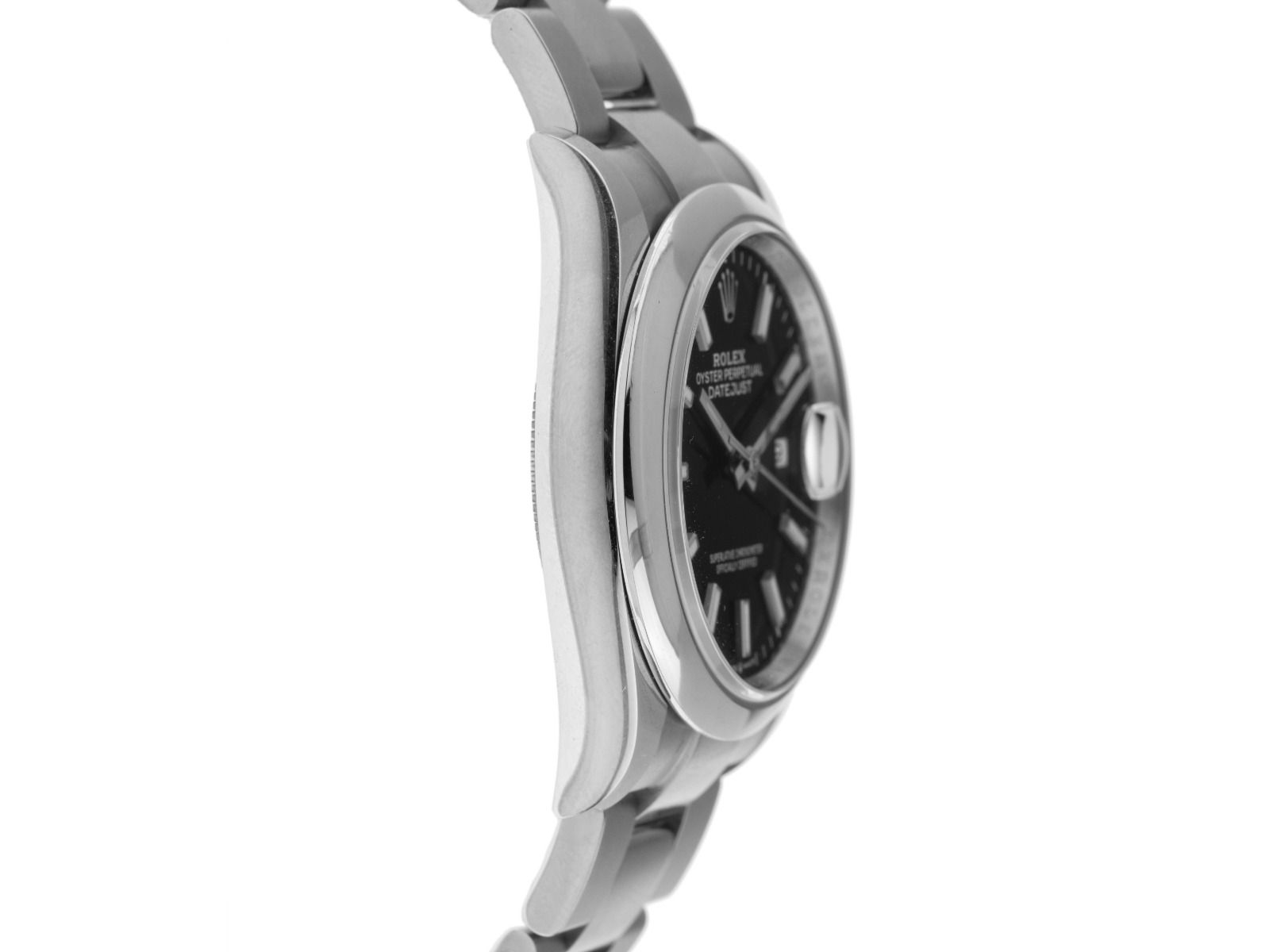 Behuizing van gepolijst en satijn afgewerkt staal, behuizingsdiameter zonder kroon 36mm, behuizingshoogte 11,7mm. Lünette van glad en gepolijst staal. Armband Oyster van gepolijst en satijn afgewerkt staal, Rolex vouwsluiting van staal met fabrikantlogo. Wijzerplaat zwart met opgezette indexen van witgoud en witgouden wijzers. Uurwerk Automatisch, Rolex Manufakturkaliber 3235 met 31 edelstenen. Weergave van uur, minuut en seconde via centrale wijzers met seconde-stop voor nauwkeurige tijdinstelling, datumweergave met snelle instelling onder vergrootglas bij 3 uur. Saffierglas krasbestendig. Kroon met schroefdraad en fabrikantlogo. Achterkant van staal met schroefdraad. Gewicht van het horloge inclusief armband 121g, lengte van de armband inclusief behuizing 165mm. Referentienummer: 126200, behuizingsnummer: 3PG77XXX, ID: P2739146000326HW-11900/7850, artikelnummer: 10000085275. Met gangcontrole en volledige uiterlijke opfrissing van maart 2026. Originele Rolex doos met omdoos en garantiepapieren van oktober 2021, nieuwe Rolex garantiewaarde zonder landcode, evenals beschrijving, lederen etui, Rolex Chronometer-zegel en Watchregister uittreksel van maart 2026, The Watch Register certificaat / zonder vermelding (Internationale database voor verloren of gestolen horloges), Full Set. Kapitaalbelegging met waardevermeerderingspotentieel. Als nieuw. Leveringstijd onmiddellijk.