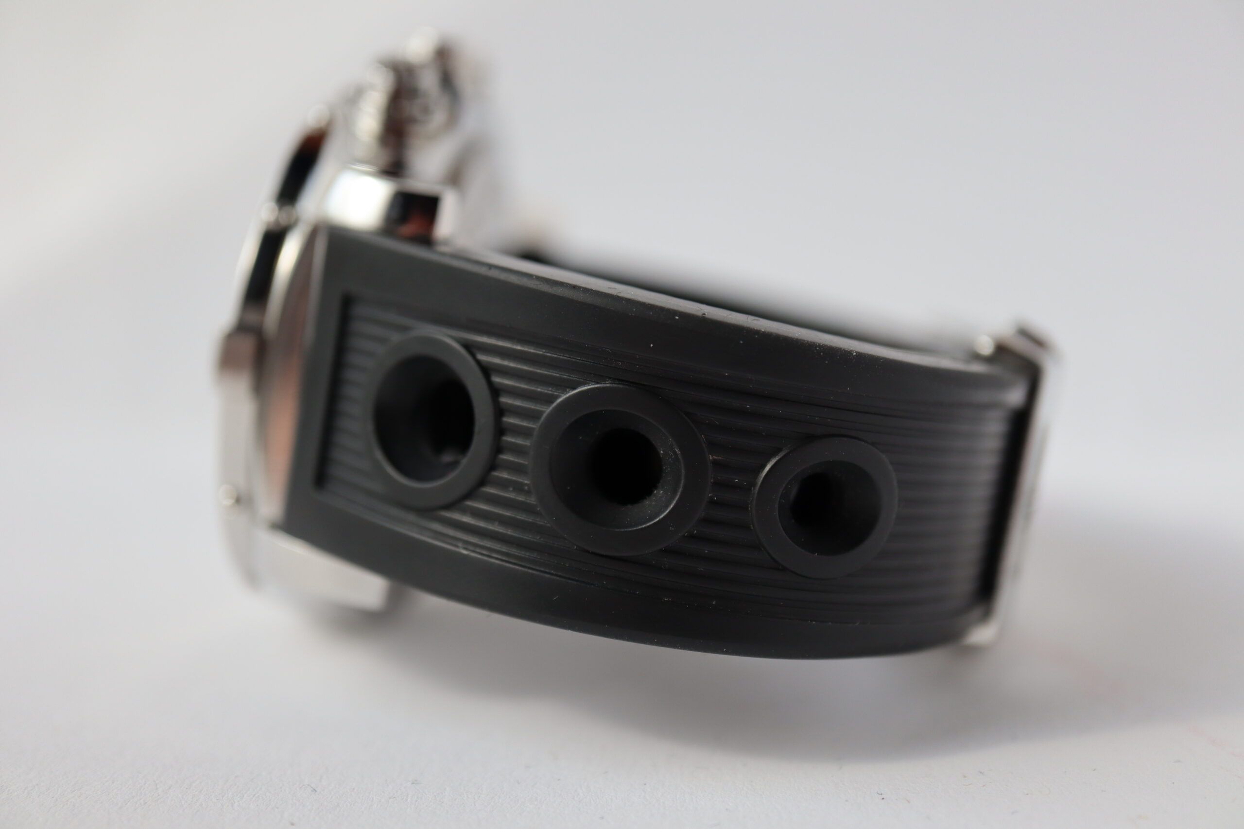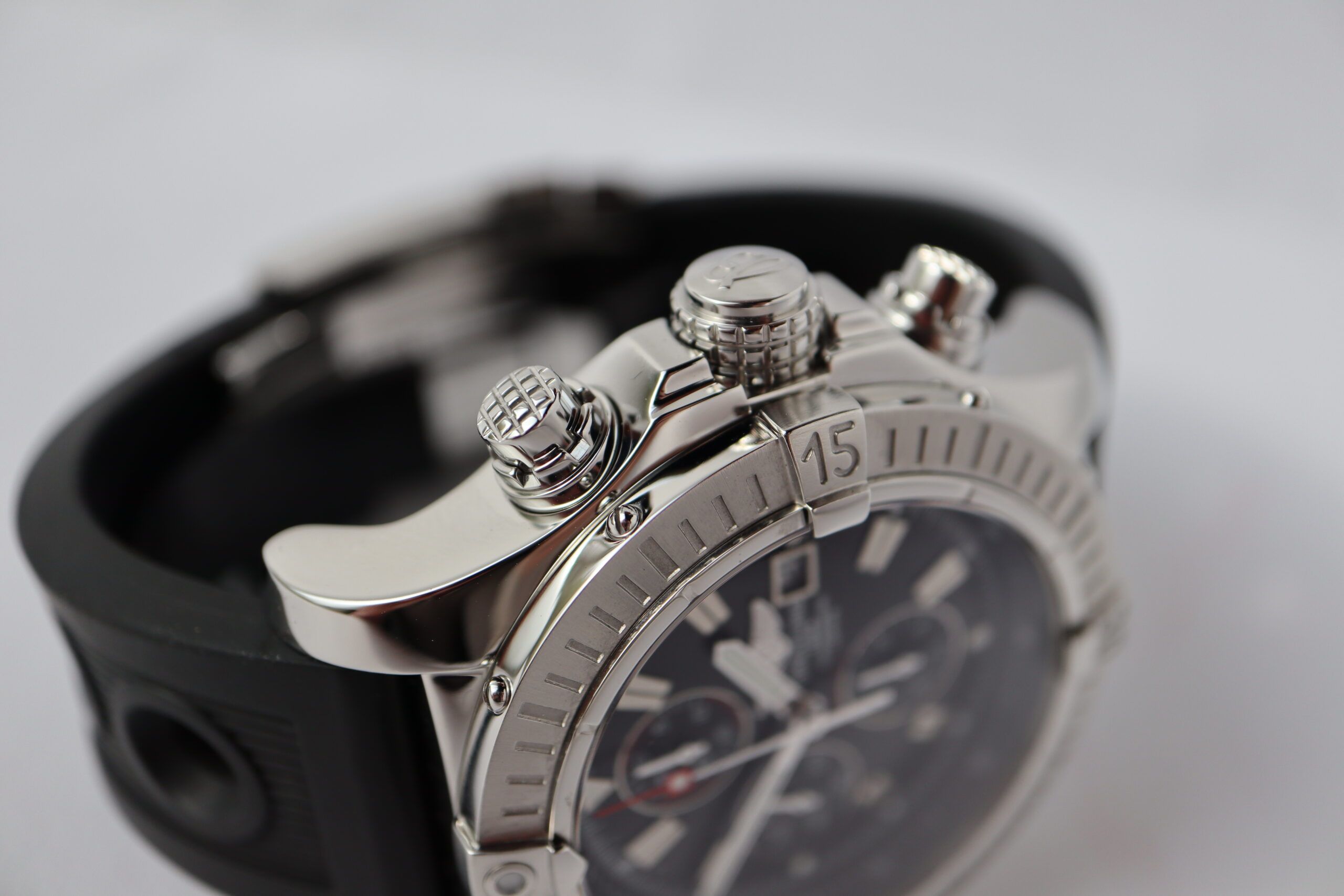 Met een breedte dichter bij 50 mm dan bij 40 mm, worden horloges niet veel robuuster dan de A13370 van Breitling. Sinds de lancering staat de Avenger-collectie vooral bekend om het gebruik van de kenmerkende ratelbezels van Breitling met vier uitstekende "rider tabs." Het ontwerp is gemaakt om piloten te helpen de bezel gemakkelijker vast te pakken terwijl ze handschoenen dragen. Hier is het uitgevoerd in roestvrij staal, wat perfect past bij de grotere stalen kast. De enorme bezel van de Super Avenger speelt een grote rol in het benadrukken van de onderscheidende stijl van het model; net als de gekartelde kroon, geflankeerd door kroonbeschermers, en het duo van imposante chronograafdrukknoppen.