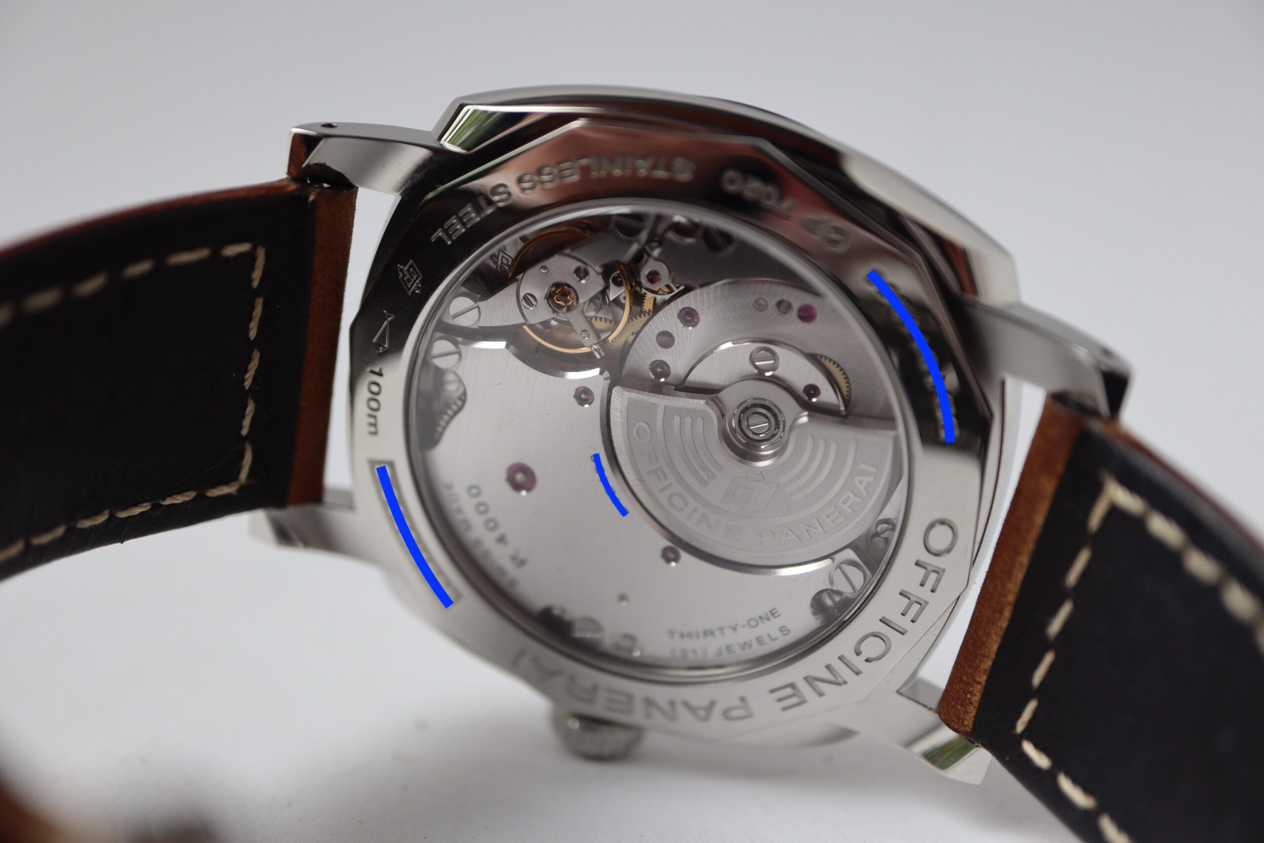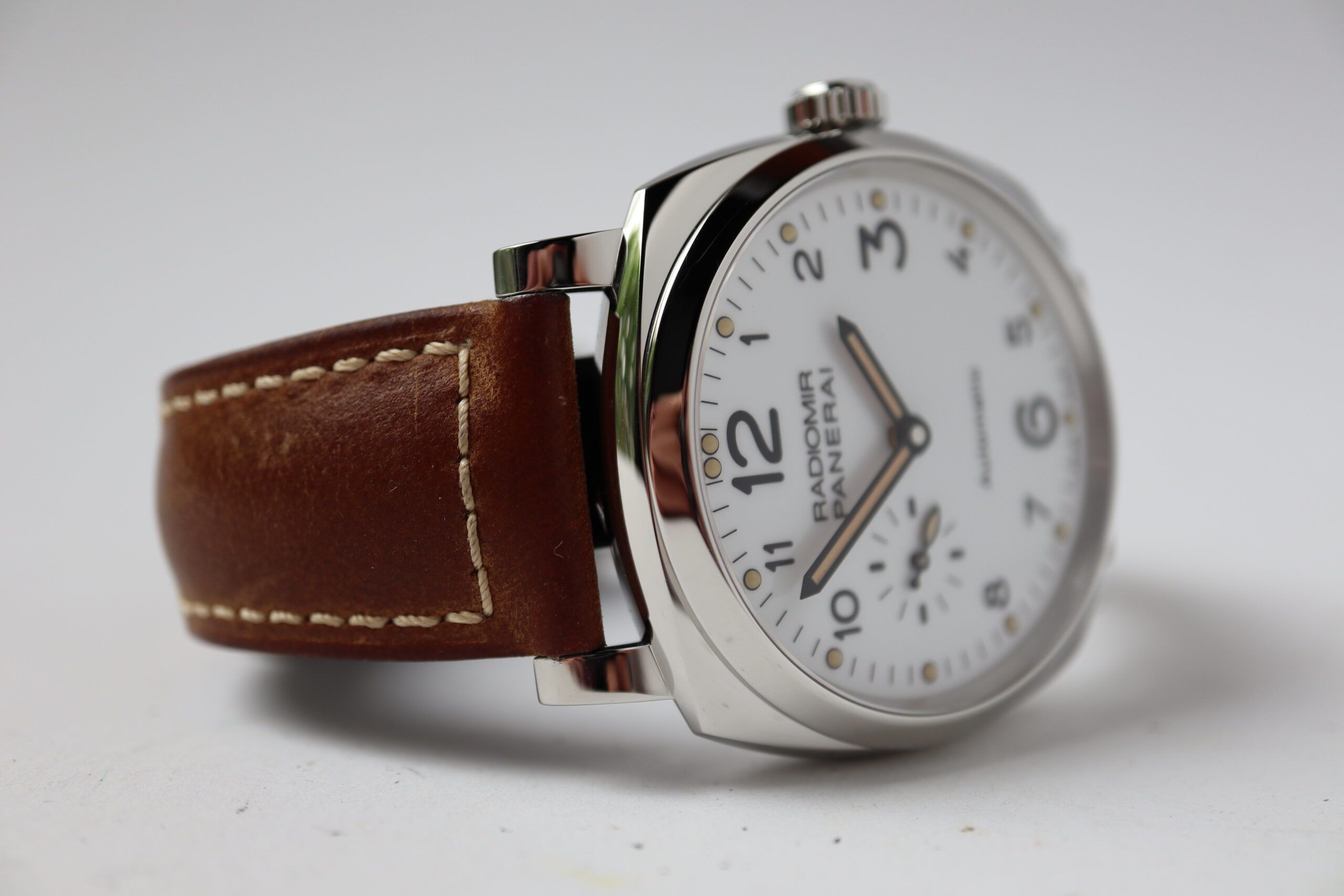 The Panerai Radiomir 1940 PAM 655 was introduced in 2015. It features a smaller-than-usual case (42mm) and is powered by Panerai's automatic micro-rotor P.4000 caliber.The design and the main characteristics of the Radiomir 1940 3 Days Automatic came directly from the 1940s but their modernity is such that the watch has an absolutely contemporary style. The dial of the new Radiomir 1940 3 Days Automatic is offered in white and the graphic design maximizes the dial’s clarity and legibility, with the large black figures corresponding to the hour markers and the small seconds dial at nine o’clock, a characteristic of Panerai watches of the 1940s. The cushion case, in AISI 316L stainless steel with polished finish, is 42 mm in diameter and only 10.93 mm thick. On the back of the Radiomir 1940 3 Days Automatic is a round window with a sapphire crystal through which the automatic P.4000 movement, entirely made in the Officine Panerai Manufacture in Neuchâtel, can be admired. The new Radiomir 1940 3 Days Automatic (PAM00655) is water-resistant to 10 bar (a depth of about 100 metres) and it is supplied with a natural, untreated leather strap, with contrasting stitching.