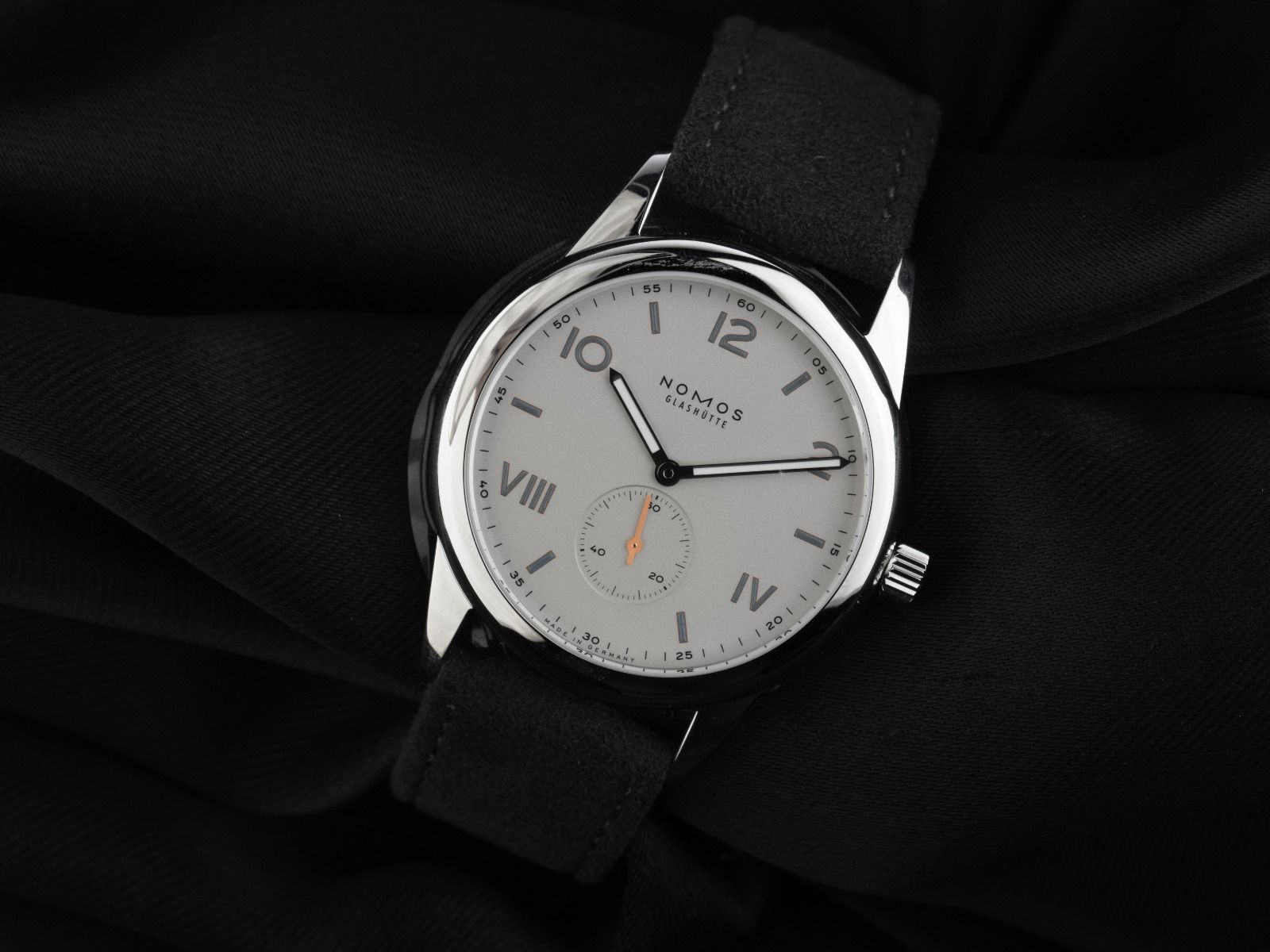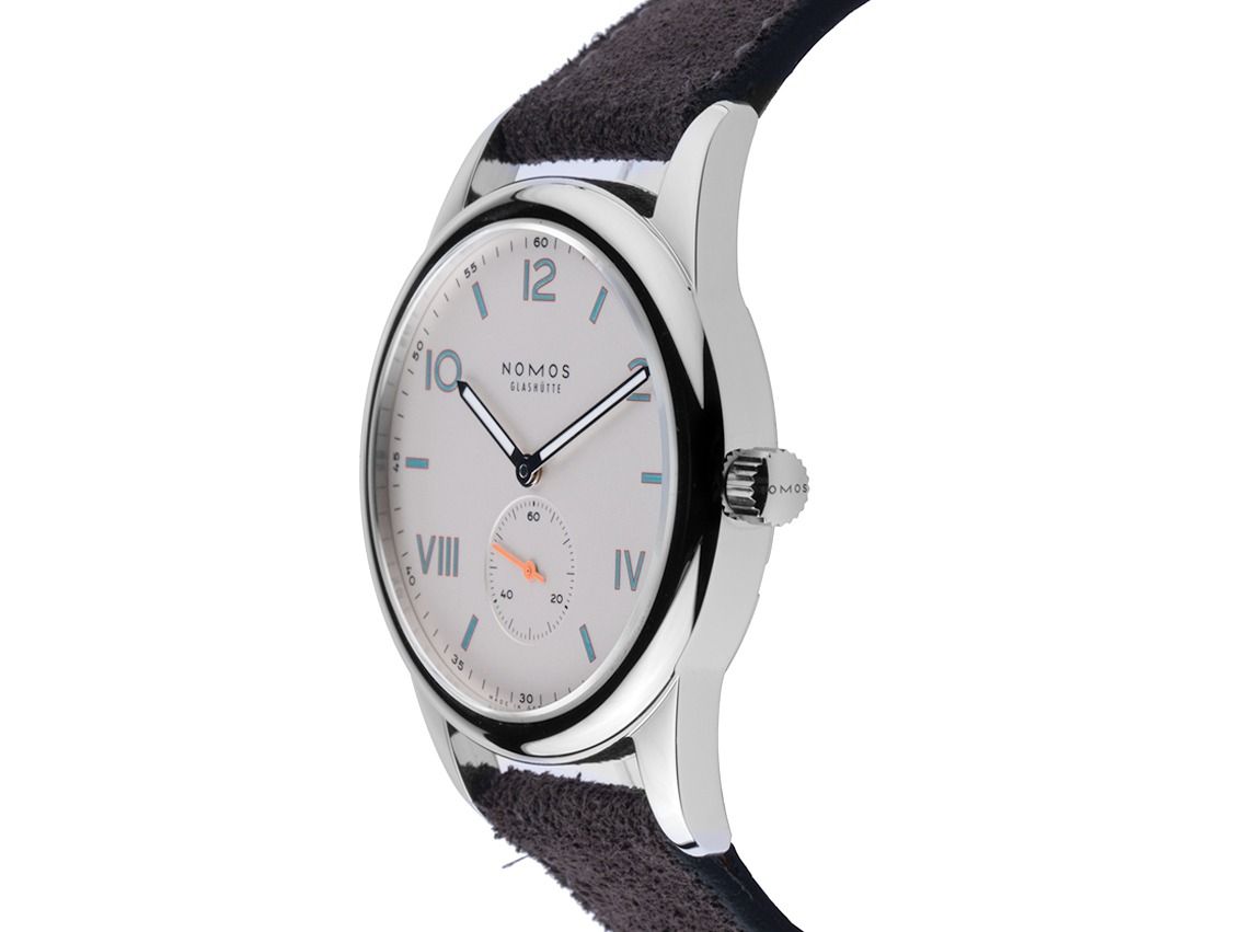 Nomos Glashütte Club Campus Stahl Handaufzug Armband LederGehäuse Edelstahl poliert, Gehäusedurchmesser ohne Krone 38,5mm, Gehäusehöhe 8,5mm. Lünette Edelstahl glatt und poliert. Armband Velours Leder anthrazit mit Ziernaht, Anstoßbreite 20mm, Stiftschließe Edelstahl mit Hersteller-Logo. Zifferblatt weiß versilbert, galvanisiert mit arabischen, römischen Ziffern und Indexen in blau nachleuchtend sowie Edelstahl Leuchtzeigern. Uhrwerk Handaufzug, Nomos Manufakturkaliber DUW 4001 mit 17 Edelsteinen, Gangreserve ca. 53 Stunden. Anzeige von Stunde und Minute über Zeiger aus der Mitte, kleine Sekunde mit Sekundenstopp zur sekundengenauen Einstellung der Uhrzeit bei 6 Uhr. Saphirglas kratzfest. Krone geriffelt mit Hersteller-Logo. Boden Edelstahl verschraubt und graviert mit Saphirglas Sichtfenster. Gewicht der Uhr inklusive Armband 54g. Wasserdicht bis 10 ATM. Referenznummer: 737, ID: ST116023200426H-1740, Artikelnummer: 10000085398. Original Nomos Glashütte Box und Garantie Papiere von März 2026, Full Set. Neu. Lieferzeit sofort.