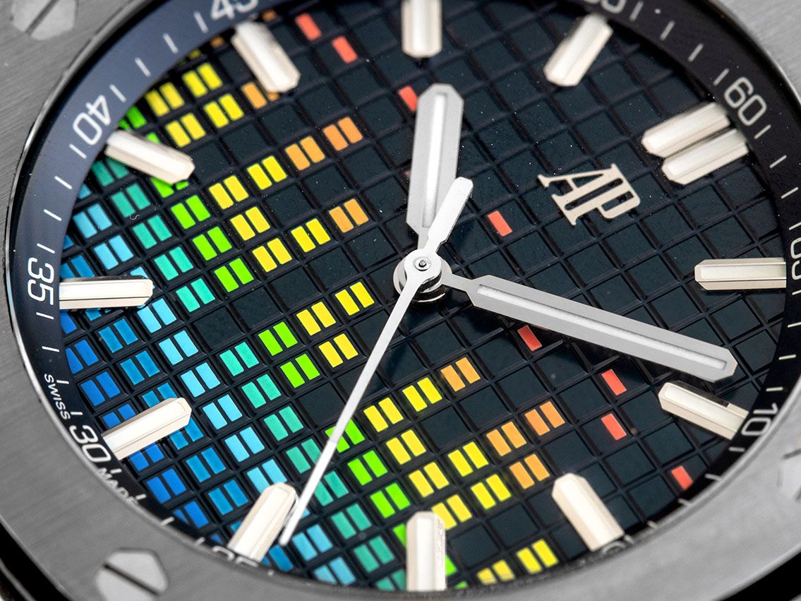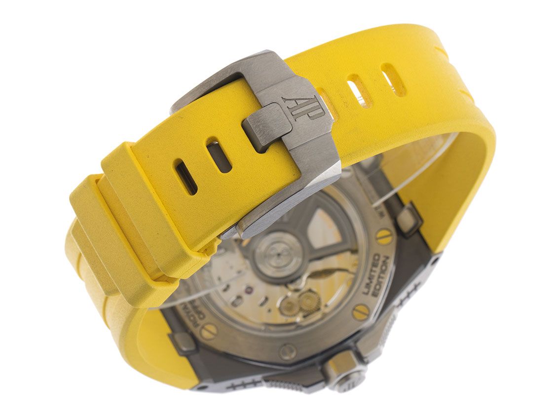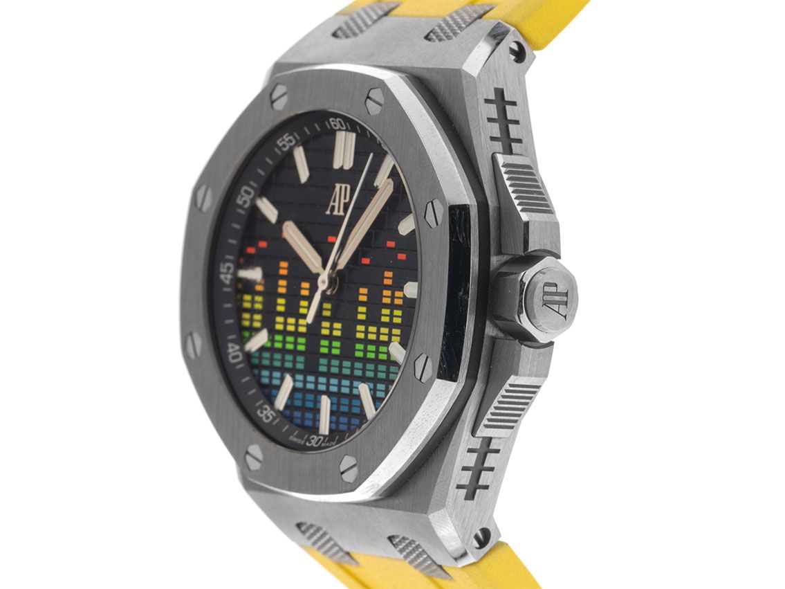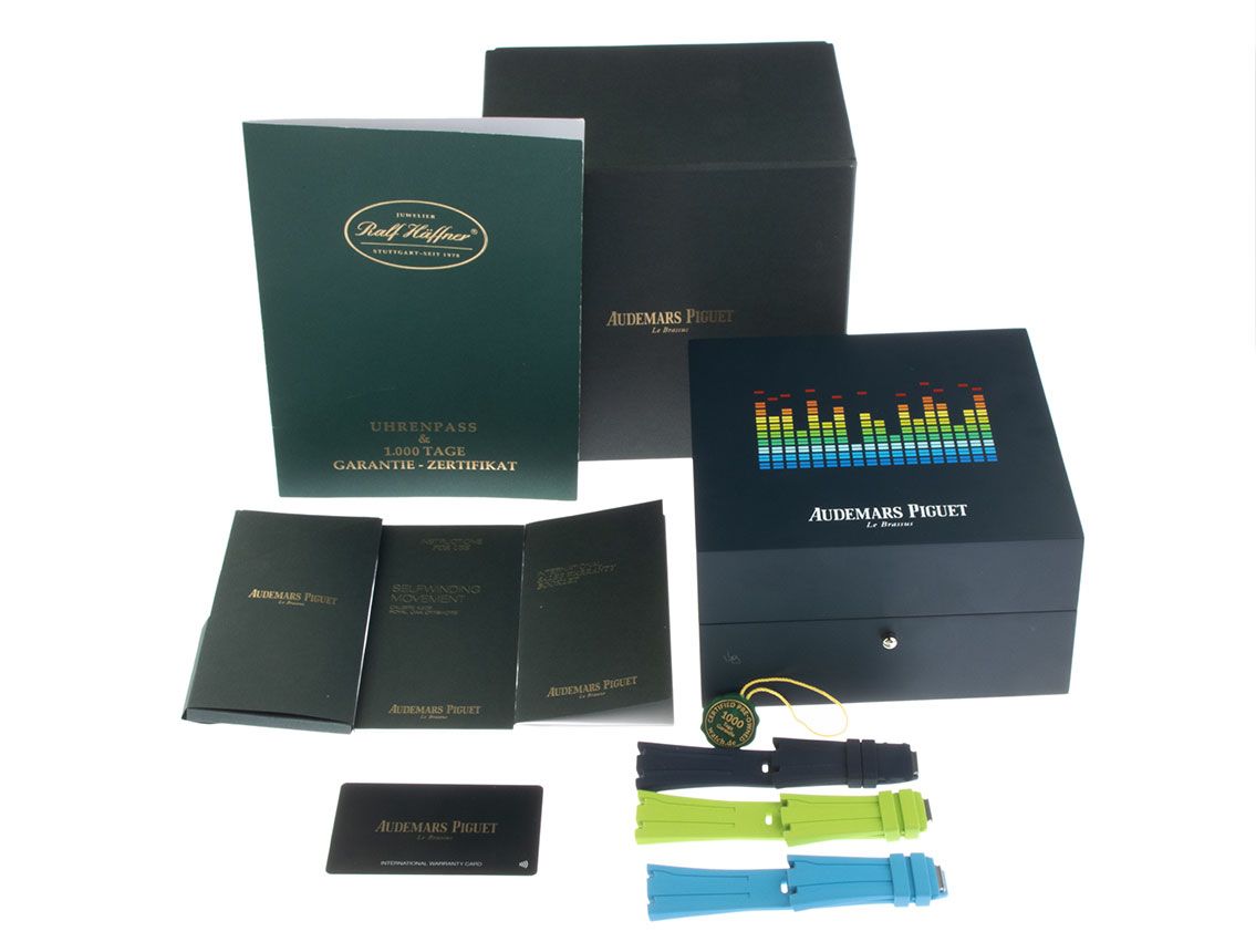 Gehäuse van gepolijst en gesatineerd titanium, Gehäusedurchmesser zonder kroon 43mm, Gehäusehöhe 14,4mm. Lünette van 8-hoekig titanium, 8-voudig geschroefd, gepolijst en gesatineerd met onderglas 60-minuten schaal. Audemars Piguet Armband van geel Kautschuk, met snelwisselfunctie, Anstoßbreite 29mm, stiftschließe van titanium met fabrikantlogo. Wijzerplaat in blauw met opgedrukte kleurrijke VU-schaal (Volume Unit) is een analoog meetinstrument voor het weergeven van de gemiddelde geluidssterkte, met opgezette indexen van witgoud en witgouden wijzers. Uurwerk Automatik, Audemars Piguet Manufakturkaliber 4309 met 32 edelstenen, gangreserve van ongeveer 70 uur. Weergave van uur, minuut en seconde via wijzers vanuit het midden met secondenstop voor een seconde-nauwkeurige instelling van de tijd. Saffierglas krasbestendig. Kroon 6-hoekig, geschroefd met flankbescherming en fabrikantlogo. Bodem van roestvrij staal 8-voudig geschroefd en gegraveerd met saffierglas kijkvenster. Gewicht van het horloge inclusief armband 133g. Referentienummer: 15600TI.OO.A343CA.01, ID: KB1832940000426H-62000/33900, Artikelnummer: 10000085395. Originele Audemars Piguet doos met omdoos en garantiepapieren van 2022, evenals beschrijving en 3 Kautschuk verwisselbare armbanden, Full Set. Gelimiteerd wereldwijd tot 500 exemplaren. Superscherpe aanbieding, investering met waardevermeerderingspotentieel, extreem zeldzaam verzamelobject, uit eerste hand, bijna niet gedragen. Origineel ongepolijst. Leveringstijd direct.