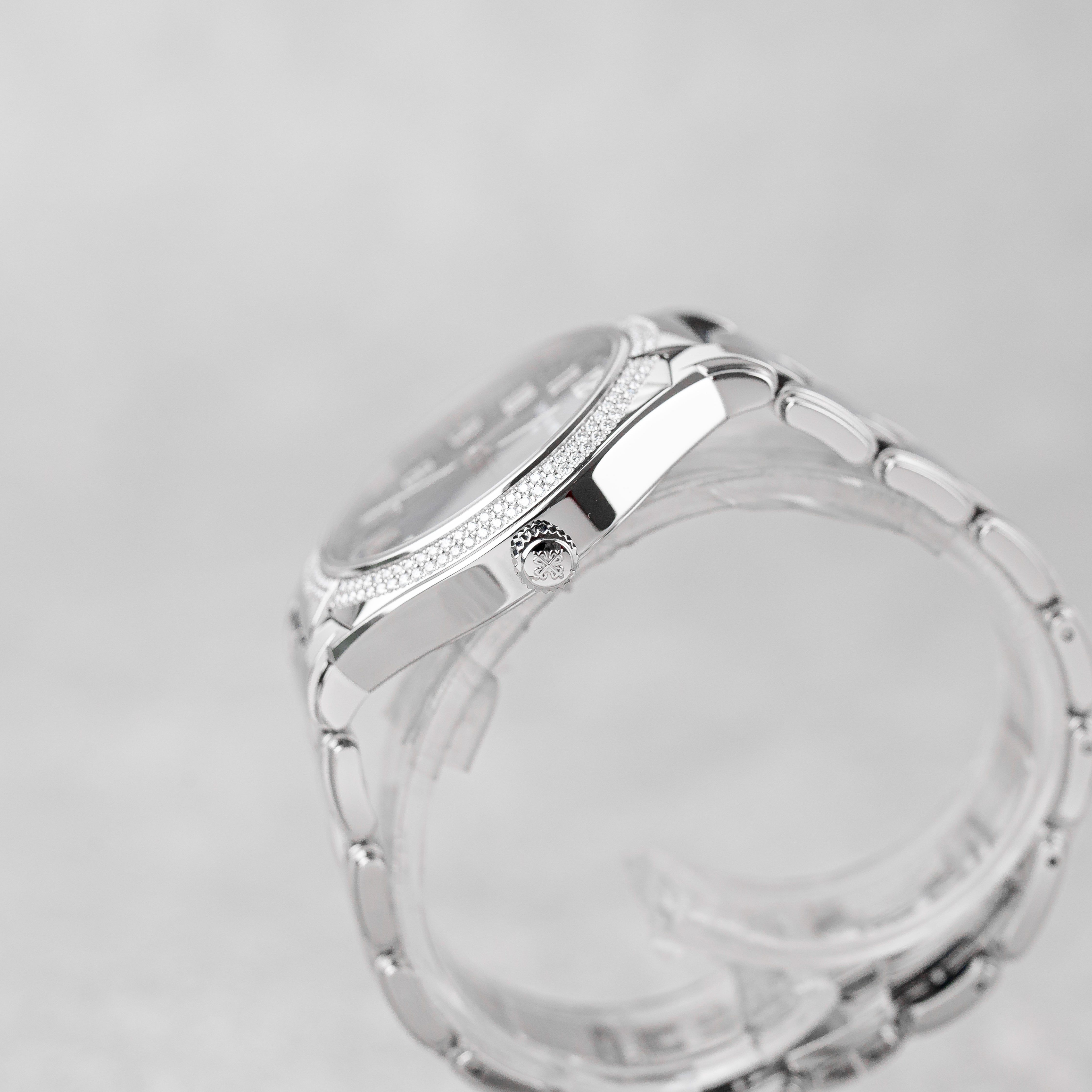 An elegant and contemporary ladies’ timepiece, this Patek Philippe Twenty~4 features a stunning sunburst blue dial set with diamond hour markers, housed in a refined stainless steel case with diamond-set bezel. Offered as a Full Set, this 2018 example is in very good condition and comes with full links. The watch has been inspected and is backed by 12 months of guarantee from us. A sophisticated and highly desirable Patek Philippe designed for everyday elegance.