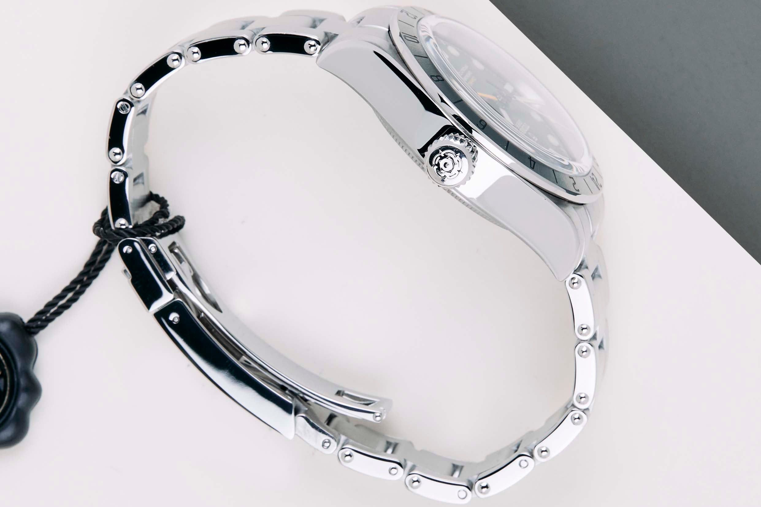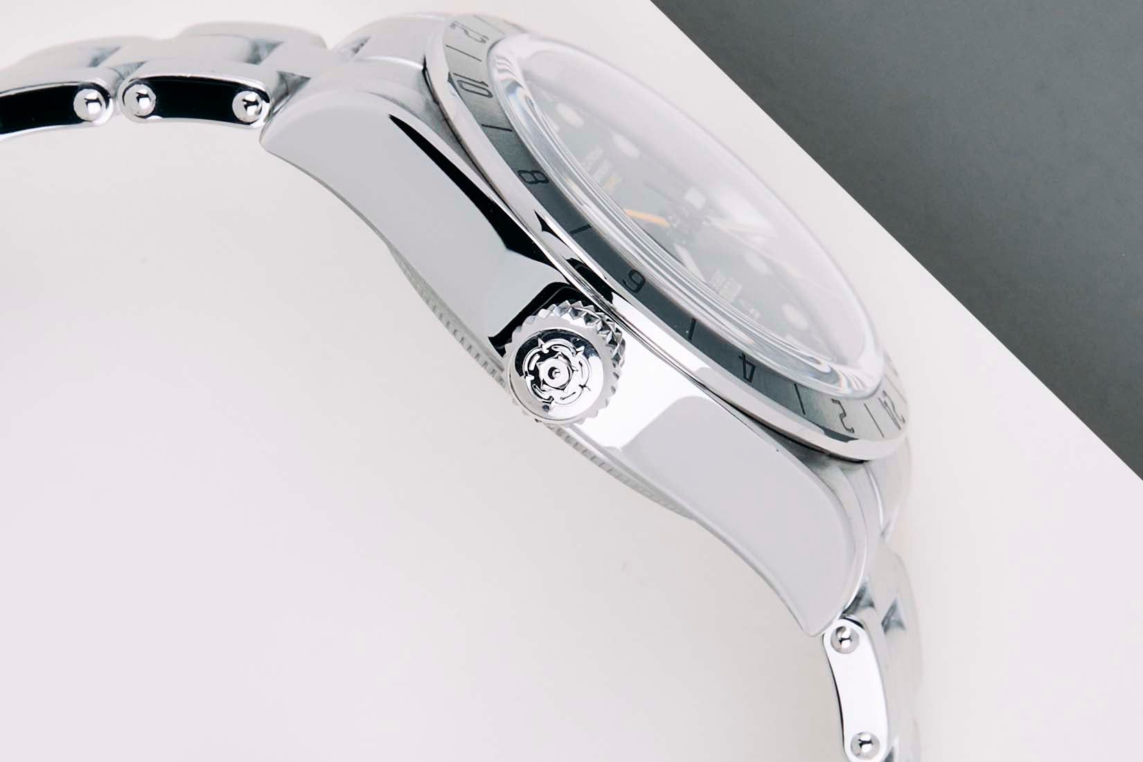 - Lichte gebruikssporen zoals haarlijntjes of kleine oppervlakkige krasjes. Kast, bezel en band behouden hun scherpe randen en oorspronkelijke vorm. Mogelijk professioneel gepolijst zonder de originele contouren aan te tasten. Mechanisch volledig functioneel.