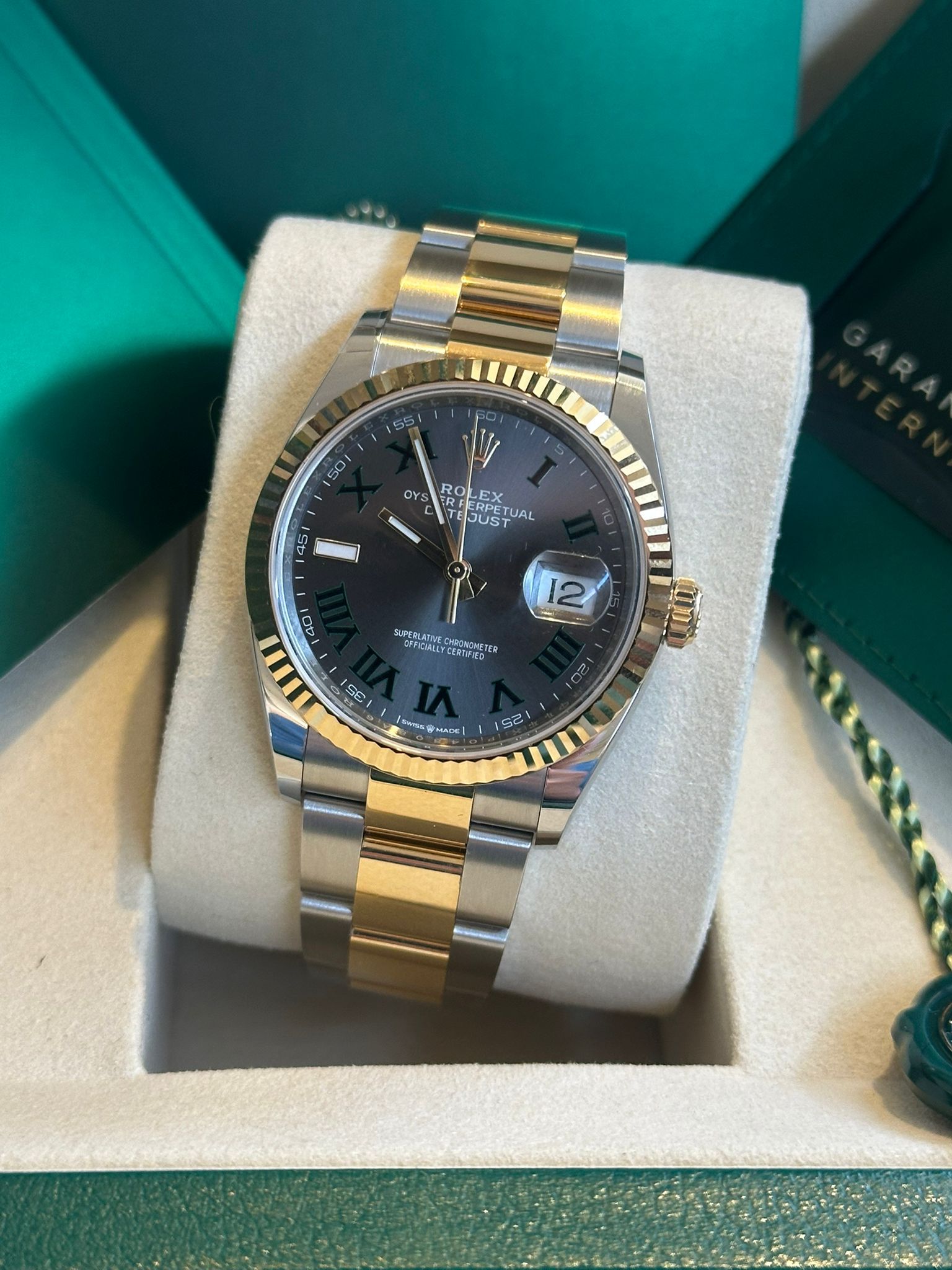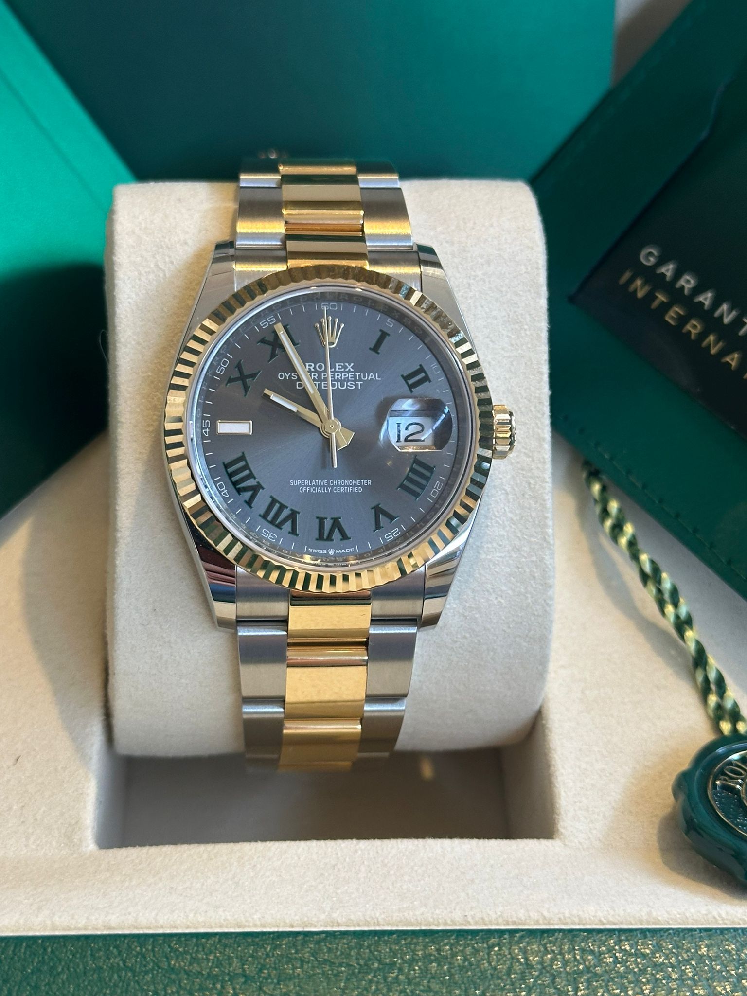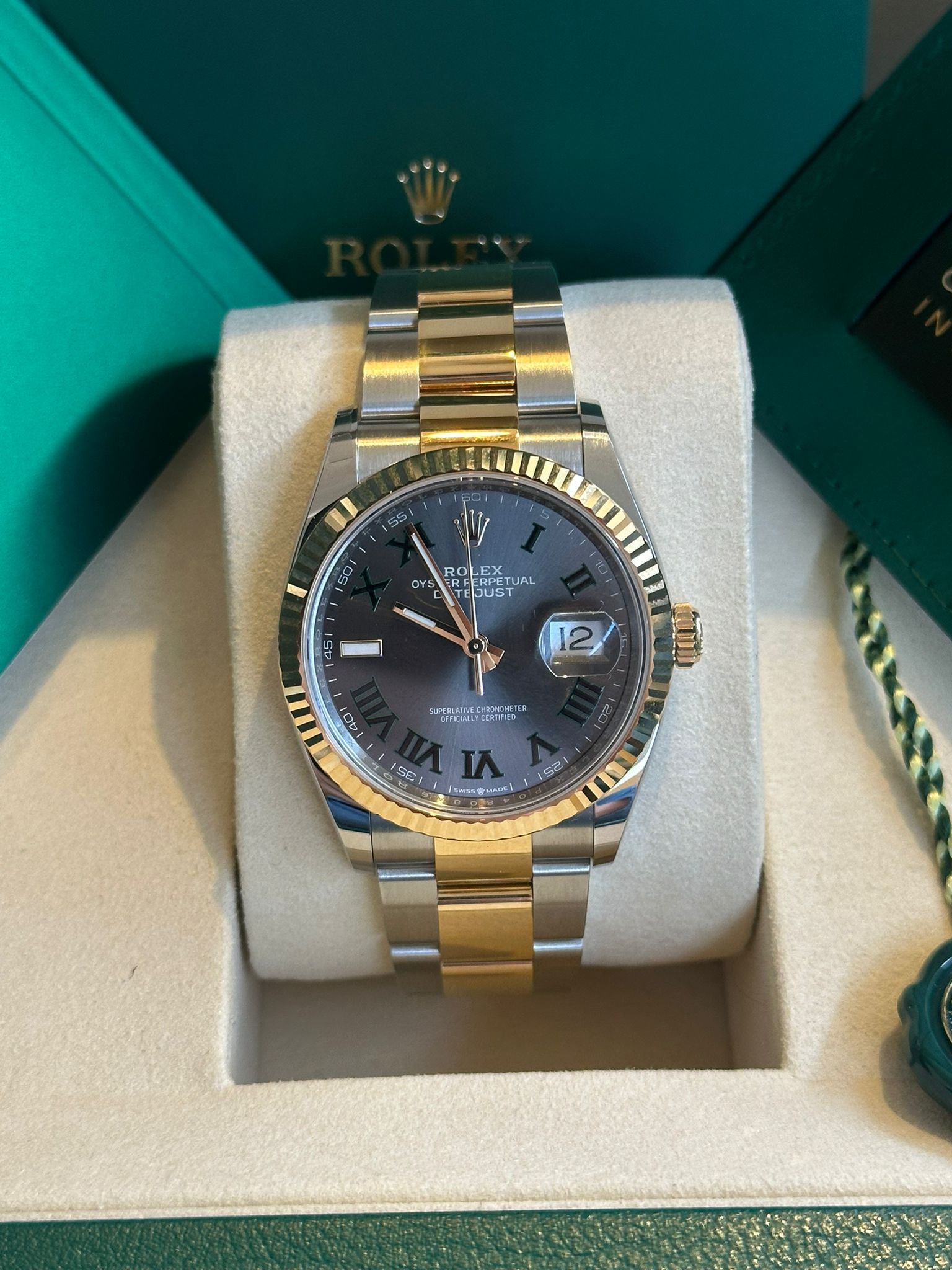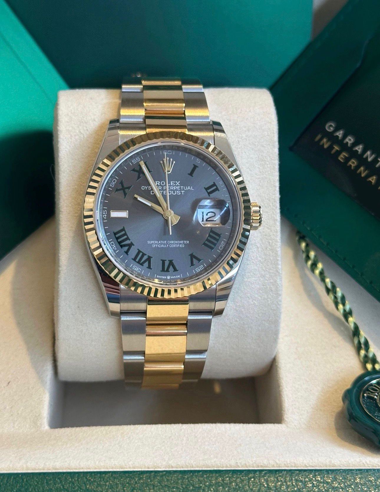 This iconic Rolex Datejust 36 ref. 126233 is presented with the elegant dial featuring Roman numerals and diamond-set hour markers—one of the most refined and sought-after configurations within the Datejust collection. The combination of the 36 mm Oyster case in Oystersteel and yellow gold, the distinguished yellow gold fluted bezel, and the sophisticated dial results in a perfectly balanced timepiece that embodies Rolex’s signature blend of luxury, precision, and timeless design.This example is offered in new condition and is dated 2026. The watch is powered by the Rolex in-house caliber 3235, celebrated for its exceptional precision, robustness, and approximately 70-hour power reserve, and naturally operates within Rolex Superlative Chronometer specifications.