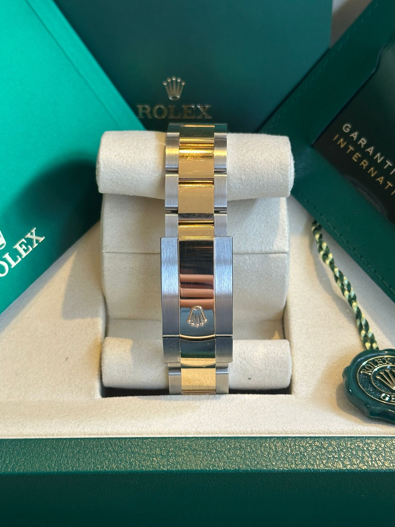 Dit exemplaar wordt aangeboden in nieuwe staat en is gedateerd 2026. Het horloge wordt aangedreven door het in-house kaliber 3235 van Rolex, dat beroemd is om zijn uitzonderlijke precisie, robuustheid en een gangreserve van ongeveer 70 uur, en opereert natuurlijk binnen de specificaties van de Rolex Superlative Chronometer.