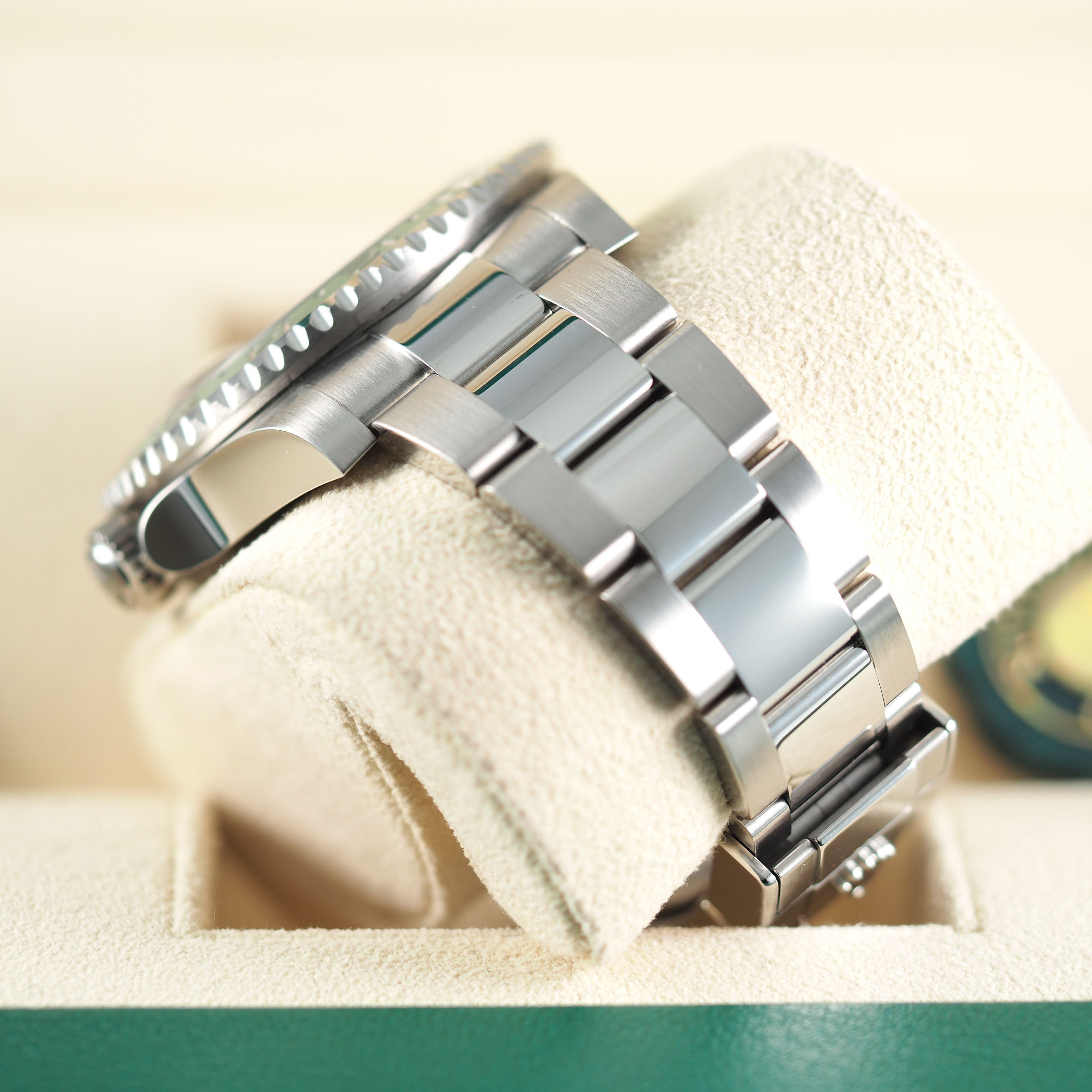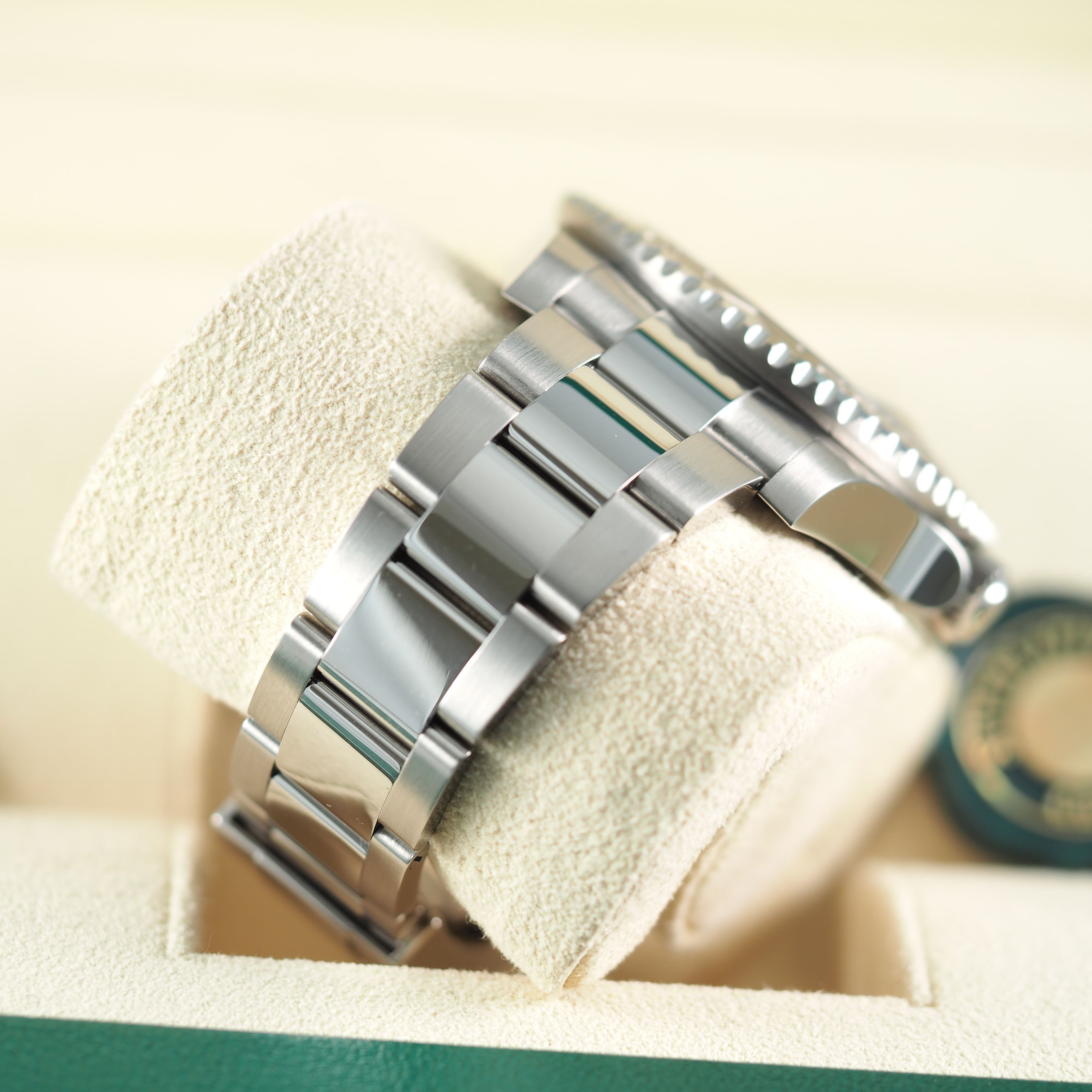 - Lichte gebruikssporen zoals haarlijntjes of kleine oppervlakkige krasjes. Kast, bezel en band behouden hun scherpe randen en oorspronkelijke vorm. Mogelijk professioneel gepolijst zonder de originele contouren aan te tasten. Mechanisch volledig functioneel.