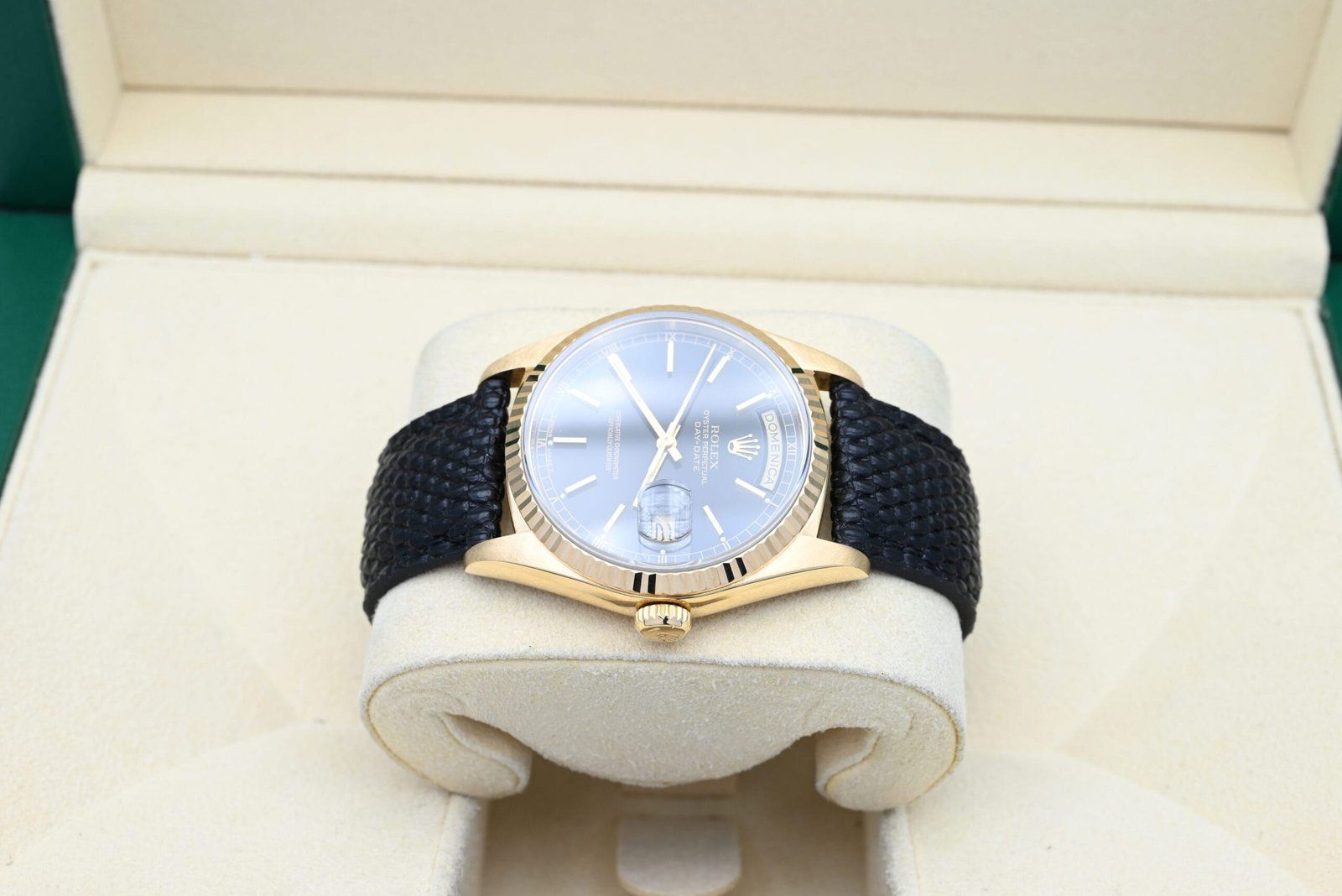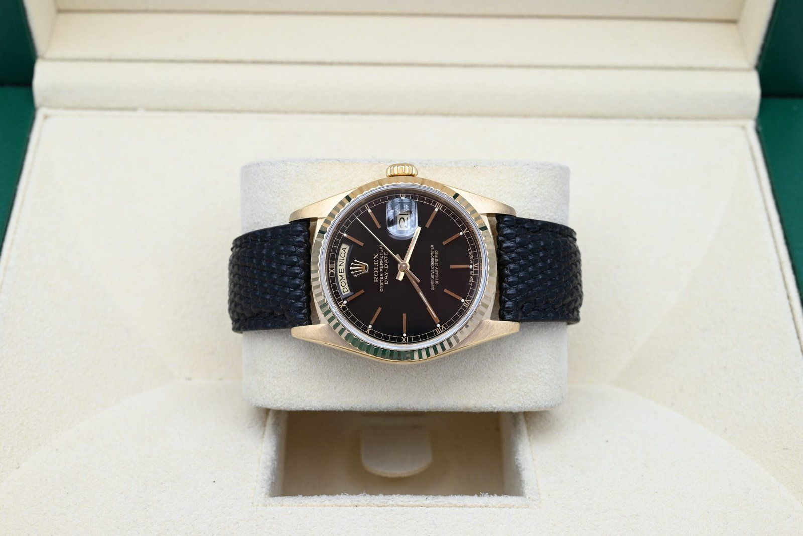Rolex Day-Date 18238 uit 1989 met de zwarte wijzerplaat in uitstekende staat, inclusief de originele doos en papieren. Al onze horloges zijn grondig gecontroleerd door onze eigen horlogemaker en waar nodig onderhouden.