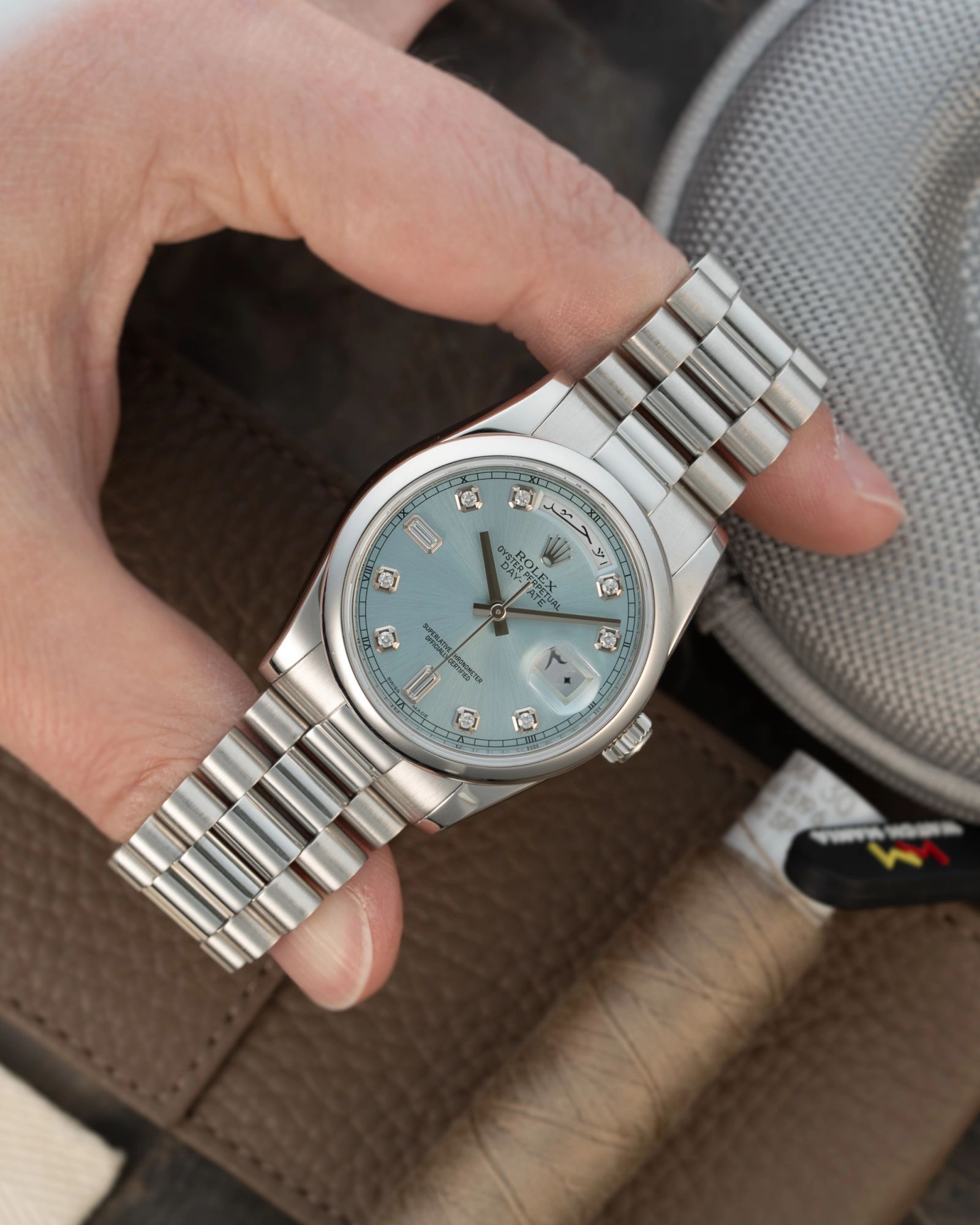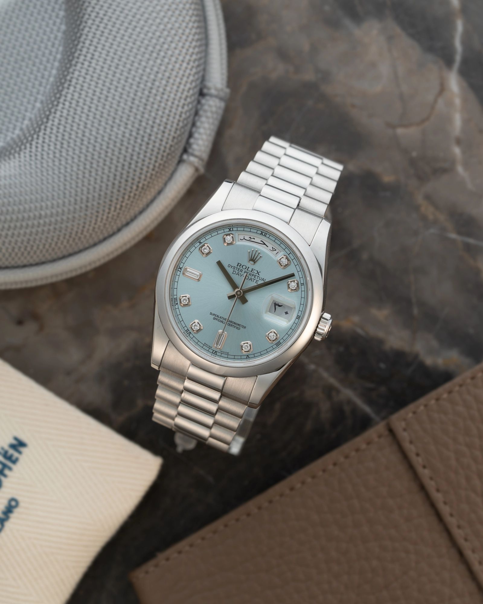 Discover true exclusivity with this exceptional Rolex 118206, crafted in solid platinum and presented with the iconic ice blue dial—reserved only for Rolex’s most prestigious metal. This piece is further elevated by factory-set diamond hour markers, offering a refined yet unmistakable presence on the wrist.Produced in 2009 and offered as a complete full set, this watch has been meticulously preserved and remains in excellent condition. What truly sets it apart is the highly sought-after Arabic day and date display, a rare configuration that significantly enhances its collectability and global appeal.