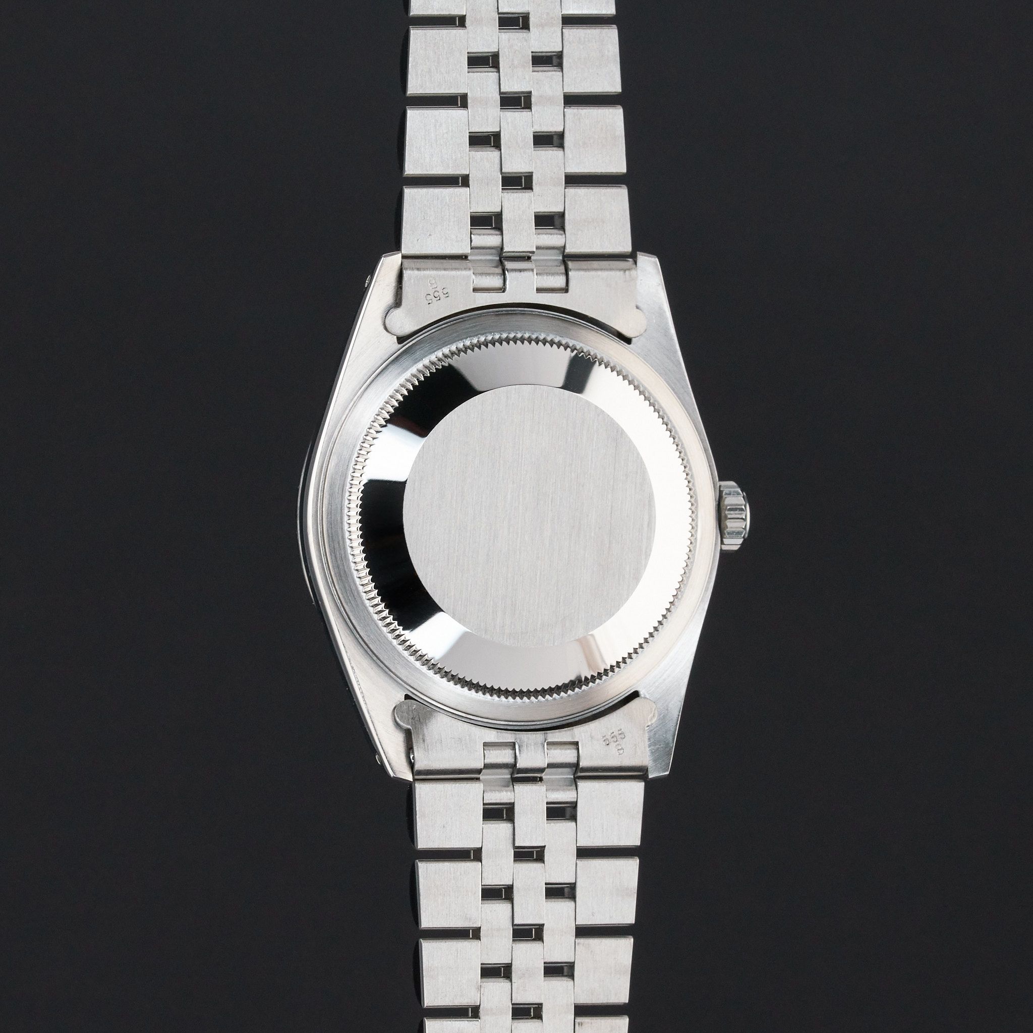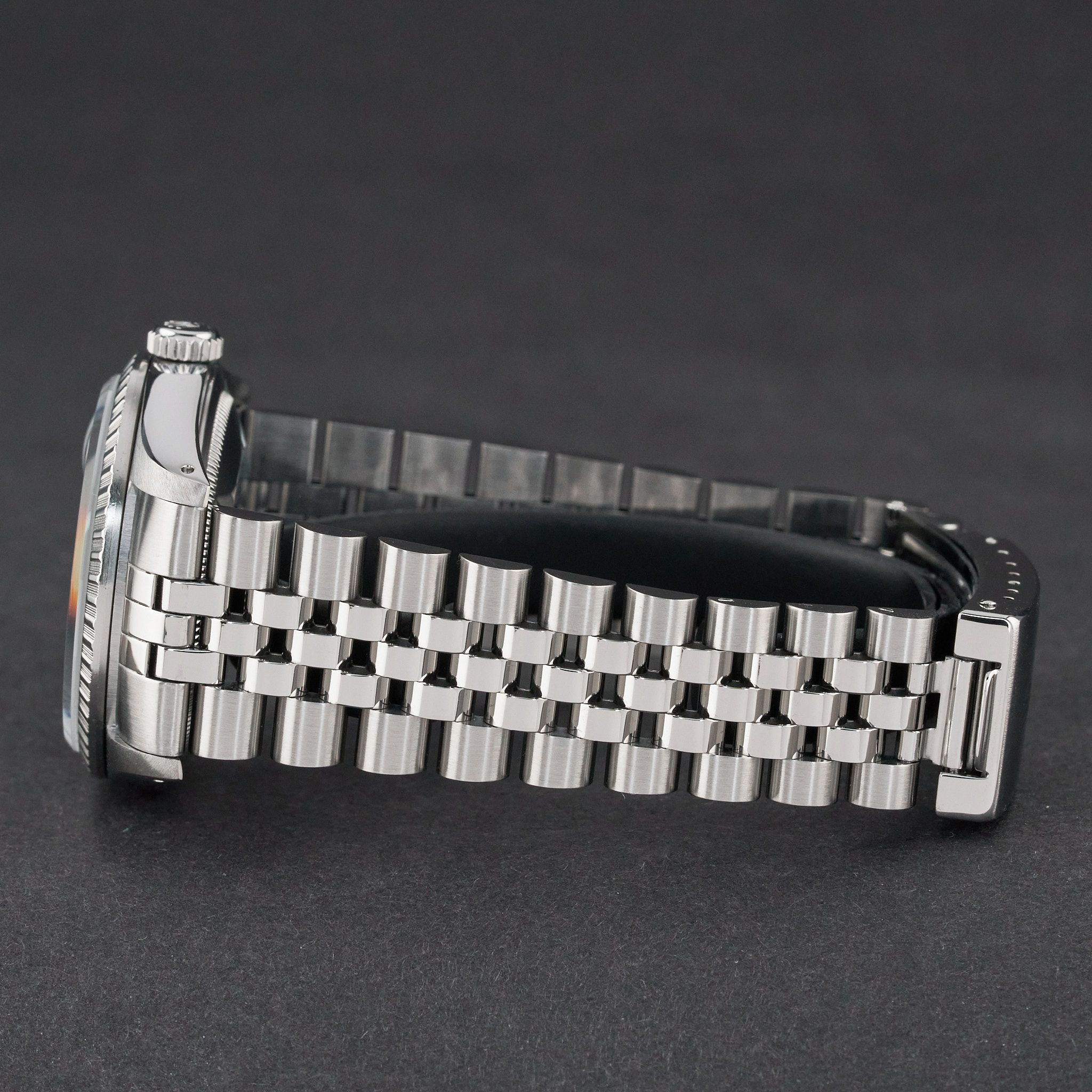 - Lichte gebruikssporen zoals haarlijntjes of kleine oppervlakkige krasjes. Kast, bezel en band behouden hun scherpe randen en oorspronkelijke vorm. Mogelijk professioneel gepolijst zonder de originele contouren aan te tasten. Mechanisch volledig functioneel.