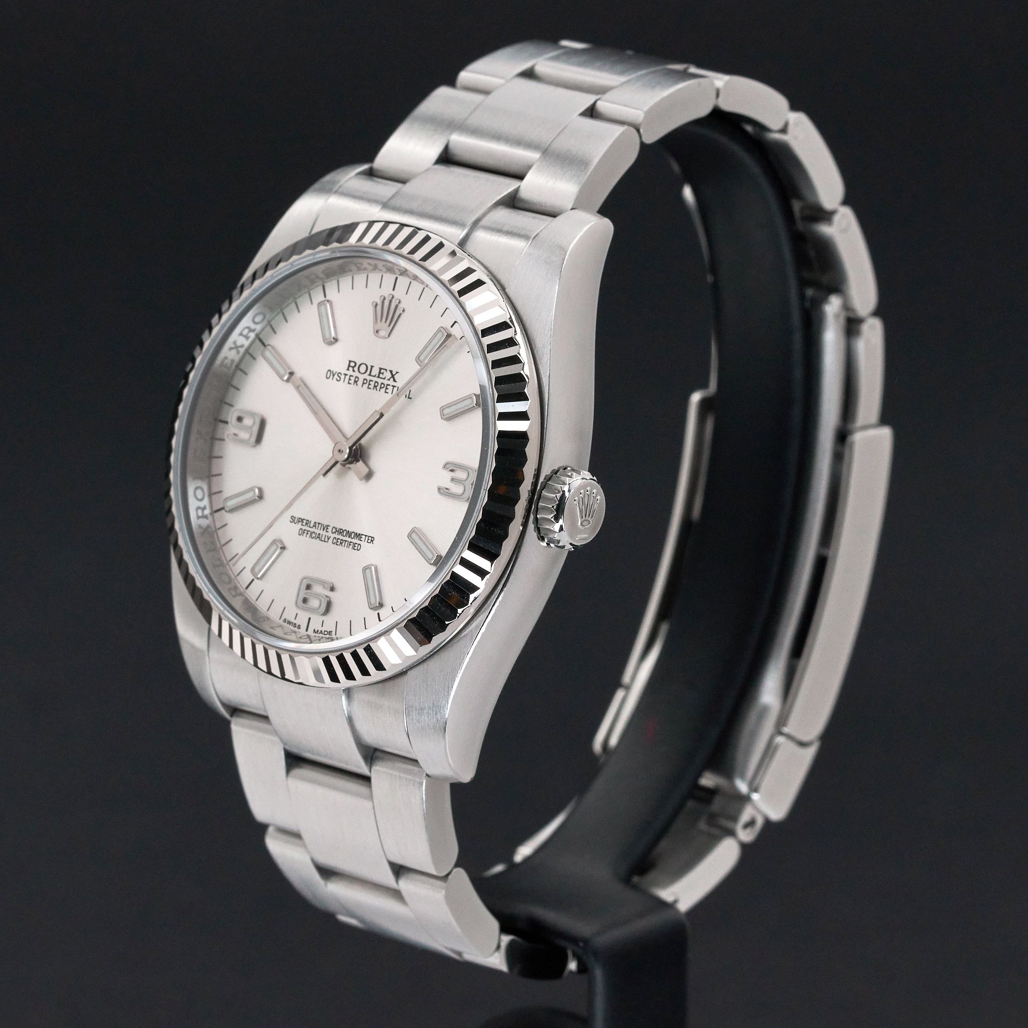 Deze Rolex Oyster Perpetual 116034 heeft een zilveren Arabische wijzerplaat en is gemaakt van roestvrij staal, met een productiejaar van 2014.