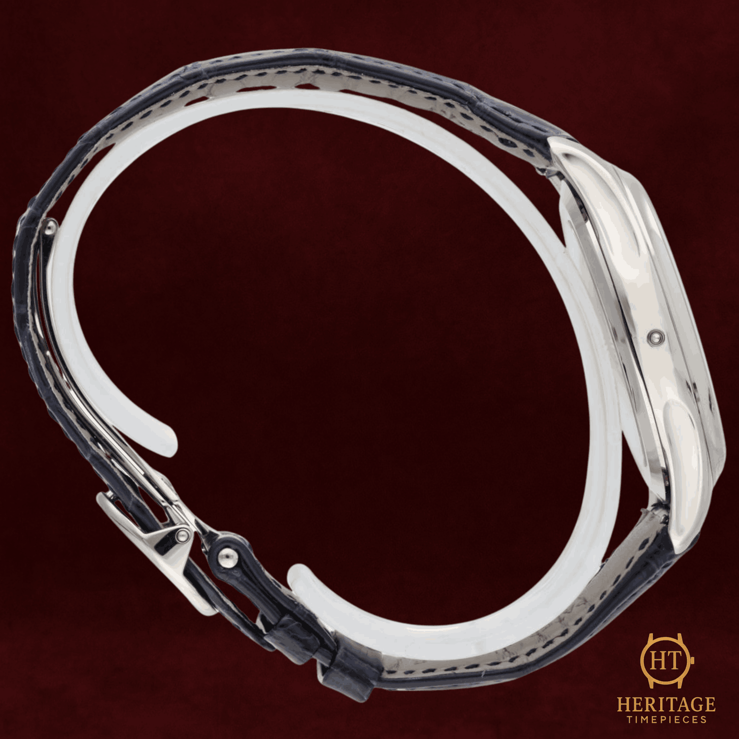 Heritage Narrative The Patek Philippe Grand Complications 5327G embodies the pinnacle of classical watchmaking, combining technical mastery with refined aesthetic harmony. A direct descendant of the celebrated references 3940 and 5140, this perpetual calendar represents the culmination of decades of evolution in one of Patek Philippe’s most iconic complications. Crafted from 18k white gold, the 39 mm case features elegant fluted lugs and a polished bezel, framing a sunburst blue lacquered dial adorned with applied Breguet numerals — a design that merges tradition with understated modernity. Powering the watch is the self-winding Calibre 240 Q, an ultra-thin movement equipped with a 22k gold micro-rotor and beautifully hand-finished bridges visible through the sapphire caseback. This 2021 example, offered brand new and complete with its full set, represents the essence of haute horlogerie — timeless, precise, and crafted to outlast generations. Technical Specifications Reference:5327G-001 Year:2021 Movement:Patek Philippe Calibre 240 Q, automatic, 27 jewels, 22k gold micro-rotor, perpetual calendar with day, date, month, leap year, and moon phase, 48-hour power reserve, Geneva Seal finishing Case:39 mm 18k white gold case, fluted lugs, sapphire crystal caseback Bezel:Fixed 18k white gold bezel, polished finish Crystal:Scratch-resistant sapphire crystal, front and back Dial / Hands:Blue sunburst lacquered dial with applied white gold Breguet numerals, leaf-shaped hands, perpetual calendar subdials Bracelet / Clasp:Blue alligator leather strap with 18k white gold folding clasp Water resistance:30 m / 100 ft (factory rating) Condition & Inclusions Overall grade:Brand new — factory-fresh, unworn condition Service status:Factory-new; under Patek Philippe international warranty Set:Full set — Patek Philippe presentation box, certificate, and booklets Shipping & Logistics Stored off-site and shipped fully insured within 1–3 business days. Worldwide shipping available; buyer responsible for any import duties or taxes. Shipping & Returns Complimentary insured worldwide shipping and a 14-day return window (watch must be returned in the same condition supplied). Every timepiece is authenticated, time-graphed, and prepared for secure transit. All shipments include full inspection before dispatch, professional packaging, and tracking updates throughout delivery. Returns are accepted within the 14-day period for store credit or refund, subject to condition verification upon receipt.