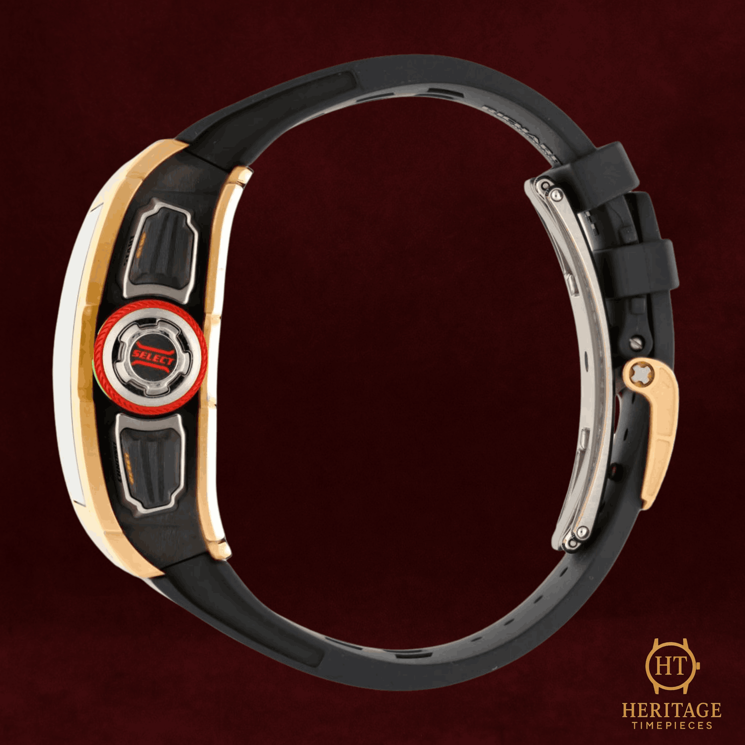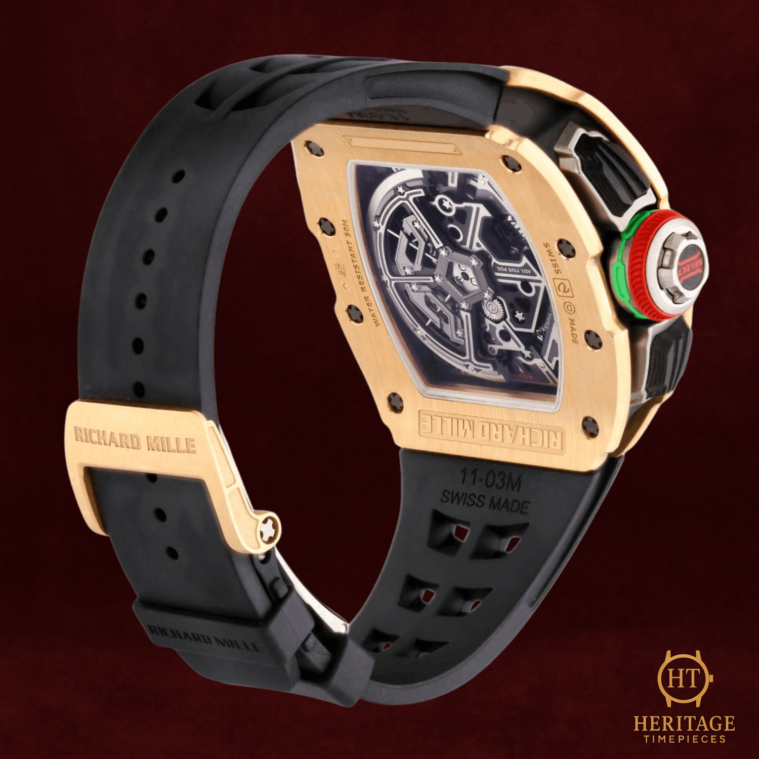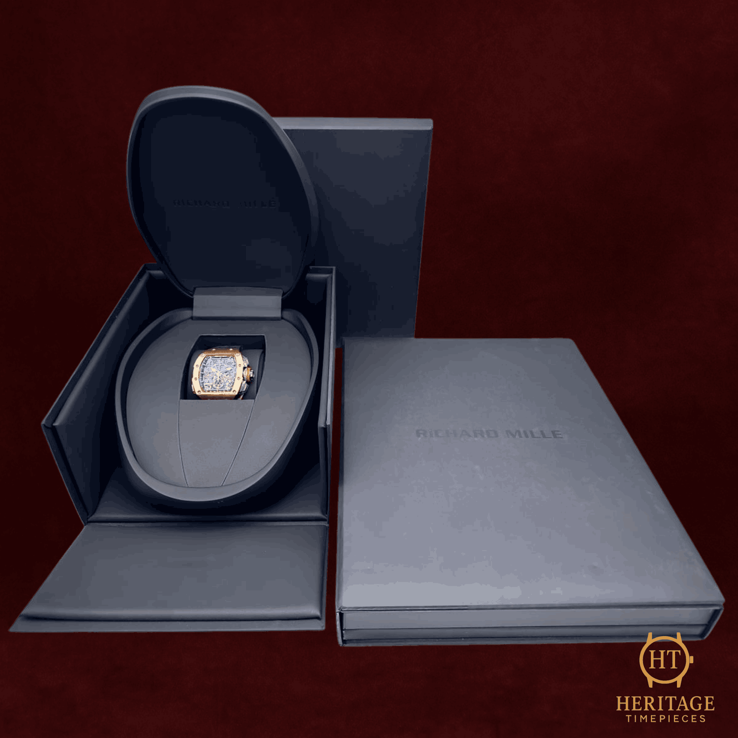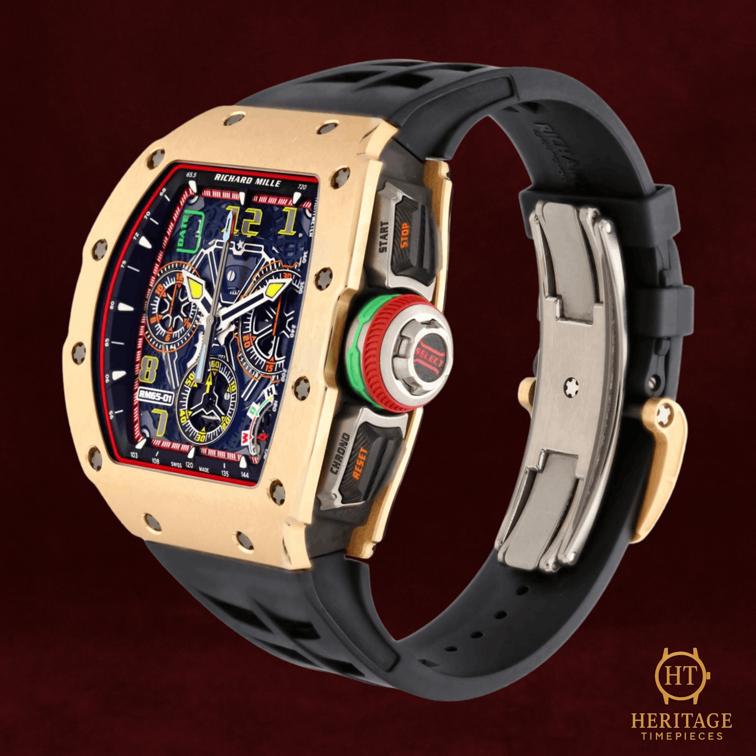 Heritage Narrative The Richard Mille RM65-01 represents one of the brand’s most technically ambitious chronographs, designed with a singular focus on extreme performance, shock resistance, and mechanical innovation. Unlike traditional haute horology chronographs built for elegance, the RM65-01 was engineered as a high-frequency, split-seconds chronograph capable of withstanding real-world forces well beyond conventional expectations. This 2021 example features a complex case construction combining 18k rose gold with titanium, a signature Richard Mille approach that balances luxury with structural integrity and weight reduction. The tonneau-shaped 44 mm case houses a fully skeletonized dial, offering a direct view into the movement’s layered architecture, racing-inspired components, and unmistakable RM aesthetic. At its core is the RMAC4 automatic split-seconds chronograph movement, operating at 36,000 vibrations per hour and delivering a 60-hour power reserve. Designed from the ground up for durability, it incorporates a rapid winding system and a function selector inspired by automotive gearboxes. The RM65-01 is not a decorative complication; it is a technical instrument expressed through radical design. Technical Specifications Reference:RM65-01 Year:2021 Movement:Richard Mille RMAC4 automatic split-seconds chronograph, high-frequency 36,000 vph, ~60-hour power reserve Case:44 mm tonneau-shaped case combining 18k rose gold and titanium Bezel:18k rose gold Crystal:Scratch-resistant sapphire crystal (front and back) Dial / Hands:Skeletonized transparent dial with Arabic numerals, luminous hands and indices Bracelet / Clasp:Black rubber strap with folding deployant clasp in rose gold and titanium Water resistance:50 m (manufacturer specification) Condition & Inclusions Overall grade:Pre-owned — excellent condition Service status:Movement tested and functioning correctly Set:Full set — Richard Mille presentation box, warranty card, and documentation Shipping & Logistics Stored off-site and shipped fully insured within 1–3 business days.Worldwide shipping available; buyer responsible for any import duties or taxes. Shipping & Returns Complimentary insured worldwide shipping and a 14-day return window (watch must be returned in the same condition supplied). Each timepiece is authenticated, time-tested, and professionally prepared prior to dispatch. All shipments include secure packaging, tracking, and full insurance coverage.
