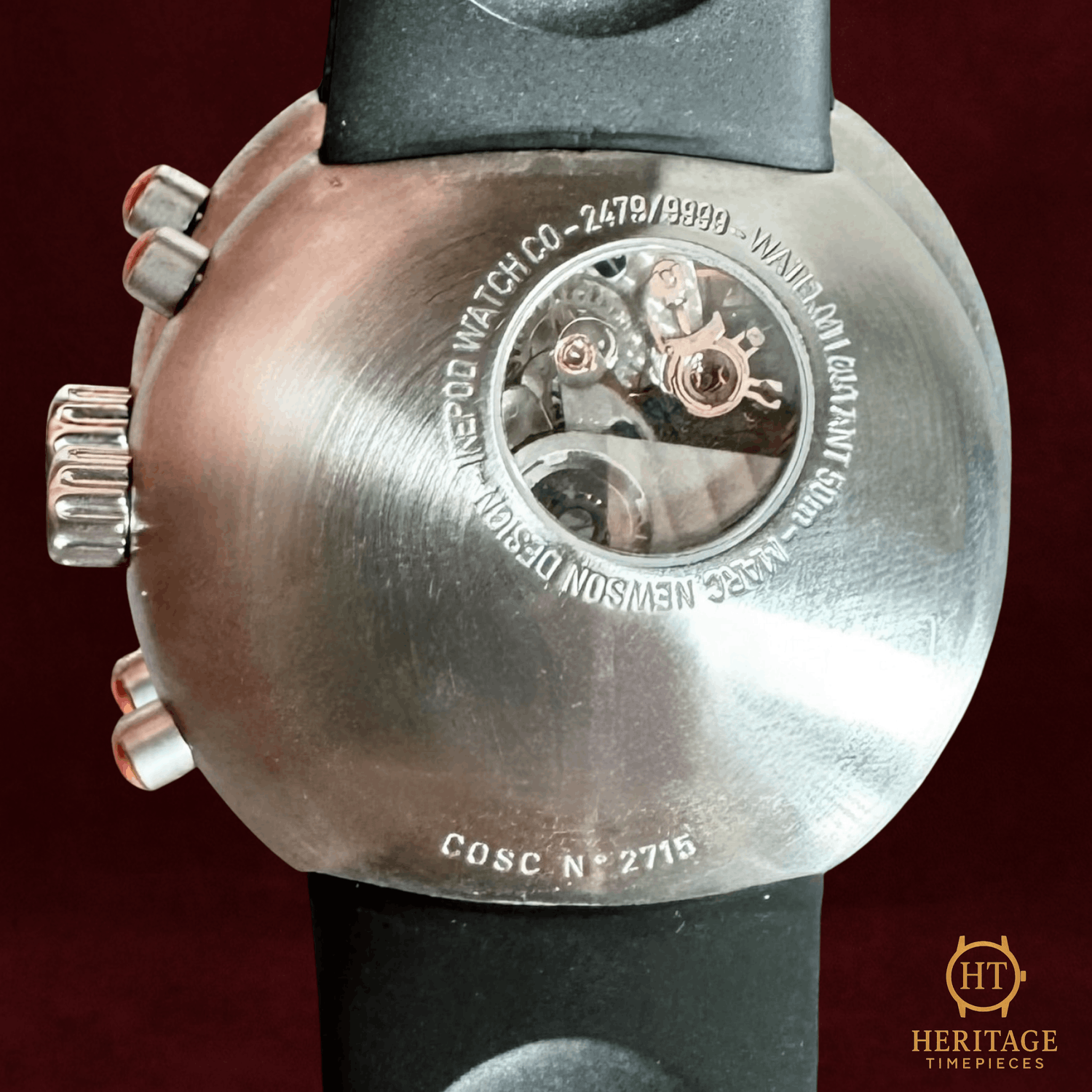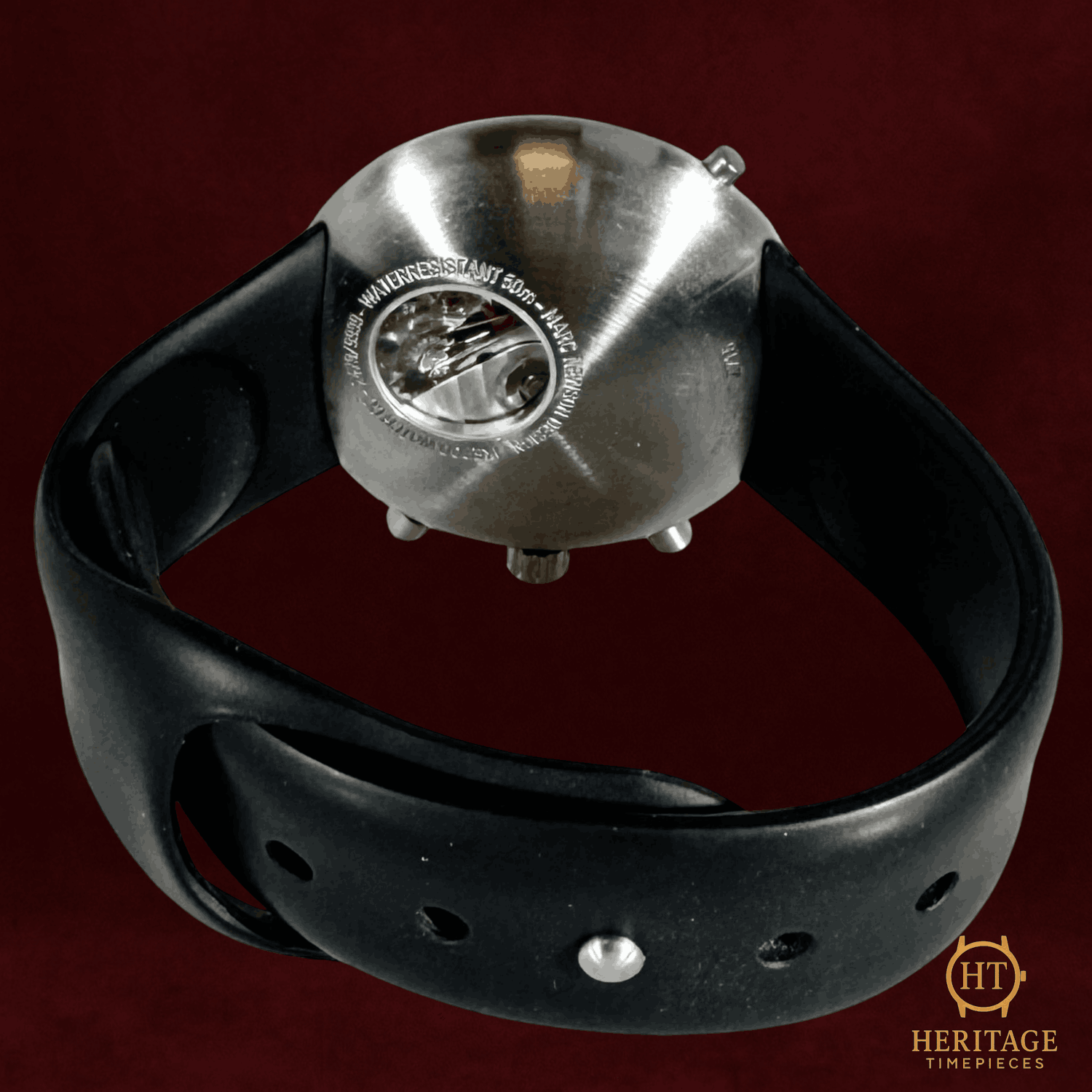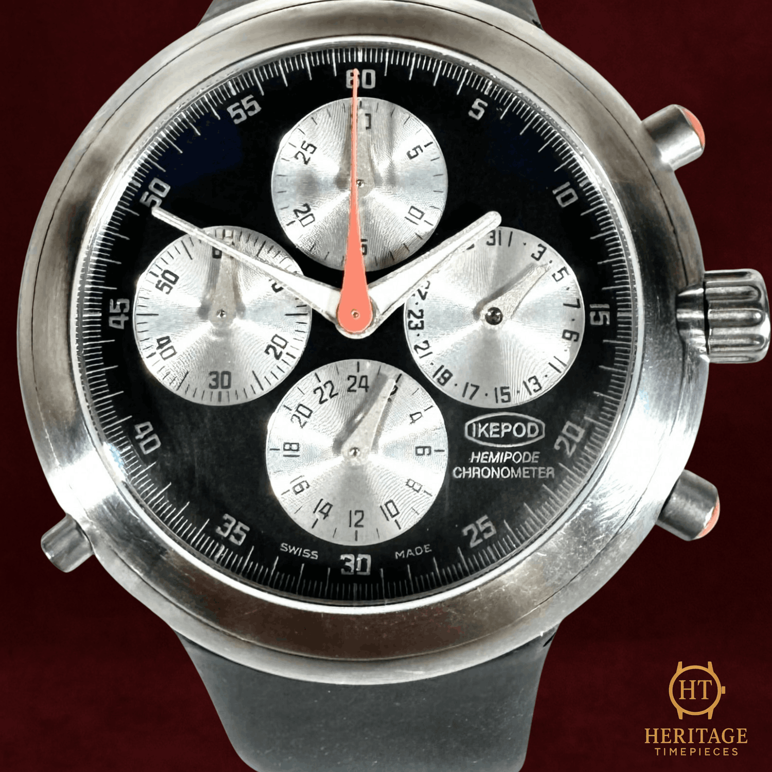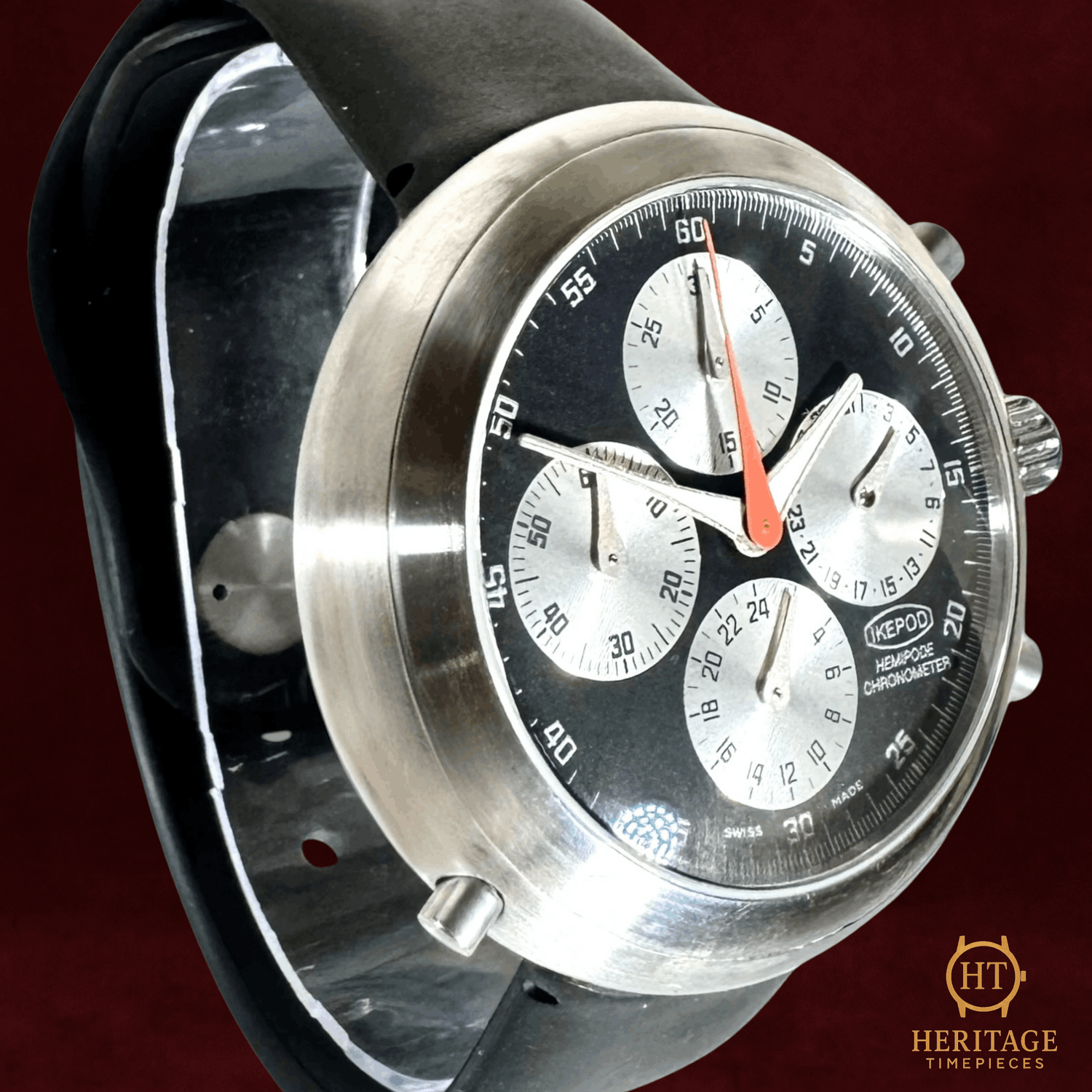 Heritage Narrative Ikepod occupies a very specific corner of modern watch history. Founded in the 1990s by Marc Newson, one of the most influential industrial designers of the modern era, Ikepod watches rejected traditional Swiss aesthetics in favor of pure, sculptural form. The Hemipode line is the clearest expression of that philosophy. The Hemipode Chronometer H01 is defined by its bold, organic case shape and minimalist dial design. At 44 mm, the watch was deliberately oversized for its era, anticipating the large-watch trend that would dominate the following decade. The smooth, pebble-like stainless steel case eliminates sharp angles entirely, making the watch wear smaller than its dimensions suggest while remaining visually striking. The black dial is a masterclass in restraint. Clean typography, uncluttered sub-dials, and balanced proportions reflect Newson’s industrial design roots rather than classical watchmaking traditions. Inside, the automatic chronometer-rated movement delivers serious mechanical credibility beneath the avant-garde exterior. Today, early Ikepod models like the Hemipode are increasingly sought after by collectors who appreciate design-led watchmaking and late-1990s experimentation. This is not a conservative watch. It never was. That is precisely the point. Technical Specifications Reference:H01 Year:2000 Movement:Automatic chronometer-certified movement with chronograph function Complications:Chronograph with minute and hour counters, running seconds subdial, stopwatch function Case:44 mm stainless steel case Crystal:Scratch-resistant sapphire crystal Dial / Hands:Black Ikepod chronograph dial with minimalist typography and original markers Bracelet / Strap:Black rubber strap Water resistance:Not specified by manufacturer Condition & Inclusions Overall grade:Pre-owned — excellent condition Service status:Movement functioning correctly Set:Original box, certificate, and booklet included Shipping & Logistics Stored off-site and shipped fully insured within 1–3 business days.Worldwide shipping available; buyer responsible for any import duties or taxes. Shipping & Returns Complimentary insured worldwide shipping and a 14-day return window (watch must be returned in the same condition supplied). Each timepiece is authenticated, time-tested, and professionally prepared prior to dispatch. All shipments include secure packaging, tracking, and full insurance coverage.
