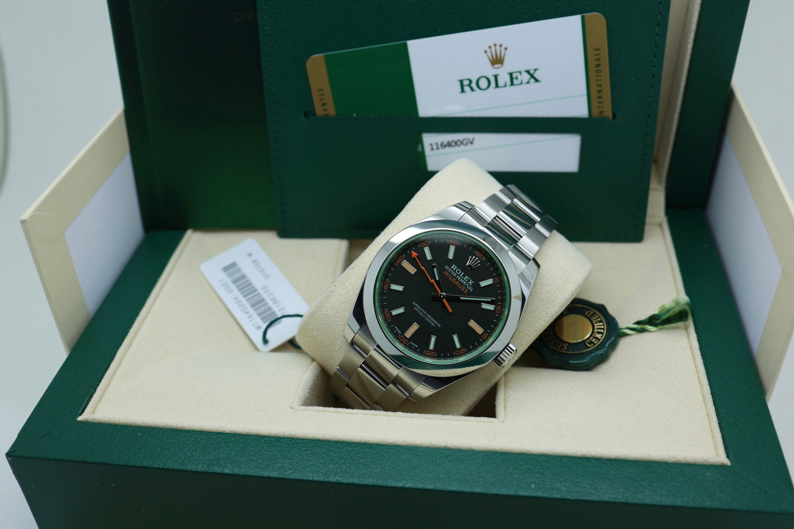 Rolex Milgauss 116400GV (2020) – Full Set, New Old StockDiscover a true modern classic with this Rolex Milgauss 116400GV, offered as a full set from 2020 and preserved in New Old Stock (NOS) condition. Discontinued and increasingly sought-after, the Milgauss stands apart within the Rolex lineup thanks to its unique blend of scientific heritage and bold design. The 40 mm Oystersteel case ensures durability, while the signature green sapphire crystal (GV) adds a distinctive and collectible edge exclusive to this reference.