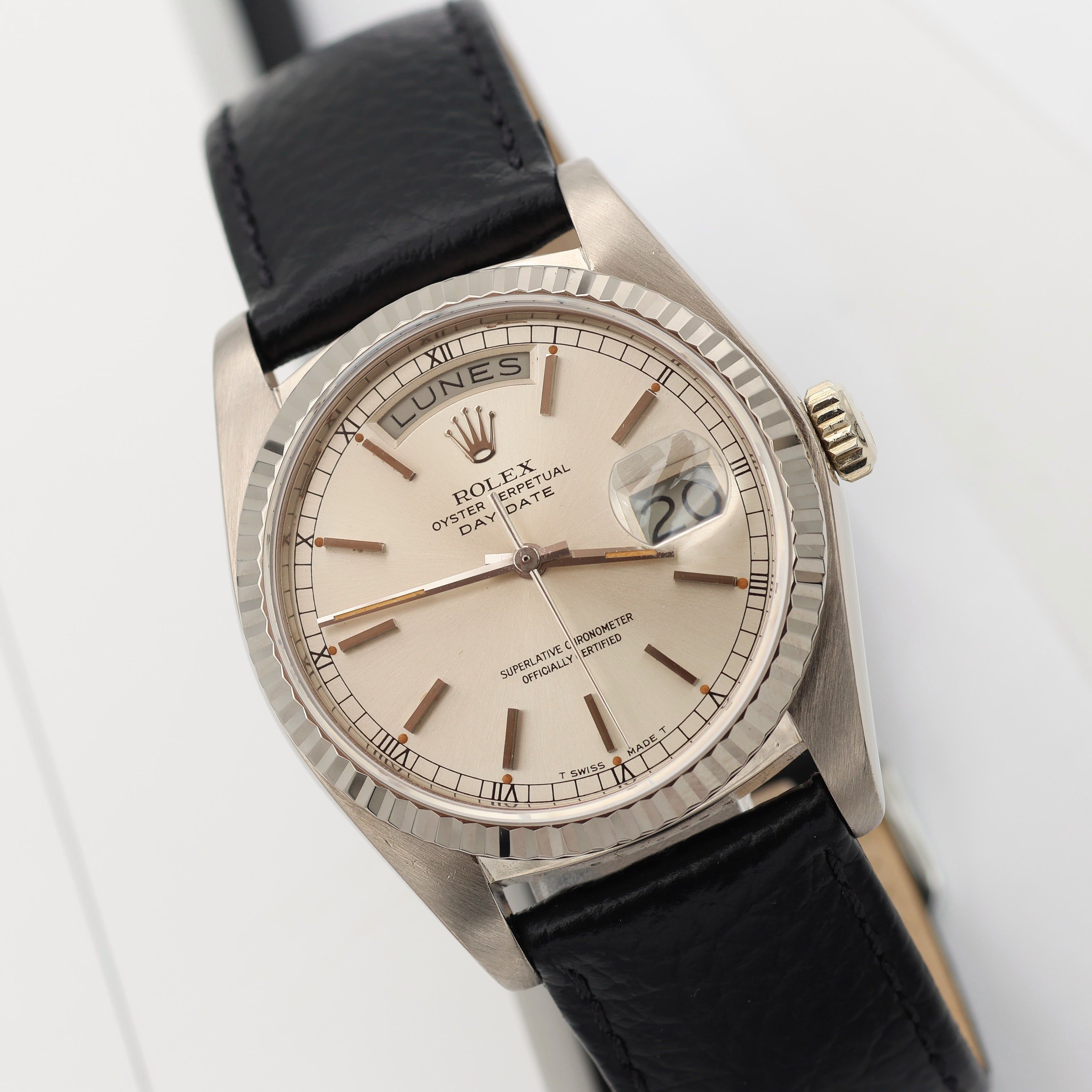 For sale at Debonar Watches: pre-owned Rolex Day-Date 36 ref. 18039 with an elegant silver dial, on a generic leather strap. The Rolex Day-Date 18039 is a refined expression of prestige and technical mastery, crafted for those who appreciate understated luxury. Introduced in the late 1970s, this reference elevates the iconic Day-Date line with its elegant use of 18k white gold—offering a more discreet alternative to the traditional yellow gold models while retaining the same unmistakable presence. Housed in a 36mm Oyster case, the 18039 features Rolex’s signature fluted bezel, which catches the light with subtle brilliance. The dial, in classic silver, displays the hallmark day aperture at 12 o’clock and date window at 3 o’clock, both enhanced by the brand’s legendary legibility. At its heart beats the automatic Rolex Caliber 3055, a robust and precise movement that introduced the quickset date function, allowing for convenient adjustment. Paired with a soft leather strap, the watch offers exceptional comfort alongside its stately aesthetic. The Day-Date 18039 is more than a timepiece; it is a symbol of achievement and quiet confidence. Its white gold construction lends it a subtle sophistication, making it equally suited for formal occasions or daily wear by those who prefer elegance without excess. BRAND ROLEX MODEL DAY-DATE 36 REFERENCE 18039 CASE MATERIAL GOLD MOVEMENT AUTOMATIC DIMENSION 36 MM DIAL SILVER BEZEL GOLD CRYSTAL SAPPHIRE BRACELET TYPE STRAP (GENERIC) BRACELET MATERIAL LEATHER WRIST DIAMETER 19 CM ORIGINAL BOX NO ORIGINAL PAPERS NO YEAR APPROX. THE END OF '80s CONDITION VERY GOOD