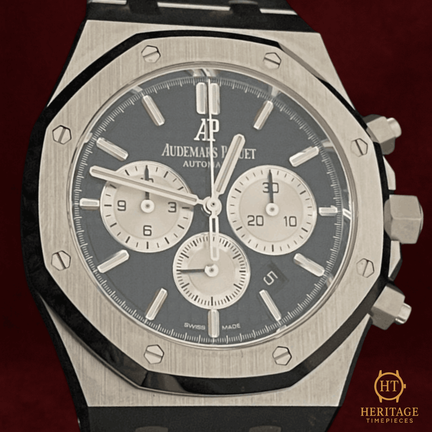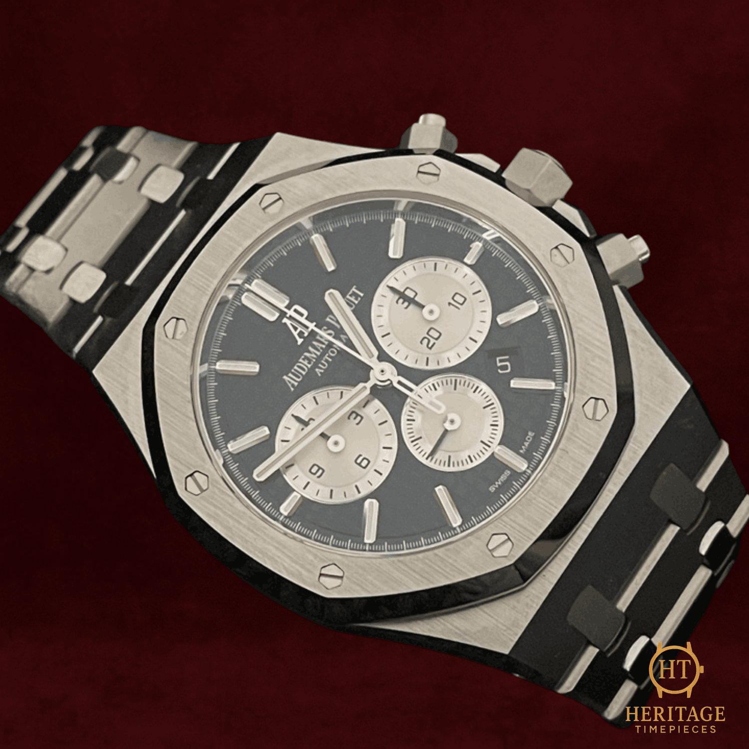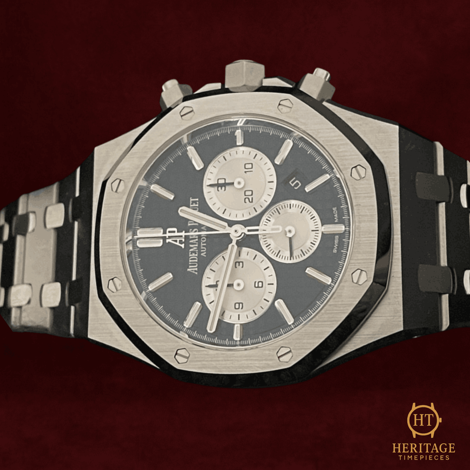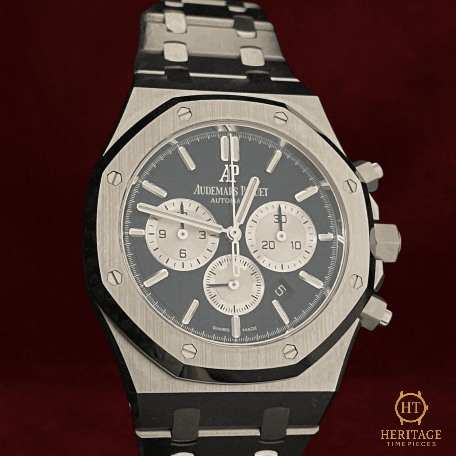 Heritage Narrative The Audemars Piguet Royal Oak Chronograph reference 26331ST represents a modern evolution of Gérald Genta’s iconic Royal Oak design. Combining the signature octagonal case and integrated bracelet with a sporty chronograph layout, it balances high-end finishing with everyday wearability in a distinctly contemporary format. Technical Specifications Reference:26331ST.OO.1200ST.02 Year:February 2018 Movement:Automatic chronograph movement Case:41 mm stainless steel case Bezel:Fixed octagonal bezel in stainless steel Crystal:Scratch-resistant sapphire crystal Dial / Hands:Black dial with chronograph subdials and luminous markers Bracelet / Clasp:Integrated stainless steel bracelet with folding clasp Water resistance:50 m (manufacturer specification) Condition & Inclusions Overall grade:Pre-owned — excellent condition Service status:Movement tested and functioning correctly Set:Full set — original box and warranty card Shipping & Logistics Stored off-site and shipped fully insured within 1–3 business days.Worldwide shipping available; buyer responsible for any import duties or taxes. Shipping & Returns Complimentary insured worldwide shipping and a 14-day return window (watch must be returned in the same condition supplied). Each timepiece is authenticated, time-tested, and professionally prepared prior to dispatch. All shipments include secure packaging, tracking, and full insurance coverage.
